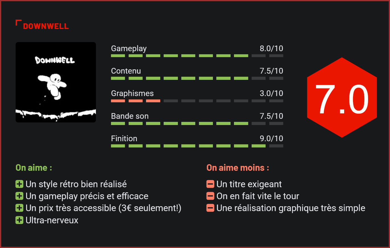 L’équipe derrière le titre indépendant Spelunky vient de sortir sa dernière production. Édité par Devolver Digital, Downwell s’inspire des rogue-like 2D de l’ère de la GameBoy. Downwell est un jeu de plate-forme au concept simple et atypique. Il consiste à devoir survivre le plus longtemps possible au cours d’une chute sans fin dans un puits. Les bottes-pistolets dont le personnage est équipé sont d’autant plus utiles pour en maîtriser la chute. Cette arme originale est d’autant plus utile pour venir à bouts des monstres peuplant ce puits infini. D’ailleurs, il est également possible de les vaincre en sautant sur la tête de certains types d’ennemis. Un classique pour un jeu de plate-forme rétro. Avec un gameplay des plus simples, Downwell possède également des mécaniques très rogue-like. Il faut comprendre par là que lors de chaque nouvelle partie, les différents étages du puits sont générés de manière aléatoire. Le jeu n’a donc techniquement pas de fin, même s’il existe tout de même un fil conducteur sous la forme d’une barre d’expérience. Ces points d’expérience sont récoltés selon les exploits effectués pendant le jeu. Lors de chaque niveau, cela débloquera du nouveau contenu afin de pouvoir aller de plus en plus loin. Le titre de Devolver Digital exploite une formule très classique et cette décision s’étend même jusqu’au style graphique du jeu. C’est ainsi que Downwell reprend un style graphique tout en pixel art et arbore des graphismes très minimalistes et très rétro. Ce style 8-bit s’avère être, de base, très austère. Il ne s’agit, dans un premier temps, que de pixels blancs et rouges sur fond noir. Ce choix s’avère être finalement assez ingénieux, puisqu’il permet d’identifier la dangerosité des ennemis rencontrés. Au bout de plusieurs parties, il devient possible de pouvoir débloquer et sélectionner de nouveaux styles de couleurs. Il est donc possible de faire son choix parmi plusieurs une palette assez variée de styles différents. Chaque style arbore des couleurs diverses et variées en étant même parfois inspirées de consoles d’antan. Il est par exemple possible de retrouver un style inspiré du Virtual Boy de Nintendo. Malgré tout, le style initial, pourtant très austère s’avère être le plus adapté à l’expérience que réserve Downwell. Le sound design a également bénéficié d’une attention toute particulière. Puisque les sons de Downwell permettent de pouvoir facilement situer la situation de notre chargeur. Assimilable à une jauge d’énergie, elle est définie par le type d’arme de nos bottes-pistolets. Étant notre moyen de défense de prédilection, il est primordial de savoir s’il nous reste encore des munitions. Cette décision de conception est donc très avisée. D’un autre côté, la bande-son est très fidèle à ce que l’on pourrait attendre d’un jeu rétro. Elle colle parfaitement au titre de Devolver et permet de retrouver des ambiances dignes de consoles vintage. Conclusion Volontairement simpliste, tant dans son gameplay que de sa réalisation graphique, Downwell est une véritable bouffée d’air frais sur Switch. Avec ses mécanismes de jeu old-school, le titre de Devolver Digital rend brillamment hommage à la console qui l’a inspiré : le Gameboy. Contrairement aux autres rogue-like, il n’est pas trop frustrant ni trop pénible de devoir reprendre systématiquement sa descente depuis le début. Le jeu possède une bonne durée de vie puisqu’il n’est pas si aisé de pouvoir arriver jusqu’aux dernières strates de ce puits infernal. Cela exigera d’ailleurs une certaine agilité doublée d’une bonne dose de patience. Compte tenu du prix minuscule demandé, qui tourne autour des 3€, Downwell saura satisfaire les plus audacieux qui voudront se lancer dans cette chute sans fin.