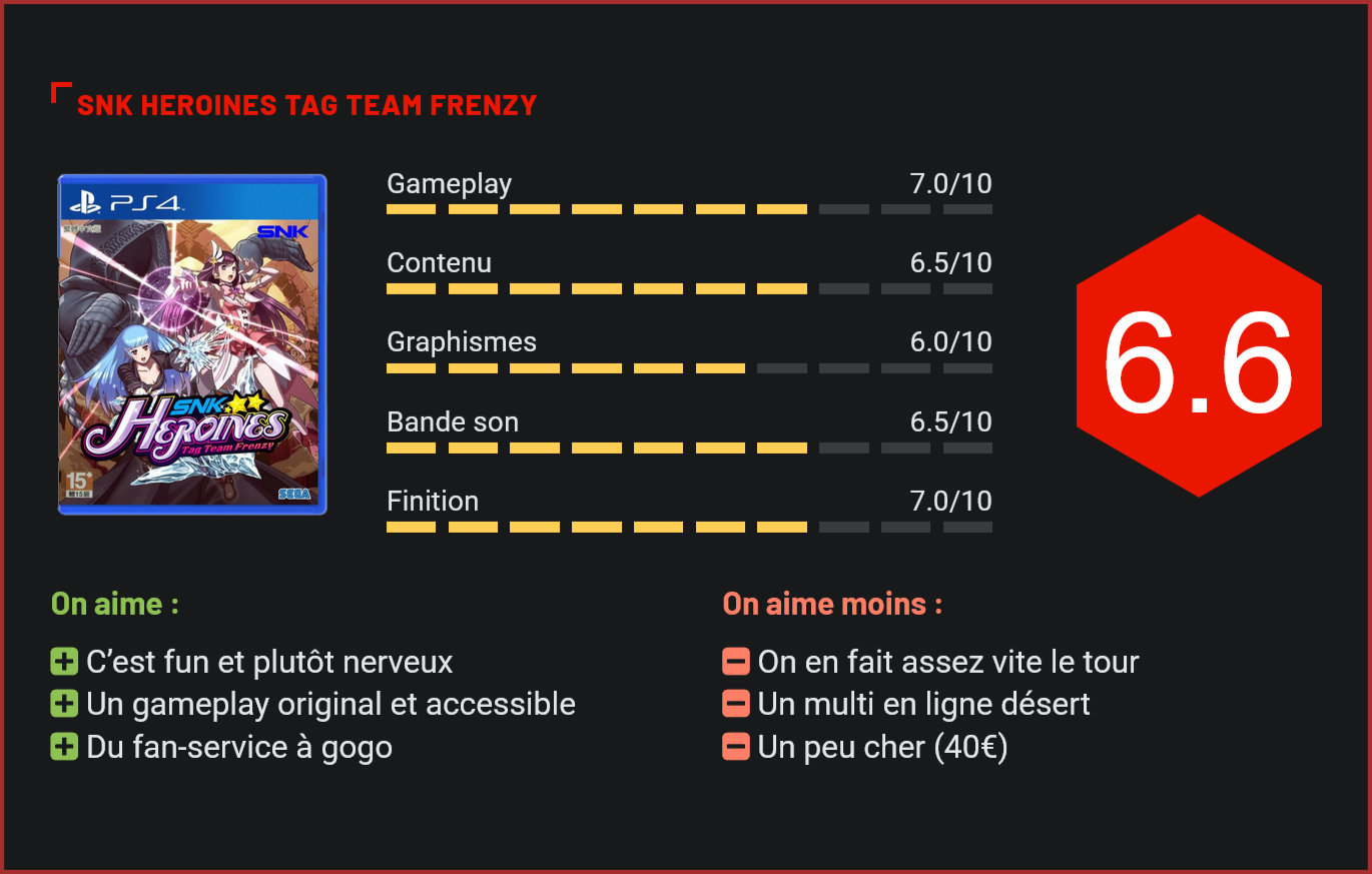 Après The King of Fighters XIV, SNK nous livre un autre jeu de baston en 3D, qui tente une approche différente avec une bonne dose de fan-service et un gameplay qui sort des sentiers battus. Sorti initialement sur Switch, puis sur PS4 et PC, SNK Heroines Tag Team Frenzy est un jeu de baston en 3D qui a été avant tout conçu pour être le grand public. Beaucoup plus accessible qu’un King of Fighters, le titre de SNK introduit plusieurs mécanismes de jeu originaux – à commencer par une jauge de vie commune aux deux combattantes de chaque équipe, qui devront faire descendre jusque zéro la jauge de l’adversaire tout en faisant grimper la barre de coups spéciaux pour activer un finishing move une fois la santé de l’adversaire à zéro. Une condition originale qui donne aux affrontements un peu de profondeur puisqu’il faudra se montrer économe en coups spéciaux pour terrasser son adversaire. Le titre de SNK reprend le moteur graphique et les bases de The King of Fighters XIV, mais adopte un style très différent puisqu’il est ici question de combats en 2 vs 2 et d’un gameplay beaucoup plus accessible. Chaque touche correspond ici à un type de coup : coups faibles, coups forts, coups spéciaux et chopes, auxquels il faudra ajouter une garde, les furies et le switch de personnage. Comme dans les King of Fighters, on enchaine les coups avec des combinaisons d’arcs de cercle et de boutons. En 1h tout au plus, vous maîtriserez la plupart des aspects du gameplay, et c’est ce qui fait tout le charme de ce jeu de baston. Peut-être un peu trop simples pour les vrais amateurs de jeux de baston, SNK Heroines Tag Team Frenzy n’en demeure pas moins stratégique et exigeant. Esquives, rebonds et finishing moves donnent au titre de SNK une certaine profondeur. Côté contenu, on notera la présence d’un mode solo au scénario barré, d’un mode survie, d’un tutoriel et du versus en et hors ligne. C’est relativement maigre, puisqu’au final, on fera le tour du jeu en moins de six heures. Pour rallonger artificiellement la durée de vie de son jeu, SNK joue la carte du fan-service en proposant au joueur de collecter les nombreuses tenues des 15 combattantes présentés dans son jeu. Aucun membre de la gent masculine ne répond présent, à l’exception de Terry Bogart, transformé en femme pour l’occasion (because, why not ?) Le concept est rigolo, la formule fonctionne même plutôt bien pour les fans de la première heure, mais on en vient très vite à regretter la maigre générosité de l’éditeur, qui livre de surcroît quatre personnages supplémentaires en DLC, à 4,99€ l’unité. Autre regret : si le multi en ligne fonctionne plutôt bien, il est plutôt croire d’y croiser une âme… Pour le reste, malgré son tout petit budget, SNK Heroines Tag Team Frenzy s’en sort plutôt bien côté réalisation avec le moteur graphique de KOF XIV, qui lui donne l’allure d’un animé, ses nombreux effets visuels qui viennent envahir l’écran, sa mise en scène catchy terriblement efficace, sa bande son sous hormones et ses héroïnes toutes plus charmantes les unes que les autres. Un titre bon enfant qui trouvera assurément son public, mais qui aurait assurément mérité d’être proposé sous la barre des 30 euros… Car si le jeu est correct graphiquement et au niveau de son contenu, il n’a pas la prétention de venir concurrencer un Dead or Alive, un Street Fighter ni même un King of Fighters… Conclusion S’il n’a pas la richesse d’un King of Fighters et souffre d’un contenu trop maigre, SNK Heroines Tag Team Frenzy n’en reste pas moins un jeu de baston très fun, seul ou à deux joueurs. Le titre de SNK surprend avec ses mécanismes de jeux originaux, ses affrontements nerveux et ses quelques idées sortant des sentiers battus. Il ne faudra toutefois pas plus d’une demi-douzaine d’heures pour en faire le tour… SNK compense cet impair avec pas mal de collectibles à récupérer et une bonne dose de fan-service, mais vu le prix auquel il est proposé, il aurait mérité d’être vendu à un tarif nettement plus bas, ou de bénéficier d’une réalisation graphique plus impressionnante. D’autant plus qu’il faudra débourser 20€ de plus pour débloquer 4 personnages supplémentaires et que le multi en ligne est plutôt désert. Fun et décomplexé, SNK Heroines Tag Team Frenzy est l’exemple typique du petit jeu sympa pas déplaisant, mais dont on ne retiendra finalement pas grand-chose…