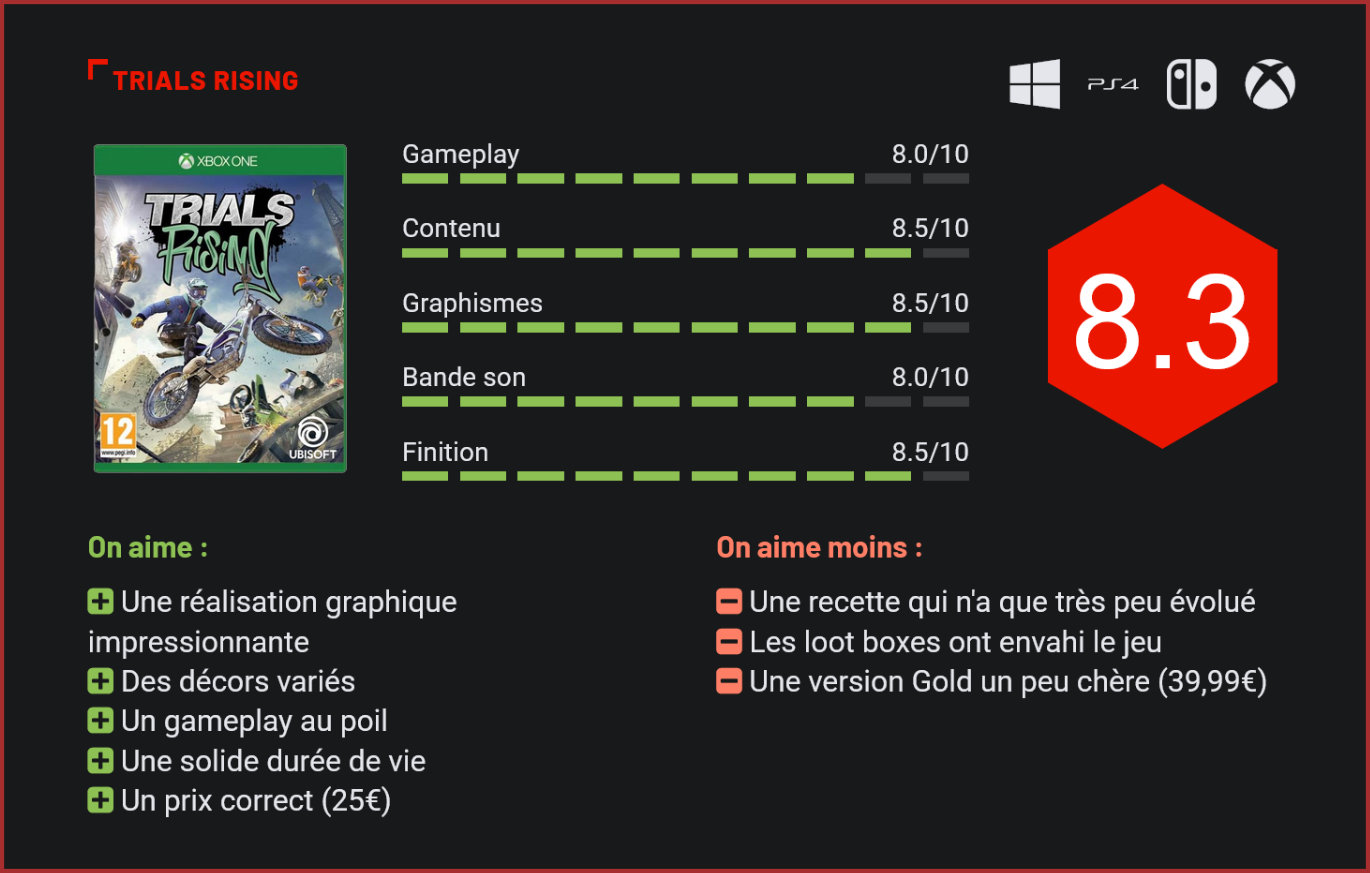 Fruit de la collaboration entre le studio finlandais RedLynx et Ubisoft Kiev, Trials Rising faisait partie des quelques titres qu’on n’attendait pas forcément et qui nous ont très agréablement surpris en février. Explications. Cinq années. C’est le temps que les fans de Trials auront du patienter pour pouvoir enfin mettre la main sur ce nouveau volet, qui n’est ni la suite directe de Fusion, ni un nouveau spin-off de la franchise, dans la veine de Rise of the Blood Dragon. Trials Rising n’est ni plus ni moins que le nouveau volet de la franchise, un épisode qui n’innove pas beaucoup côté gameplay mais remplit parfaitement sa mission. Difficile en soi d’innover avec un gameplay aussi simple et pourtant riche que celui de Trials Rising. Redlynx a exploité dans tous les sens le concept, proposant une multitude de déclinaisons plus ou barrées. Le nouvel épisode revient aux origines de la franchise, proposant d’enchainer les défis aux quatre coins de la planète. Pour ceux qui n’auraient jamais pris un Trials en mains, on peut résumer la recette à un « parkour » technique au volant d’une jolie bécane. Les graphismes sont en 3D, mais le joueur évolue sur un seul plan horizontal. La prise en main est très accessible puisque le joueur se contente ici d’accélérer, de freiner et de diriger l’orientation de son biker lors des sauts. Malgré la simplicité de son gameplay, Trials n’en reste pas moins un titre très exigeant puisque la moindre erreur est synonyme d’un reboot complet de la partie. Une touche permet d’ailleurs de recommencer la partie dès que le joueur ne se sent pas capable de décrocher l’or. Les parties sont courtes mais la tension est réelle. Le véritable enjeu ici est de maîtriser la physique du véhicule lors des sauts. Atterrir la tête la première conduira le joueur à un crash fatal. Dans le même ordre d’idée, il est très facile de perdre le contrôle de sa bécane lors des loopings, sauts de plate-forme en plate-forme et autres acrobaties. Pour espérer voir le bout de l’aventure, le joueur devra apprendre à être très précis, et c’est ce qui fait tout le charme du jeu. Les habitués de la franchise ne devraient donc pas être trop bousculés avec ce nouveau volet qui reprend pratiquement à l’identique la recette des précédents volets. Ce qui change ici, c’est la progression. Le joueur est parachuté sur une carte, à partir de laquelle il pourra choisir ses prochains défis. De petites missions tutoriels sont venues s’intégrer aux autres défis pour accompagner les petits nouveaux dans le mode carrière. La bonne nouvelle, c’est qu’ils sont pratiquement transparents et ne représentent pas une tare pour le joueur. Du côté des circuits, on retrouve un nombre impressionnant de défis, qui vous feront surtout parcourir un nombre incroyable de destinations, aux quatre coins de la planète, de l’Ouest sauvage à Paris, en passant par le Japon et les Rocheuses. Il y en aura vraiment pour tous les goûts ! Autre bonne surprise : le titre a droit à une réalisation graphique vraiment impressionnante, avec de nombreuses animations en fond d’écran – que l’on aimerait d’ailleurs admirer sans devoir se préoccuper du tracé -, avec des courses poursuites, des vaisseaux aliens, des hordes déchainées de fans ou un train qui circule à toute vitesse et au-dessus duquel vous vous amuserez à sauter. Redlynx et Ubisoft Kiev se sont lâchés et retrouver un titre à l’univers aussi varié et barré est un véritable plaisir. On notera au passage que les finishing moves sont toujours aussi cocasses, avec des accidents sur la ligne d’arrivée – marque de fabrique de la série – totalement inattendus la plupart du temps. Sans changer sa recette, Redlynx parvient donc à surprendre avec une réalisation digne d’un titre AAA, des défis en pagaille, beaucoup de fun, et même un niveau de personnalisation jamais atteint dans la franchise. Le joueur pourra personnaliser son personnage de la tête au pied – notamment grâce aux loot boxes remportées durant les parties… – et même créer ses propres circuits à l’aide d’un éditeur de niveaux ultra-complet. Mieux encore : le jeu propose un mode tandem qui permet pour la première fois dans la franchise de contrôler un bolide à deux joueurs, en se coordonnant pour le faire avancer sur la piste. Amusant, il permettra surtout aux joueurs de partager leur fun avec leur conjoint(e) le temps de quelques parties. Autre bonne surprise : la présence de classements des meilleurs scores et de ghosts cross-platform. C’est suffisamment rare pour être noté ! Pour le reste, Redlynx remplit sa feuille de route avec un contenu solide, une bande sonore efficace, des morceaux très énergiques et une bonne dose de fan service. Difficile de trouver quoi que ce soit à lui reprocher si ce n’est peut-être son prix un peu trop élevé, une fois le season pass ajouté à l’addition (39,99€). Conclusion S’il ne réinvente pas la roue, ce nouveau volet de la franchise est d’une efficacité redoutable. Sa réalisation solide, son contenu très riche et son gameplay jouissif en font un titre incontournable. La recette n’a toutefois pas évolué d’un iota. Non, ce Trials Rising n’introduit rien de vraiment neuf, mais RedLynx et Ubisoft Kiev nous rendent une copie proche de la perfection. Le gameplay très simple de Trials Rising en fait un titre très accessible qui ne se laissera toutefois pas dompter si facilement avec ses niveaux qui regorgent de pièges et de difficultés à surmonter pour décrocher la médaille d’or. Si on lui reprochera son manque d’originalité, ce nouveau volet propose une expérience de jeu très divertissante sur fond de tour du monde. On notera toutefois qu’il faudra tout de même débourser près de 40€ pour faire l’acquisition du jeu et de ses contenus additionnels – une note plutôt salée pou