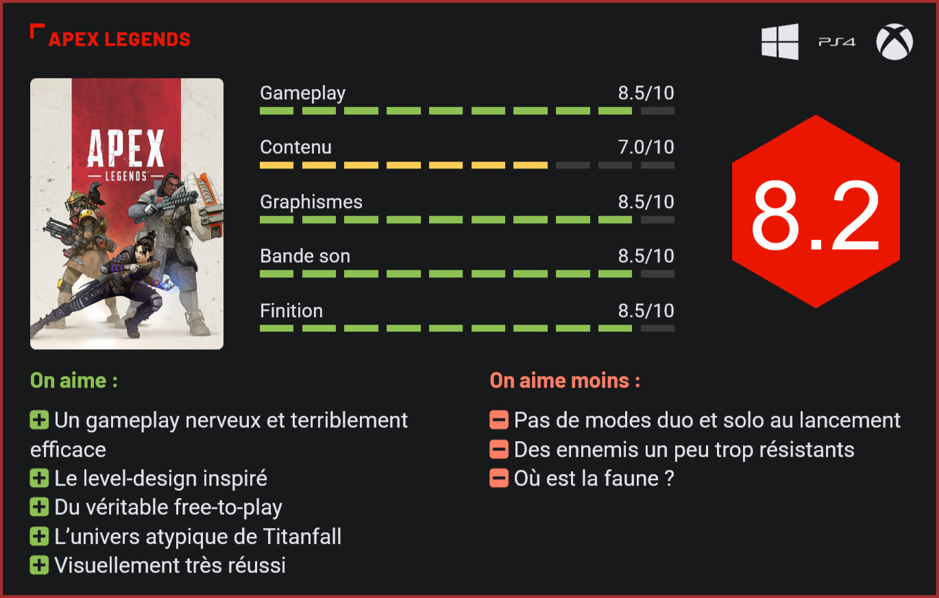 Mis en ligne le 4 février dernier, Apex Legends est parvenu à séduire les amateurs de Battle Royale avec son univers atypique et son gameplay exigeant. Le nouveau jeu de Respawn Entertainment pourrait même rabibocher les amateurs de FPS trop exigeants avec un sous-genre qui se destinait jusqu’ici principalement au grand public. Sorti de l’esprit des créateurs de Titanfall 1 & 2, Apex Legends a été lancé le 4 février dernier sur Xbox One, PS4 et PC tambours-battant par Electronic Arts, quelques minutes seulement après avoir été officiellement présenté. Free-to-play, le titre de Respawn intègre des achats in-app avec de l’argent bien réel et de la monnaie virtuelle, mais l’éditeur a évité de sombrer dans le pay-to-win en ne proposant que du cosmétique payant. L’expérience de jeu est donc la même pour tous les joueurs, qu’ils aient opté pour la version gratuite du jeu ou les packs fondateurs – qui ne donneront accès qu’à quelques skins de plus et deux personnages inédits (que le joueur peut également acquérir « gratuitement » après quelques heures de jeu). Exit les frasques de Battlefront 2 donc, et les sempiternels loot boxes, et place à un modèle économique transparent, qui se révèle être d’une rare efficacité. A l’issue de chaque partie, le joueur se voit attribuer un certain nombre de points d’expérience en fonction de sa position dans le classement, de ses frags et de ses performances. Ces points d’expérience lui permettront de débloquer du crédit et d’acheter ainsi divers éléments cosmétiques pour personnaliser son personnage et ses bannières. La grande force d’Apex Legends, c’est de reprendre à l’identique la recette des battle royale et de la transposer dans un univers atypique, celui de Titanfall. Attention toutefois, il ne sera pas question ici de wallruns ni de combats de mechas. Le joueur aura ici le choix entre six « légendes », des personnages aux traits différents qui disposent tous de leurs propres pouvoirs et spécificités – du « tank », qui est capable de créer un dôme protecteur pour son équipe, et d’utiliser un bouclier protecteur, au médic, qui peut demander une livraison de matos sur le terrain et soigner ses alliés à l’aide d’un drone. Chaque légende a ses spécificités et trouve une utilité différente sur le terrain. Les affrontements se faisant par équipe de trois, il faudra composer une équipe mixant différents talents pour espérer remporter la partie. Apex Legends_20190204204028 Une fois la légende sélectionnée, le joueur devra choisir le point de largage et tenter dans la mesure du possible d’atterrir dans une zone qui lui permettra de récupérer du matériel de qualité – comprenez par là armes, armures, grenades et équipement qui lui permettront de mettre plus facilement K.O. ses adversaires. Pour le moment, Apex Legends ne propose que des affrontements par équipes de 3 joueurs, pour un total de 60 joueurs. Des modes solo et duo sont toutefois également dans les cartons. Inutile de le préciser, pour espérer remporter la partie, il faudra apprendre à devenir un bon coéquipier. La progression sera néanmoins plus facile avec un ami qu’un parfait inconnu, et plus encore si vous utilisez un casque et maîtrisez les commandes du jeu, qui permettent d’indiquer la position d’un ennemi ou du loot à l’aide d’un curseur. La carte d’Apex est à l’image de celle de Fortnite vaste et incroyablement variée. Le level-design est d’une richesse impressionnante. Et là où le titre de Respawn tire son épingle du jeu, c’est justement dans son impressionnante verticalité, avec ses tyroliennes qui permettent de couvrir rapidement une longue distance, ses vallées et ses constructions imposantes. Connaître par cœur la carte nécessitera des heures d’entraînement. Autre très gros atout d’Apex Legends : le titre reprend pratiquement à l’identique le gameplay de Titanfall – à l’exception des wallrun et walljump, qui sont restés au placard. Le jeu est nerveux, exigeant et les affrontements sont terriblement grisants. On notera toutefois que par rapport à un PUBG par exemple, mettre au sol un adversaire exige ici de vider son chargeur dessus. Plus l’armure de votre adversaire est de qualité, plus il sera difficile de le mettre au sol. Dans ce contexte, on comprend très vite l’importance d’un bon équipement… On regrettera toutefois que si le gameplay du titre est relativement nerveux, la trop grande résistance des personnages aux tirs forcent le joueur à vider toutes leurs munitions en fonçant dans le tas, et en agissant souvent en équipe. Impossible ici de se la jouer solo… Très bien équilibré, le jeu de Respawn est un véritable régal entre amis. Les parties ne sont ni trop longues, ni trop courtes, et si le début de partie est généralement le cadre d’une petite boucherie, Apex Legends permet souvent aux retardataires de se refaire en récupérant le dog tag de ses alliés et en allant les ressusciter à un point de largage. Pratique ! Même si dans la pratique, il faudra qu’au moins un des trois membres de l’équipe parvienne à se planquer et récupérer les dog tags de ses alliés sans se faire voir pour les faire revenir dans la partie, ce qui est plus facile à dire qu’à faire. Comme dans PUBG et Fortnite, la carte du jeu n’aura de cesse de se réduire au cours de la partie – les joueurs étant poussés à se diriger vers l’intérieur du cercle pour éviter de subir d’importants dégâts. Progressivement, les survivants sont donc poussés à se rapprocher les uns des autres, jusqu’au grand final qui opposera les deux ou trois équipes qui auront survécu suffisamment longtemps. L’un des autres gros atouts d’Apex Legends vient de sa faculté à éviter la frustration du joueur. Chaque équipe a le choix du point de largage, peut visualiser le saut de ses adversaires – symbo