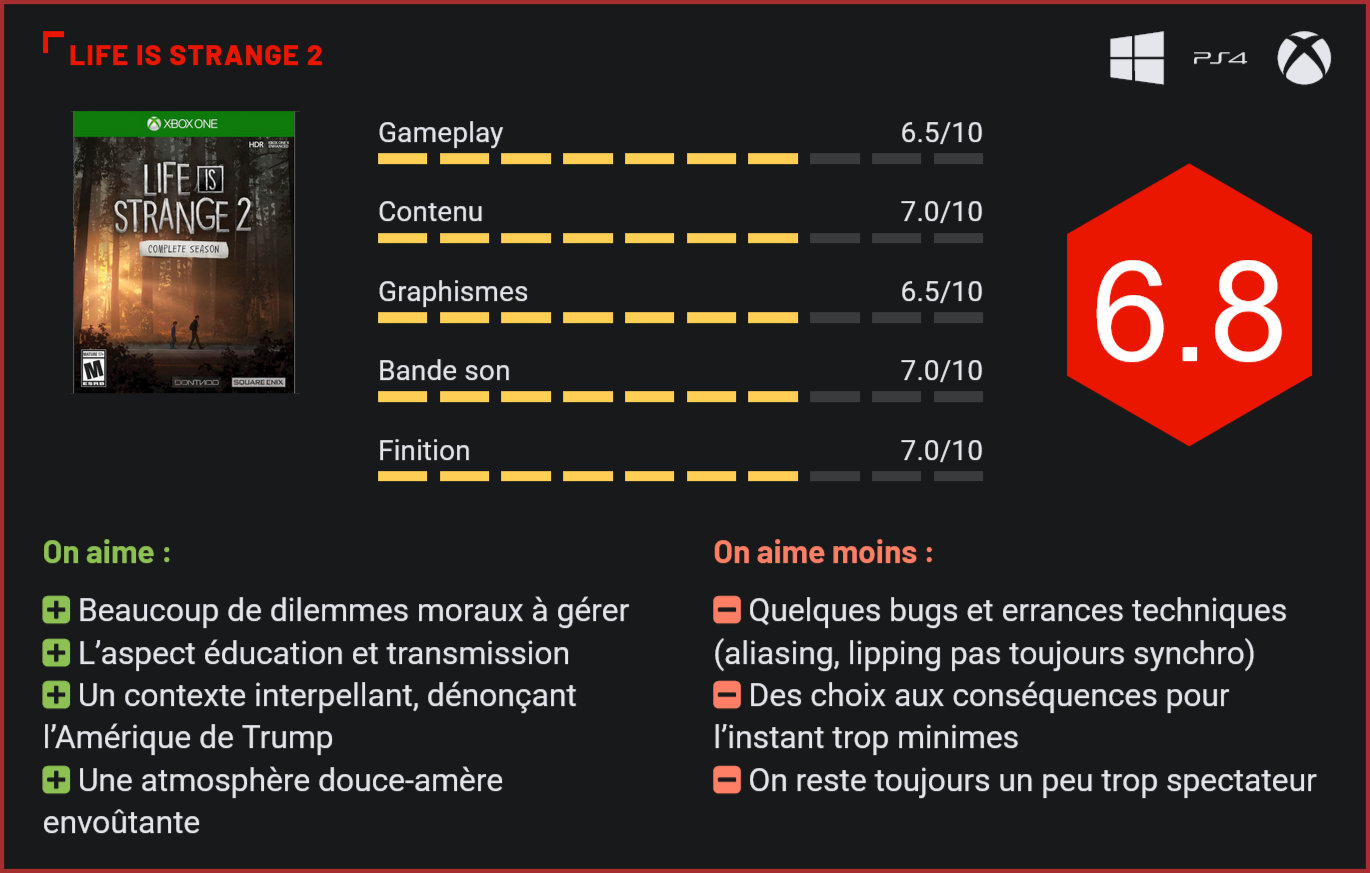 Le studio français DONTNOD continue d’explorer l’univers de Life is Strange à coups d’expériences narratives épisodiques. Deux des cinq épisodes prévus sont à ce jour sortis en ce qui concerne Life is Strange 2, ce qui nous permet d’avoir un premier avis sur cette suite mettant en avant deux jeunes frères d’origine mexicaine. Précédé du spin-off Les aventures extraordinaires de Captain Spirit mis gratuitement à la disposition des joueurs en juin 2018, Life is Strange 2 suit deux frères en pleine cavale. Le premier chapitre de ce road trip initiatique prend place à Seattle durant la période d’Halloween. Sean, 16 ans, et son petit frère de 9 ans Daniel Diaz vivent seuls avec leur père, leur mère ayant décidé de les quitter il y a de cela plusieurs années. Suite à un évènement on ne peut plus tragique survenant assez tôt dans le premier épisode, ils quittent la ville pour fuir la police qui est à leur recherche. Décidés à rejoindre le Mexique où sont leurs racines, ils apprennent sur la route à survivre et à gérer le mystérieux pouvoir surnaturel qui est violemment apparu chez Daniel… DONTNOD illustre encore à coups de graphismes cette fois un peu plus léchés mais toujours inégaux (certains tableaux sont ravissants tandis que des textures apparaissent régulièrement de façon tardives) un scénario mêlant humanisme et surnaturel où les choix moraux sont nombreux, provoquant des conséquences sur le cours du récit. Malgré un récit plus complexe que le premier Life is Strange et la sensation d’être davantage livré à soi-même dans des environnements apparemment plus vastes, on se sent encore trop souvent tenu par la main, les différents axes scénaristiques nous orientant toujours in fine vers le même dénouement. La notion de choix, pourtant omniprésente, reste donc actuellement toute relative, malgré les efforts effectués par le studio. La recette est connue, avec ses points forts et ses faiblesses, mais ce qui marque le plus ici est bien la trame scénaristique de cette œuvre vidéoludique que l’on peut sans hésitation comparer à du cinéma indépendant américain (fait par des français, donc) engagé. L’Amérique de Donald Trump est dans la ligne de mire, avec ce que cela comprend de personnages conservateurs qui voient d’un mauvais œil l’arrivée de deux jeunes mexicains dans leur petite ville soi-disant sans problème. Life is Strange 2 est sans aucun doute un jeu politiquement engagé qui allie l’intime et l’universel, avec son lot de situations moralement déstabilisantes et une fraternité mise en images de façon très émouvante. Une bonne chose, même si l’on regrettera un certain manque de nuances, les personnages rencontrés étant bien souvent soit d’indécrottables xénophobes soit des outsiders au grand cœur. Petit bémol aussi pour certains comportements un peu trop expéditifs, comme ce policier qui tire sans raison en début de saison, ce qui entraînera une fuite en avant un peu trop forcée pour être tout à fait honnête. Le premier épisode s’attache immédiatement à la relation entre Sean et Daniel, le joueur ayant le contrôle du premier. En tant qu’aîné, ses choix servent d’exemple à son frère cadet ce qui place au centre de tout le thème principal de l’honnêteté, Sean devant choisir ou non de dire la vérité à son petit frère pour le préserver de la cruelle réalité. Une réalité qui rattrapera vite les deux jeunes loups dans un second épisode davantage axé sur le pouvoir de Daniel, qu’il doit tant bien que mal dissimuler aux yeux des autres. Le grand frère (le joueur) prend donc en main l’éducation du cadet jusqu’à ce que les deux vagabonds partent à la rencontre de leur grands-parents. Tout ne se passera pas comme prévu dans cette ambiance familiale brièvement retrouvée en pleine période de Noël, puisque les secrets de chacun s’avèrent bien difficiles à garder. On n’en dira pas plus pour conserver une certaine spontanéité, mais sachez toutefois que le lien est habilement établi vers Captain Spirit, les données de l’épisode spin-off étant ici prises en considération. Pour le reste, le jeu offre toujours quelques moments de suspension où la musique (la bande son est de qualité, pour peu que l’on apprécie la guitare acoustique) berce différents angles de vue mettant en évidence un environnement luxuriant, ou encore lorsque Sean s’assied quelques secondes pour dessiner dans son carnet la scène qu’il a sous les yeux. Des moments qui renforcent la sensation douce-amère de ce Life is Strange 2 qui contient une poignée d’objets à collecter, dont des badges et porte-clés à accrocher au sac à dos des protagonistes, qui sert d’inventaire. Le jeu laisse d’ailleurs la possibilité de retourner dans l’un ou l’autre chapitre pour compléter la collection, tout en conservant les choix effectués lors du premier run. Et même si les conséquences de ces choix effectués ne se ressentent jusqu’ici que trop peu au cours de ces deux premiers épisodes, on parvient à véritablement s’attacher aux frères Diaz dont le voyage comptera probablement plus que la destination. Conclusion Life is Strange 2 est à ce stade un récit intimiste doux-amer qui n’hésite pas à illustrer, hélas parfois de façon peu subtile, l’Amérique conservatrice de Trump. Entre secrets, leçon de vie et maîtrise de pouvoirs télékinétiques, les interactions et choix moraux sont assez nombreux, même s’ils débouchent pour l’instant aux mêmes conséquences, qui plus est bien souvent prévisibles. Mais le voyage en compagnie des frères Diaz est suffisamment beau et touchant que pour être parcouru, les yeux rivés sur un joli panorama et les pensées bercées par un chant douçâtre sur fond de guitare acoustique.