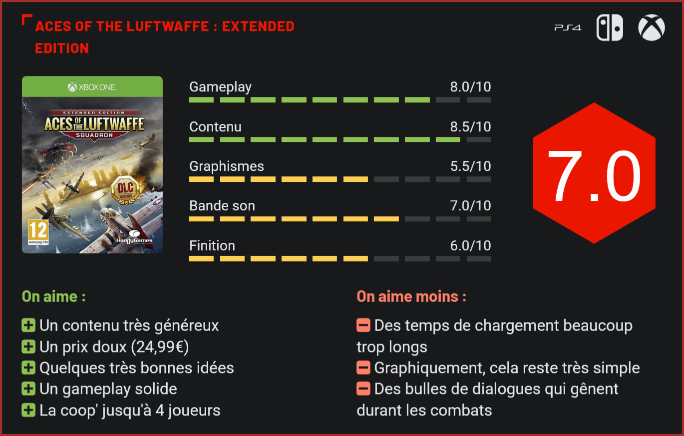 Développé par un petit studio indépendant, Aces of the Luftwaffe était parvenu à surprendre les amateurs de shoot them up avec ses idées ingénieuses. Le titre d’HandyGames revient aujourd’hui à la charge dans une édition intégrale qui ajoute une nouvelle campagne complète. S’il n’avait rien de révolutionnaire au moment de sa sortie, le titre d’HandyGames était parvenu à surprendre les amateurs de shoot them up grâce à plusieurs idées innovantes. Calqué sur celui des grands classiques, le gameplay du titre proposait quelques innovations majeures, avec un système d’expérience tout d’abord, qui permettait au joueur d’améliorer les compétences de son escadrille et de débloquer de nouvelles attaques. Le titre d’HandyGames se démarquait également des autres shoot them up par sa prise en main, le joueur dirigeant ici non pas un seul vaisseau mais une escadrille de quatre vaisseaux – qui pouvaient être contrôlés séparément par quatre joueurs. Les innovations ne s’arrêtaient pas là… En cours de partie, les séquences de shoot étaient régulièrement interrompues par des dialogues entre les différents protagonistes, qui venaient enrichir un scénario déjà plutôt accrocheur puisqu’il était question dans le jeu de base d’incarner une escadrille de pilotes d’élite chargés de renverser le cours de la guerre en affrontant les forces de l’Axe dans les airs. Le titre d’HandyGames ajoutait enfin une composante unique avec la présence de missions secondaires qui permettaient de débloquer plus de points d’expérience et offraient au joueur une expérience plus riche encore, avec des petits défis qui apparaissaient de façon sporadique. Il était par exemple question de survivre sans subir de dégâts, de passer inaperçu dans un vol de nuit durant plusieurs minutes ou d’éviter de perdre un membre d’escadrille durant une mission. Des petits plus qui ne changeaient pas vraiment l’expérience de jeu mais qui ajoutaient une petite dose de difficulté supplémentaire. Fun et terriblement efficace, le titre édité par THQ Nordic proposait un défi à la hauteur des attentes des amateurs du genre. Petit budget oblige, la réalisation technique était son talon d’Achille. Malgré des doublages intégraux en anglais, le titre n’a pas laissé des souvenirs impérissables dans l’esprit des joueurs. Graphiquement, Aces of the Luftwaffe n’était pas non plus ce qu’on pourrait appeler un canon pour le genre – avec ses visuels trop simples et ses décors génériques. La version étendue ne corrige malheureusement pas ces petits défauts – mais apporte quantité de contenus supplémentaires avec une nouvelle campagne complète – qui propose cette fois d’incarner les forces de l’Axe. L’approche est originale, et comme dans le jeu d’origine, le scénario est à la fois drôle et bien pensé. Les différents protagonistes du jeu sont complètement barrés et cela fait plutôt plaisir de voir un shoot them up avec un background si développé. La durée de vie du jeu est ainsi plus que doublée. Faire le tour des deux campagnes, en prenant son temps, vous demandera un petit peu plus de 4h, après quoi il vous sera possible de les reparcourir dans un niveau de difficulté plus élevé, ou avec des amis. Généreux en contenu, le titre d’HandyGame souffre toutefois des mêmes défauts que le titre d’origine, avec une réalisation moyennement séduisante et surtout une finition déplorable. Les temps de chargement intempestifs sont une véritable plaie – et ce même sur les modèles de consoles “Pro” ou “X”. Non seulement les chargements sont nombreux, mais ils ont tendance à être très longs, pour un titre qui n’est visuellement pas une claque… Un manque d’optimisation qui fait donc mal sur la note finale… Pour autant, passer à côté d’Aces of the Luftwaffe sans y prêter attention serait une grossière erreur tant le jeu propose une expérience de jeu aux antipodes des standards actuels, avec un niveau de difficulté relativement relevé et un vibrant hommage à un genre qui a aujourd’hui tendance à s’effacer… Certes, il ne s’agit pas du jeu de l’année, mais Aces of the Luftwaffe n’en reste pas moins un très sympathique shoot them up, à parcourir seul ou à plusieurs… Conclusion Généreuse en contenu, cette édition intégrale d’Aces of the Luftwaffe représente une parfaite opportunité pour jouer les séances de rattrapage sur ce qui restera sans doute pour un moment l’un des meilleurs shoot them up old school de ces dernières années. Si, techniquement, Aces of the Luftwaffe n’impressionne guère, le titre d’HandyGames n’en reste pas moins un shoot them up terriblement efficace, qui n’hésite pas à sortir des sentiers battus en introduisant des concepts innovants, avec son système d’expérience qui permet de débloquer de nouvelles capacités, sa coop à quatre joueurs et ses missions annexes. Fun et décomplexé, le titre édité par THQ Nordic propose également un contenu très riche, avec deux longues campagnes à parcourir seul ou jusqu’à quatre joueurs, pour un prix somme toute très modeste.