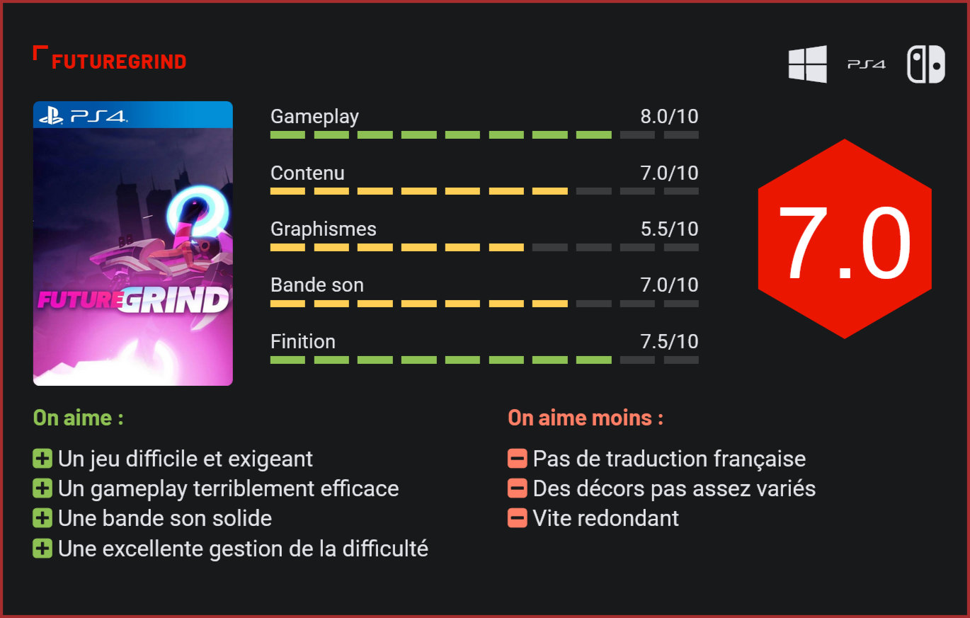 Après les jeux mobiles, le petit studio canadien Milkbag Games s’attaque aux jeux pour consoles et PC avec Futuregrind. Un jeu basé sur la progression par l’erreur qui mettra les nerfs des joueurs à rude épreuve. Enfourchez votre bécane du futur, c’est parti pour une course d’obstacles frustrante, mais toute aussi addictive. Le petit studio indépendant canadien Milkbag Games s’était déjà illustré sur mobile, en 2014, avec Disco Zoo et Photobomb qui avaient tous les deux rencontré un certain succès. Cette année, le studio s’est lancé un nouveau défi : proposer un jeu sur consoles et PC. De là est né Futuregrind, un mélange de jeu de course et d’action dans un cadre futuriste. Le joueur contrôle un pilote de moto du futur engagé dans une compétition internationale. Notre héros doit s’attirer l’affection du public et des sponsors afin de gagner des nouveaux modèles de motos plus performantes, mais sous ses airs de compétitions bon-enfant se cache en réalité un complot contre notre pilote. Un scénario basique qui a tout de même le mérite d’exister et d’encadrer la succession de circuits. Après quelques lignes de textes, on démarre directement sur le circuit et on fait connaissance avec ce véhicule du futur, une moto aux airs du film Tron où le pilote est installé au centre d’une structure reliant deux roues. La structure peut tourner autour du pilote afin de rouler sur une ou deux roues. Le but du jeu est assez simple : atteindre la fin du circuit en un seul morceau. Pour y arriver, il faudra survivre aux différents obstacles sur le chemin et remplir différents objectifs imposés. Flirtant avec les jeux de plateforme, le titre propose un système de progression très frustrant, le parcours étant semé d’embûches ou plus précisément de trous. Pour boucler sa course, notre pilote devra sauter de rails en rails jusqu’à la ligne d’arrivée. Ça, ce n’était que pour le premier niveau. Grâce à la grande bonté d’un sponsor, notre pilote prend position sur une nouvelle bécane, aux roues de couleurs différentes, une bleue et une rose. Dorénavant, il faudra se déplacer sur la roue correspondant à la couleur du rail au risque de devoir recommencer la course. Le tout avec une vitesse assez soutenue, sauter de plateforme en plateforme en faisant tourner la moto pour faire correspondre la couleur au rail s’avère assez compliqué. Et comme si cela ne suffisait pas, Futuregrind impose également différentes figures acrobatiques qu’il faudra impérativement réaliser au cours du circuit pour amuser la galerie. Si elles ne sont pas réalisées, il faudra recommencer encore et encore. De quoi crisper un peu plus les nerfs du joueur. Malgré la progression, les circuits se révèlent assez limités. Les décors sont d’ailleurs souvent les mêmes – on notera tout de même l’aspect disco des rails néons -, ce sont surtout les objectifs qui changent et qui apportent de la variété au titre. Le level design est croissant, mais à force d’aiguiser ses réflexes, le jeu devient redondant. Le cadre de la compétition, de l’aspect futuriste et de la vitesse est parfaitement cadré par une musique techno tout aussi rythmée. Heureusement, au bout de plusieurs morts, elle s’octroie une petite pause, histoire d’éviter que le joueur n’arrache le peu de cheveux qu’il lui reste. Conclusion Proposé à un tarif relativement attractif (environ 20€), le dernier bébé du studio canadien Milkbag Games parvient à séduire avec son cadre futuriste et son gameplay terriblement exigeant. A mi-chemin entre le jeu de course futuriste et le jeu de parkour, Futuregrind mettra les réflexes des joueurs à rude épreuve. Le gameplay est terriblement efficace et on en vient à enchainer les parties sans même s’en rendre compte. Vu le prix, il ne faudra toutefois pas s’attendre à une réalisation grandiose ni à une durée de vie exceptionnelle. Il y a d’ailleurs de fortes chances que vous lâchiez le jeu en cours de partie, le concept étant par nature très répétitif…