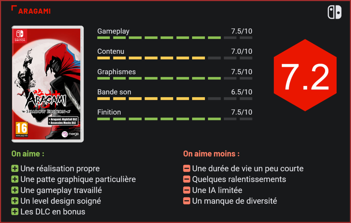 Aragami fait partie de ces jeux que l’on ne voit que trop peu souvent dans le paysage vidéoludique. Le titre est un jeu d’action qui s’inspire de l’infiltration japonais, comme Tenchu et Metal Gear Solid. Alors que le jeu du studio Lince Works était déjà sorti en 2016 sur plusieurs plates-formes, il est maintenant disponible sur Switch, dans une édition intégrale. Aragami est la suite logique d’un projet initié par des étudiants. À la fin de leurs études, les apprentis concepteurs ont fondé leur propre studio qui est devenu Lince Works. Cette équipe a voulu développer une version plus aboutie de leur projet étudiant, les amenant à concevoir Aragami. Aragami est un jeu à la troisième personne se déroulant dans un Japon médiéval fantastique. Invoqué par la jeune Yumiko – nourrie par un désir de vengeance – on prend le contrôle de l’Aragami, un esprit vengeur revenu d’entre les morts et pourvu de pouvoirs surnaturels. Véritable assassin, notre personnage est capable de manipuler les ombres pour arriver à ses fins. Le titre ne se démarque pas particulièrement grâce à sa trame scénaristique, mais c’est plutôt du côté du gameplay que le plus gros du travail a été fourni. L’une des spécificités d’Aragami repose sur la possibilité d’utiliser les ombres à son avantage. Toutefois, les sources de lumière sont à éviter. Une fois exposé à la lumière, notre personnage commence à perdre de la vie, en plus de s’exposer aux ennemis. Se placer dans l’obscurité permet d’ailleurs de recharger son énergie, visible sur la cape du héros, tout en permettant de bénéficier d’une palette assez large d’aptitudes et de mouvements. Au-delà de pouvoir se téléporter, il est possible d’utiliser bon nombre de capacités comme : un leurre, un écran de fumée, une clochette pour attirer les ennemis, un piège mortel et même pouvoir faire disparaître les cadavres ennemis. Il est en effet plaisant d’utiliser les possibilités offertes afin d’éliminer discrètement les soldats présents au travers des différents niveaux. Pour en découvrir toutes les subtilités, il sera parfois nécessaire d’explorer chaque niveau plusieurs fois. Il est d’ailleurs possible d’y trouver plusieurs parchemins, plus ou moins bien cachés, qui permettent de déverrouiller de nouvelles capacités. À la fin de chaque niveau, une note est attribuée selon les performances qui encourage très nettement de suivre la voie du ninja. Éliminer les gardes discrètement, sans être découvert ni faire sonner l’alerte, est ce qui rapporte notamment le plus de points. Les nombreuses aptitudes de notre personnage et sa vélocité permettent d’expérimenter plusieurs stratégies face aux soldats rencontrés. Les éliminations sont un plaisir coupable, au point qu’on en viendrait presqu’à regretter qu’ils ne soient pas plus nombreux… On regrette également le manque de diversité des ennemis et les limitations de l’IA. Cependant, ces points noirs sont compensés par un level design travaillé qui amène également une verticalité au sein de plusieurs niveaux. Même si le titre ne brille pas grâce à sa réalisation technique, le style graphique du titre, tout en 3D cel shading, est du plus bel effet sur Switch. Le travail effectué sur la console de Nintendo est honorable, sans être toutefois exempté de défauts et de ralentissements. Cependant, cela ne nuit en rien à l’expérience offerte sur la console hybride. En termes d’expérience, la musique produite par Two Feathers est vraiment soignée et contribue à l’atmosphère japonaise qui se dégage du titre. Elle est donc très appréciable à écouter au cours de la dizaine d’heures qu’Aragami réserve. De plus, cette Shadow Edition contient l’extension Nightfall qui réserve une aventure jouable à 2 en coopérations. Cette aventure comporte en tout 4 chapitres qui se bouclent en environ 2 heures de jeux. Conclusion Aragami parvient à ressusciter un genre qu’on pensait complètement disparu. S’inspirant de classiques comme Tenchu, le studio Lince Works livre un jeu d’infiltration inspiré, qui parvient à se distinguer de son modèle par la composante SF. Les possibilités offertes au cours des différents niveaux sont nombreuses et cela est notamment lié à un level design particulièrement soigné. Le studio barcelonais rend hommage au genre, en manquant toutefois d’ambition. Le nombre d’ennemis reste limité et l’IA pas franchement débordante de créativité. On regrette également ces soucis d’accessibilité, au travers de certaines capacités, facilitant un peu trop l’aventure et l’exploration des niveaux. Toutefois, Aragami est une bonne surprise qui montre notamment le talent d’une équipe encore jeune, mais prometteuse. Cette adaptation sur Switch est de qualité et ne dénature en rien le jeu d’origine. De plus, il est possible de pouvoir partager cette expérience grâce à la présence de l’extension Nightfall comprise dans cette Shadow Edition.