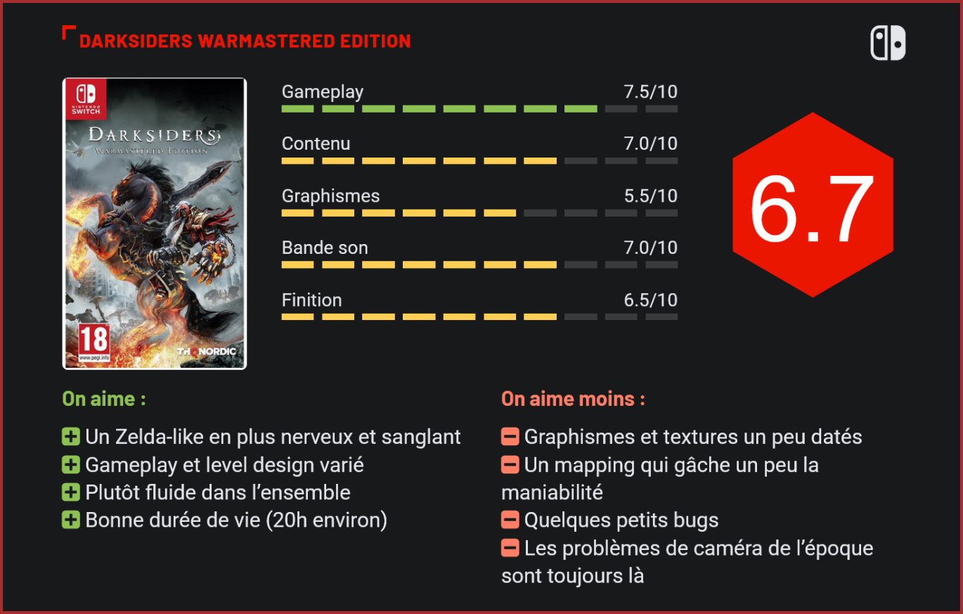 Disponible sur PC, Playstation 4 et Xbox One depuis 2016, Darksiders Warmastered Edition, remaster du tout premier Darksiders, arrive ce 2 avril sur Switch en version boite et dématérialisée. Voici un portage de plus pour la console hybride de Nintendo, principalement à destination des retardataires ou des fans inconditionnels de la série qui voudraient profiter du titre en mode nomade. En effet, ce remaster de Darksiders premier du nom est déjà sorti sur les autres plateformes actuelles et même la WiiU avait eu droit à sa version. Pour rappel, le titre de THQ Nordic nous fait incarner l’un des quatre cavaliers de l’apocalypse, War (Guerre), accusé à tort d’avoir provoqué la guerre entre les Cieux, les Enfers et le Royaume des Hommes. Alors que les forces démoniaques ont envahi la Terre, il part en quête de vérité et va mener un combat sanglant face aux sbires du Destructeur. La licence, lancée en 2010 et qui compte à ce jour trois titres (vous pouvez d’ailleurs consulter notre test de Darksiders 3 sorti en décembre 2018) mélange une action inspirée de God of War avec des combats intenses avec de l’exploration à la Zelda avec des donjons comprenant des coffres à dénicher et des mécanismes plus ou moins complexes à déclencher à l’aide des habilités débloquées au fil de l’aventure. Un mix toujours efficace à l’heure actuelle qui demande un sens aigu de l’observation et une bonne connaissance des habilités du personnage. Ennemis aux patterns bien huilés, boss d’envergure, level design à base de mécanismes alambiqués (dont d’infernaux portails dimensionnels), l’aventure est variée et le challenge à la hauteur. Les armes et capacités (épée géante, arme à feu, boomerang, etc.) offrent un beau panel de possibilités et sont exploitées à bon escient tandis que les âmes et artefacts se collectent avec ferveur pour des échanges en vue d’améliorations. Même si ces mécaniques de gameplay sont aujourd’hui très communes, elles demeurent efficaces et globalement maniables même si le mapping sur les Joycons manque un peu de souplesse. Certaines manipulations ne sont pas toujours naturelles et le ciblage des ennemis ou des mécanismes à déclencher manque parfois de précision. Il n’est même pas rare de rater un simple double saut suivi d’un vol plané mais, heureusement, le titre respawn votre personnage à proximité de la chute. Tellement proche d’ailleurs qu’il vous ressuscite parfois dans le vide ! Le genre de petits bugs que l’on retrouve de temps à autre, et qui existaient déjà sur les précédentes plateformes, tout comme le placement parfois capricieux de la caméra qui gâche de temps à autre la visibilité. Côté performance, le jeu dispose d’un lifting correct mais qui ne parvient pas à effacer le poids des années. Darksiders est un jeu de 2010, le remaster date de 2016, et de nombreuses textures ne font pas le poids comparé aux titres actuels, même pour la Switch. Pour un petit peu palier aux quelques aliasing et ralentissements que vous pourrez rencontrer en cours de route, le jeu propose néanmoins dans ses options de choisir entre un mode “Qualité” et un mode “Performance”. Avec le premier vous pourrez profiter de graphismes un peu plus fins avec du 720p en mode portable et du 1080p en mode TV à hauteur de 30 images par seconde, tandis qu’avec le second la résolution est réduite pour atteindre 50 à 60 FPS. Esthétique ou fluidité, à vous de choisir. Enfin, pour ceux qui se poseraient la question, le contenu du titre est strictement le même qu’en 2010, Darksiders premier du nom ne disposant d’aucun DLC. Autant dire que cette version s’avère donc un peu paresseuse. Néanmoins, un éventuel portage de la Deathinitive Edition de Darksiders 2, qui dispose quant à lui de contenus additionnels, ne serait pas vraiment déplaisant vu la qualité intrinsèque du titre. Il n’est pas non plus interdit d’espérer la version Switch de Darksiders 3. Les ventes de ce premier volet sur la console de Nintendo dicteront à n’en pas douter la voie à prendre chez THQ Nordic. Conclusion Même pour une trentaine d’euros, on a du mal à craquer pour un remaster qui reste très léger, d’autant qu’il s’agit d’un titre qui demande une certaine implication et s’avère donc par nature moins propice à de courtes sessions en mode portable. Si vous êtes totalement novice dans l’univers Darksiders et que vous n’avez que la Switch comme support pour jouer, pourquoi pas. L’aventure devrait vous contenter par son mélange d’action-exploration efficace quoiqu’un peu vieillissant. Pour les autres, inutile de repasser à la caisse.
