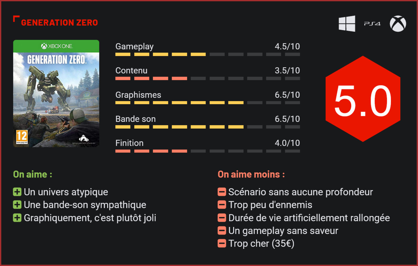 Avalanche Studios nous sort un nouveau titre en monde ouvert. Le studio souhaitait proposer une nouvelle expérience coop’ dans une ambiance qui pourrait rappeler un scénario très proche de La Guerre des Mondes. Generation Zero se présente comme un autre titre en monde ouvert conçut par le prestigieux studio suédois. Après avoir produit 4 itérations de Just Cause ainsi qu’un titre tiré de l’univers de Mad Max, le studio se targue d’une réputation de 15 ans de AAA avec principalement des jeux en monde ouvert. Avalanche planche actuellement sur Rage 2 et sort, en attendant, un titre moins ambitieux, mais qui avait de quoi séduire sur le papier. Generation Zero propose de se plonger dans une version alternative de la Suède pendant les années 80. Le monde est envahi par des machines hostiles qu’il faudra affronter et réduire en pièces. On se réveille sur une île aux abords du pays nordique. Seul, le joueur sera rapidement rejoint par d’autres aventuriers, grâce aux miracles de l’Internet. Dès les premiers instants, il est nécessaire d’aller visiter le moindre recoin de chaque bâtiment rencontré afin de pouvoir s’équiper, en vue de défaire les quelques robots qui parcourent les villages scandinaves, à la recherche de survivants. Très vite, on se rend compte à quel point le jeu peut être répétitif. Les bâtiments et maisons rencontrés se ressemblent tous, les décors n’ont aucune diversité et les mécanismes de gameplay nous poussent à progresser tout le temps de la même façon. La carte étant très vaste, tous les trajets se font à pied et autant dire que le temps devient vite très long. Le nombre d’ennemis étant plutôt faible, on en arrive à s’ennuyer rapidement en ayant l’espoir de pouvoir en découdre de manière presque désespérée. On peut croiser en tout 6 types de robots différents, de taille variée et au style de combat qui leur est propre. Generation Zero nous est présenté comme un jeu où la tactique a son importance. En réalité, il suffit surtout de ne pas foncer tête baissée dans un groupe de robots et de les éliminer les uns après les autres une fois leur point faible découvert. Bien sûr, il est toutefois possible d’utiliser les nombreux objets disséminés un peu partout afin de faire diversion. Mais de manière générale, l’idée de ne pas foncer dans le tas bêtement dépendra surtout de l’équipement en notre possession. Pour le coup, la dimension d’infiltration présentée reste minimaliste et tout échec n’aura que très peu de conséquences. Il sera en effet possible de s’auto-réanimer tout au long de la campagne. Arrivée au bout d’un certain nombre de réanimations, il est possible d’être rapatrié au sein de la maison la plus proche. De quoi rester pantois quant à une réelle condition d’échec. Il n’y donc aucun enjeu, ce qui réduit à néant toute réflexion superflue. Le titre assure le strict minimum en matière de jeu en monde ouvert et donne une impression de bac à sable plutôt vide, même en matière de game design. Ce n’est pas une mécanique de persistance des robots et de la localisation des dégâts subits, ainsi qu’un système de point d’expérience qui arrive à sauver la mise. Il est en effet possible de pouvoir récupérer quelques points à placer sur un arbre de compétence. Mais le peu d’ennemis rencontrés, compte tenu de la taille de la carte fait que cette jauge ne monte que trop lentement. Quelques rares missions permettent toutefois de récupérer de l’expérience en bonus, mais celles-ci ne consistent que le plus souvent à dézinguer du robot à tout va. Sa durée de vie aurait pu être considérée comme étant relativement honnête, il faudra compter entre 12 et 15 heures de jeux afin d’en voir le bout. Simplement, ce goût de trop peu et ces problèmes de conception donnent l’impression que sa durée de vie a été artificiellement allongée. D’ailleurs, afin de ne pas trouver l’expérience trop ennuyante il est plus que vivement recommandé d’y jouer à plusieurs, entre amis. Seulement voilà, il faut avoir envie de payer le droit d’entrée qui s’élève à près de 40€, pour un titre qui n’aurait franchement jamais dû être vendu au-delà de 15€… Graphiquement, l’usage du moteur Apex d’Avalanche est du plus bel effet et il est d’autant plus dommage de voir que Generation Zero s’en sort de ce côté-là. D’autant plus qu’un système de météo dynamique a été implémenté. Celle-ci a un impact sur la visibilité des robots et permettrait d’en tirer avantage. Dernier point, le travail sonore réussit quant à lui relever un tant soit peu le niveau. Le sound design est très réaliste et la spatialisation est très travaillée. La bande originale choisie est également agréable et colle parfaitement bien à cette ambiance typée des années 80. Malgré tout, cela ne suffit pas à sauver la mise. Conclusion Generation Zero est un jeu qui avait beaucoup de choses pour plaire sur le papier. Le titre d’Avalanche ne parvient toutefois pas à convaincre, faut de substance. Propulsé en Suède dans les années ’80, le joueur devra parcourir un monde ouvert très vide avec jusqu’à 3 autres joueurs, pour tenter d’échapper aux hordes de robots, qui ont pris contrôle de cet univers. Le potentiel du jeu est gâché par un gameplay sans aucune saveur, des séquences de jeu ultra-répétitives et un univers totalement aseptisé. Au final, le titre laisse un très gros goût d’inachevé. Generation Zero est typiquement le genre de jeu qui aurait mérité du temps de développement supplémentaire pour être peaufiné. Vu le prix auquel il est vendu – 35€ – la pilule risque d’être difficile à avaler.