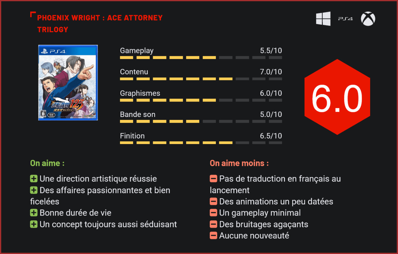 Essentiellement présente sur les consoles portables de Nintendo (GBA, DS et 3DS), la série Phoenix Wright s’invite sur PC, Playstation 4 et Xbox One, sans oublier bien sûr la Switch, par le biais d’une compilation reprenant la trilogie originelle. Pour faire patienter les fans et bien préparer l’arrivée du très réclamé Ace Attorney 7, Capcom a décidé de sortir deux compilations de sa série de jeu d’aventure textuel où le joueur doit résoudre des affaires dans la peau d’un jeune avocat. Il est ici question des trois premières aventures du jeune Phoenix Wright, à savoir les titres Ace Attorney, Justice for All et Trials and Tribulations. Cette première collection remasterisée était déjà sortie sur 3DS et sur smartphones en 2013 et cette « nouvelle » version multi-plateforme s’avère en être un simple portage sans grand ajout. Tu pointes ou tu cliques ? On retrouve donc la désormais célèbre formule de visual novel en 2D qui emprunte de nombreuses mécaniques au point and click. Le joueur se glisse dans la peau de l’avocat débutant et devra prouver l’innocence de ses clients au cours d’affaires de plus en plus complexes. Les phases de recherche de preuves et d’indices sur les divers lieux des crimes et méfaits s’enchaînent à des séquences d’interrogatoires où il faut mettre le doigt sur les mensonges proférés et autres éléments contradictoires lors des différents témoignages. Tout cela se déroule entre des phases d’enquête et des séquences de procès, le tout dans un enchaînement de panneaux peu animés où l’on déplace un curseur pour mettre en évidence des indices et où l’on participe à des échanges verbaux. Voilà en substance le gameplay de Phoenix Wright : du point and click et du défilement de texte avec des choix de dialogue. Do you speak french ? Les textes étant la principale composante de la série, on s’étonne que Capcom n’ait pas jugé d’inclure la version française dès le lancement. En effet, les trois jeux ici présents sont uniquement en anglais ou en japonais, ce qui est fort regrettable d’autant que les versions DS étaient quant à elles traduites. Toute l’essence du titre étant dans le décorticage des témoignages, il faudra donc maîtriser l’une de ces deux langues étrangères en attendant une mise à jour promise qui devrait ajouter la version française (et allemande). Malgré cet énorme handicap, on retrouve avec un certain plaisir l’atmosphère de ce titre mettant en scène des personnages hauts en couleur, et l’on se laisse prendre dans les différentes affaires à la recherche du moindre mensonge proféré. Les affaires sont dans l’ensemble toutes très bien ficelées et s’avèrent assez passionnantes pour peu que l’on ait la fibre de la justice. Le premier opus s’avèrera ainsi très utile pour découvrir les bases du gameplay et se familiariser avec l’univers et les principaux personnages que l’on retrouvera dans les épisodes suivants. Le second jeu, Justice for All, introduit le système de Magatama qui fait apparaître des verrous-psychés que l’on peut briser à l’aide de preuves pour révéler les secrets cachés par les personnages. Trials and Tribulations reprend quant à lui ces bases et a la particularité de nous faire incarner les deux avocats Phoenix Wright et Mia Fey à travers de nombreux flashbacks. Faire du vieux avec du vieux On ne va toutefois pas se mentir, si ces trois épisodes possédaient, et possèdent toujours, leur charme sur petit écran, la pauvreté des animations et les graphismes, très peu renouvelés depuis la version de 2013, font pâle figure sur un écran de grande taille. Les trois titres remontent tous d’avant 2010 et on ressent le poids des années. Tout est trop statique, les bruitages sont horripilants (heureusement, on peut les mettre en sourdine) et l’ensemble manque cruellement d’action. L’intérêt des jeux est bien sûr ailleurs, à savoir dans son écriture maligne, mais il est bon de le rappeler pour ceux qui ne le sauraient pas déjà. La série perd aussi un peu de son aura sans mode tactile, autrement dit si vous n’y jouez pas sur Switch. Bref, il faut savoir où l’on va mettre les pieds et peut-être ne pas donner si facilement une trentaine d’euros à Capcom qui a prévu de récidiver avec une seconde compilation à venir regroupant les épisodes 4, 5 et 6 : à savoir, dans l’ordre, Apollo Justice : Ace Attorney, Phoenix Wright : Ace Attorney – Dual Destinies et Spirit of Justice. Conclusion On a envie de crier « Objection ! » à Capcom tant il est difficile de craquer pour cette énième réédition de Phoenix Wright : Ace Attorney Trilogy qui n’inclut pas de version française au lancement. Face à l’absence de nouveautés, les connaisseurs peuvent franchement passer leur tour et ressortir leurs cartouches DS (qui incluent la vf d’entrée de jeu). Les néophytes devront quant à eux impérativement maitriser l’anglais (ou le japonais) pour profiter d’affaires passionnantes à décortiquer sous une mécanique empruntée au point and click. Même avec la mise à jour française promise, l’achat est à mûrement réfléchir, le titre proposant une animation très statique et des graphismes un peu datés – logique puisqu’il s’agit à la base d’un jeu DS. Pour une trentaine d’euros, cette compilation est avant tout destinée aux avocats en herbe et férus de la justice qui ont la fibre littéraire, vu le nombre conséquent de textes à analyser. A bon entendeur…