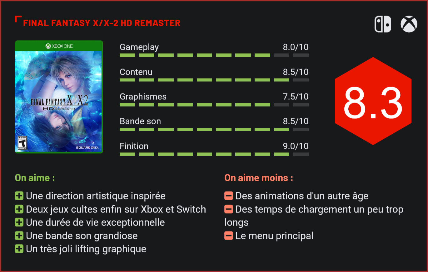 Sortis initialement sur PlayStation 2, Final Fantasy X et Final Fantasy X-2 ont aujourd’hui droit aux honneurs d’une remasterisation sur Xbox et Switch. L’occasion pour les propriétaires de ces deux consoles qui étaient passés à côté de ces titres légendaires de redécouvrir deux RPG légendaires… Square-Enix poursuit son travail de remasterisation sur sa série Final Fantasy avec la sortie aujourd’hui d’un remaster de Final Fantasy X & X-2 sur Xbox One et Switch. Le jeu de rôle de Squaresoft avait déjà eu droit aux honneurs d’une remasterisation sur PS3, puis sur PS4. Un travail réalisé par un studio chinois, qui avait passé un très joli coup de pinceau sur l’œuvre originelle en retravaillant intégralement les modèles et en améliorant les jeux de lumière. Une fois n’est pas coutume, c’est un excellent travail de remasterisation que nous a fait le studio chinois Virtuos, qui affiche déjà un impressionnant pédigrée avec les précédents portages de FFX et FFXII sur PS4 et les portages de L.A. Noire et Dark Souls sur Switch. S’il n’est pas ici question d’un véritable remake, difficile de ne pas noter la grosse évolution sur le plan technique. Le studio chinois ne s’est pas contenter d’affiner quelques textures puisqu’il a entièrement retravaillé les modélisations des personnages, ajoutant au passage bon nombre de détails. Au niveau des mains par exemple, les doigts des personnages sont désormais tous séparés et le studio a poussé le travail jusqu’à modéliser des anneaux et différents éléments visuels qui permettent de renforcer encore l’immersion dans l’univers fantastique de Final Fantasy X. A cela, il faut ajouter de nombreuses retouches au niveau de l’éclairage, de la gestion de la lumière ou des effets de particules. Si l’on ne peut pas vraiment parler d’un remake, FFX/X2 HD Remaster est bien plus qu’un simple remaster d’un titre sorti sur PS2. On notera d’ailleurs qu’une bonne partie du travail de remasterisation avait déjà été opéré sur PS3 et PS4. Graphiquement, le jeu n’a pas évolué depuis la PS4. Par rapport à la version d’origine, ce portage sur Switch et Xbox One a toutefois bénéficié d’un sérieux upgrade. Remaster oblige, le titre a bien sûr droit à un lissage en bonne et due forme. Exit l’aliasing, les quelques ralentissements ou les pop-up de décors. Le titre a même eu droit aux honneurs d’un affichage en 16:9. Outre sur le plan graphique, ce remaster de Final Fantasy X & X-2 se révèle également très solide au niveau de sa bande son, avec des morceaux entièrement revus pour l’occasion – et d’une excellente qualité. En revanche, pas de fonctionnalités inédits ni d’accélérateur de temps, comme on pouvait en trouver sur les autres remasters. Si le principal intérêt de cette réédition reste la possibilité de pouvoir redécouvrir l’excellent Final Fantasy X, titre ô combien controversé pour sa direction très occidentale, mais également ô combien adulé, le remaster est également l’occasion de (re)découvrir un autre JRPG culte, l’excellent Final Fantasy X-2, qui se distinguait de son aîné par son orientation très girly avec son casting 100% féminin, sa bande son barrée et son univers ultra-coloré. On aime ou on déteste, une chose est sûre, difficile de critiquer Square-Enix pour l’incroyable prise de risque. Ceux qui avaient parcouru les deux jeux à l’époque auront d’ailleurs la bonne surprise de découvrir que les titres intègrent la version internationale des jeux et leurs bonus, en plus de modes de jeux inédits. Les fans découvriront ainsi un ajout majeur dans le mode Last Mission de FFX-2 qui transforme le titre de Square-Enix en un véritable dungeon-crawler à la Chocobo Dungeon, en proposant au joueur d’explorer un vaste donjon en se débarassant de ses adversaires. L’expérience de jeu diffère radicalement du jeu original, le joueur devant ici particulièrement gérer son équipement et l’usage de potions. Pour ce qui est de FFX, les joueurs découvriront le mode Creature Create, qui permet de capturer des monstres et les faire évoluer, en reprenant un peu le concept d’un jeu Pokémon, dans l’univers de Final Fantasy. Au final, difficile de trouver beaucoup de choses à redire sur ce remaster – de très grande qualité -, qui tourne parfaitement que ce soit sur Switch ou Xbox One. Le studio de développement chinois a réalisé un excellent travail de remasterisation sur PS3 et PS4 et livre un portage sur Xbox et Switch de très haute volée. Les deux titres ont certes un peu vieilli, mais n’en restent pas moins deux titres cultes et totalement atypiques avec leurs univers colorés et loufoques. A l’époque, Square-Enix avait été injustement critiqué pour sa prise de risque. Plus de 10 ans plus tard, beaucoup reconnaissent dans FFX un coup de maître, et sans aucun doute l’un des meilleurs volets de la franchise si pas même le meilleur pour certains. Le cas de FFX-2 est un peu différent. A condition d’accrocher à la direction, difficile toutefois de ne pas craquer pour le charme de Yuna et de toute sa bande. Une chose est certaine : si vous n’aviez jamais touché ni à l’un ni à l’autre, ce remaster mérite le détour, même au prix fort tant la qualité du travail accompli est exemplaire. Tout au plus lui reprochera-t-on son menu simpliste et ses temps de chargement encore un peu longuets – mais qui ont pourtant bel et bien été raccourcis.