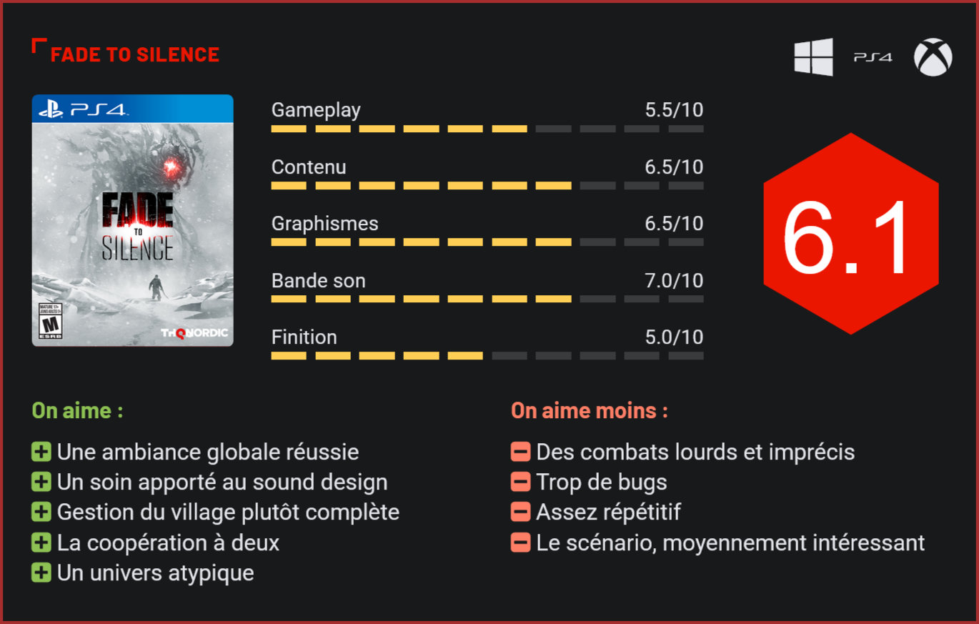 Après un an et demi d’early access, le jeu de survie du studio Black Forest Games sort enfin dans sa version définitive. Le survival se démarque par son univers atypique et son gameplay en partie inspiré de Dark Souls. Un concept séduisant sur le papier qui avait pourtant tout à prouver… Un hiver éternel Fade to Silence nous plonge dans un monde post-apocalyptique où la vie semble s’être éteinte après l’arrivée d’un long hiver. À travers les terres glacées, le joueur incarne Ash, un père de famille qui tente tant bien que mal de survivre avec sa fille dans cet environnement inamical. Une hostilité qui ne se limite pas à l’hiver glacial puisqu’un esprit maléfique plane sur les plaines, faisant apparaître des démons et corrompant les terres. Autant dire que la survie ne sera pas des plus simples. En mode exploration ou survie, l’aventure s’avère effectivement complexe puisqu’il faudra prendre en compte de nombreux aspects. La survie de notre personnage sera conditionnée par sa faim et sa température. Deux éléments vitaux auxquels le joueur devra prêter une grande attention, mais les maintenir à un bon niveau sera aisé. En effet, la gestion de la survie de notre personnage ne sera pas toujours simple. Si un bon repas et un bon feu font l’affaire – le joueur pourra en créer à tout moment tant qu’il dispose des composants -, rétablir sa santé sera compliqué étant donné que les potions ne servent (presque) à rien. Au final, la sieste sera le meilleur moyen de réchauffer et de remettre sur pied Ash. Ajoutons à cela les conditions climatiques hostiles (blizzard, éclipses) et voici le cadre dans lequel Fade to Silence plonge le joueur. Sauf que le titre ne s’arrête pas là. Si l’exploration et la survie représentent un grand pan du gameplay, la gestion aura également sa place dans le jeu puisque durant l’exploration, notre cher Ash pourra recruter les quelques survivants qu’il croisera. Une fois qu’ils ont rejoint son village, il faudra développer les infrastructures (habitation, forge, hutte de soin) et occuper les bonshommes. En plus de prendre soin de notre explorateur en herbe, les villageois demanderont également une attention particulière ; nourriture, température, occupation. Mais la survie de notre héros et de son village repose essentiellement sur l’exploration, seul moyen pour récolter des ressources et fabriquer de nouveaux objets de survie ou de défense. Parcourir les terres glacées sera également l’occasion pour Ash de découvrir quel mal sévit sur le monde et ce qu’il est vraiment arrivé à l’humanité. Confrontations lourdes et sans intérêt L’exploration sera quelque peu ralentie par les sbires envoyés par le « démon ». Le joueur pourra tenter de se faufiler sans se faire apercevoir ou préférer la confrontation, à ses risques et périls puisque les combats ne sont pas vraiment un point positif du jeu. Notre personnage s’avère assez lourd dans ses mouvements et ses armes (massue, hache, arc à flèche) ne font que peu de dégât en comparaison aux démons. D’autant que chaque coup grignotera rapidement la barre d’endurance d’Ash. Il faudra donc suivre une certaine chorégraphie pour venir à bout de ses créatures horrifiques ; frapper, reculer, attendre que son endurance se régénère et rebelote. Pendant ce temps, on peut tenter d’éviter les coups, mais la réactivité d’Ash ne s’avère pas des plus salvatrices. Si les confrontations déçoivent un peu, les monstres nourrissent l’ambiance du titre de Black Forest Games. En effet, le jeu veut instaurer une atmosphère maléfique et y arrive plutôt bien. Les terres sont esseulées et hostiles envers notre héros, les créatures ont une dégaine malfaisante et peuvent se mettre à courir pour exploser à côté de nous, mais la vraie patte du titre repose sur la présence permanente de la voix de l’esprit maléfique. Celui-ci suit en permanence les déplacements d’Ash et commente ses moindres faits et gestes. Des commentaires macabres et décourageants pour le joueur en tout cas puisqu’Ash ne semble pas y prêter attention, ce qui est dommage. Bien que Fade to Silence reprenne certains traits du jeu de gestion qu’il incorpore au survival, l’aventure se révèle rapidement répétitive. Les amateurs de gestion pourront tout de même trouver leur compte dans l’exploration et amélioration de leur village. Sinon, le mode coopératif pourra toujours égayer la partie. À noter qu’il est impératif d’avoir recruté au moins un habitant pour débloquer ce mode. Si on pouvait pardonner les quelques défauts du gameplay de Fade to Silence, la présence de nombreux bugs et crash lui désert, d’autant que le titre a été proposé en accès anticipé pendant un an et demi. Une bonne ambiance globalement Sans être d’une atrocité ou d’une beauté incroyable, Face to Silence reste agréable à l’œil. Rien de très révolutionnaire, mais on aurait du mal à cracher sur ses graphismes. En réalité, le titre de Black Forest Games est visuellement passable, notamment dans ses décors qui créent une vraie atmosphère glacée et pesante. Quant aux personnages, amis ou ennemis, ils sont correctement modélisés. On soulignera tout de même le travail réalisé sur le design des créatures maléfiques, même si elles ne sont pas d’une grande diversité. Du côté de l’ambiance sonore, on a quelque chose de très épuré qui correspond parfaitement à l’atmosphère globale. Quelques bruits de pas, des animaux, des objets, un silence relatif qui souligne justement parfaitement la présence des monstres à proximité. En effet, les monstres se manifestent par le bruit avant d’être dans notre champ de vision. Un aspect qui apporte vraiment un côté angoissant d’autant qu’il s’agit de grognement ou de forte respiration. Conclusion Si le titre de Black Forest Games parvient à se créer sa 