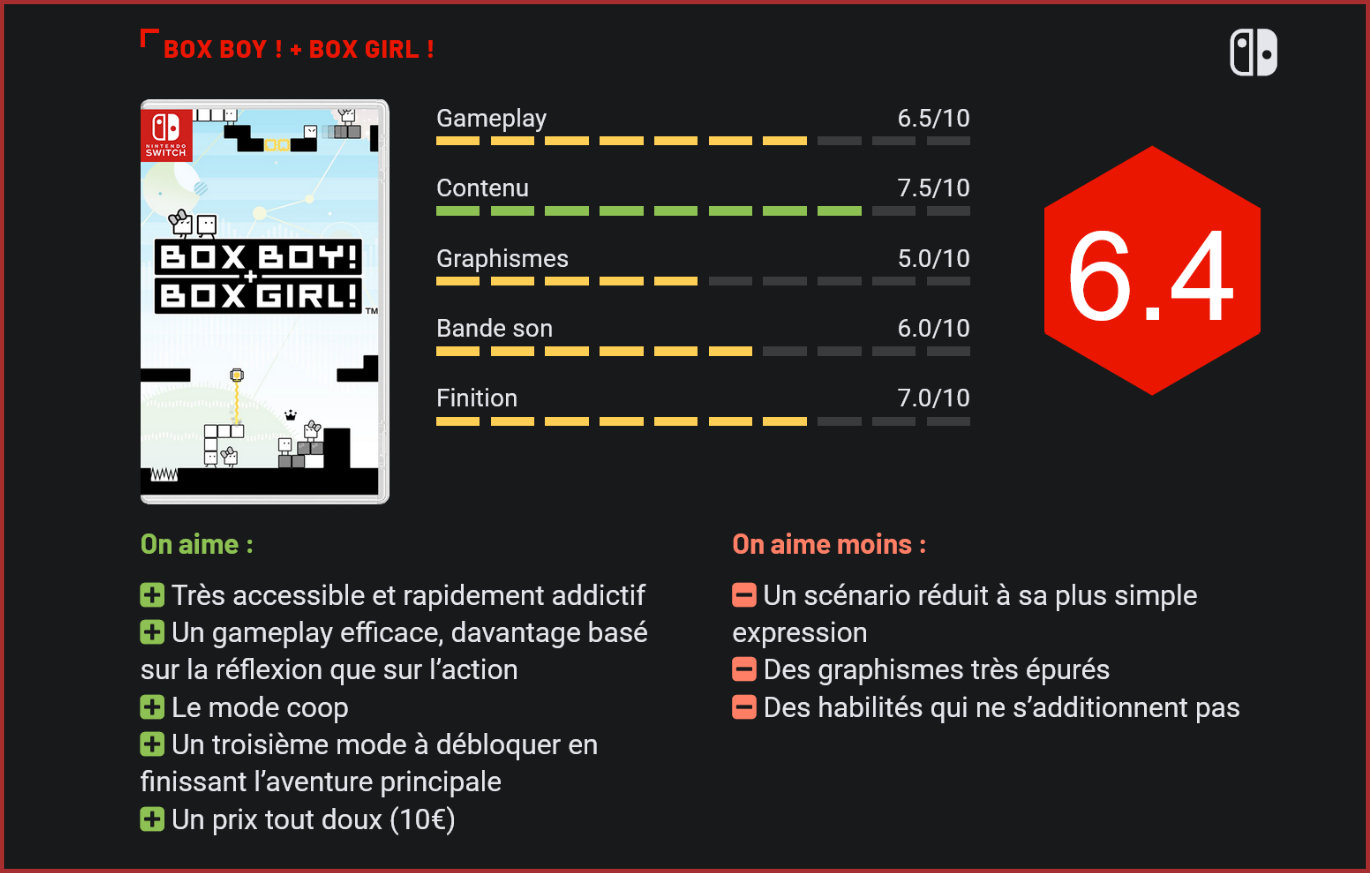 Le quatrième jeu issu de la saga Box Boy ! est disponible exclusivement sur Switch avec une nouvelle série de casse-têtes à résoudre à l’aide de carrés bien positionnés. Un titre visuellement minimalise, laissant toute esbrouffe à part pour privilégier la réflexion. Faisant suite aux jeux Box Boy ! sortis sur 3DS, cette nouvelle sortie exclusive sur Switch accueille Qucy, la compagne du héros carré Qbby qui devront tous deux retrouver leurs enfants, disparus suite à une pluie de météores qui a plongé leur univers dans l’obscurité. Un simple prétexte pour enchaîner de courts niveaux de plateforme durant lesquels leur capacité à créer des blocs sera mise à contribution. Box Boy ! + Box Girl est en effet un pur jeu de réflexion où il faut atteindre la porte de sortie de chaque niveau en gravissant divers rebords et obstacles, en évitant les multiples pièges et dangers (précipices, piques, électricité) et/ou en activant des interrupteurs. Pour ce faire, votre avatar peut sauter et, surtout, déployer un certain nombre de blocs (le nombre peut varier dans chaque niveau) qui serviront à former des marches, une plateforme, un bouclier ou encore un crochet pour progresser en toute sécurité. Deux modes sont disponibles dès le lancement du titre, l’aventure solo et un mode coop. Dans l’aventure principale on peut choisir d’incarner le personnage de Qbby ou de Qucy à l’entrée de chaque monde, tous deux disposant exactement des mêmes capacités. Chaque monde présente de nouvelles habilités et subtilités pour progresser dans des niveaux de plus en plus complexes. Un principe simple et efficace malheureusement pas exploité à fond car les nouvelles capacités apprises ne seront presque jamais exploitées toutes ensemble au sein du level design, se cantonnant souvent à un seul monde. S’il n’est pas difficile d’arriver au bout du jeu (on peut recommencer autant de fois que l’on veut et de nombreux checkpoints sont prévus), avec en sus un système d’indice disponible pour la résolution de chaque obstacle, il sera en revanche plus ardu de parvenir à ramasser toutes les couronnes présentes sur les différents parcours ainsi que de finir le tout en utilisant le moins de blocs possible. Outre la satisfaction de s’être bien trituré les méninges, la résolution de ces défis procure des médailles supplémentaires qui permettent d’acheter (aléatoirement) des éléments de customisation délirants pour les personnages au sein de la boutique, qui contient également des objets d’aide, une série de mini-jeux éclate-ballons, des musiques ou des strips-blocs. Des éléments certes un peu futiles mais qui ont le mérite de rendre l’aventure plus fun. Ce qui est aussi indéniablement le cas du second mode de jeu, proposant une aventure alternative en coopération pour résoudre des puzzles en binôme avec un ami ou, et cela paraît parfaitement adéquat, avec sa partenaire. Ce mode peut néanmoins être parcouru en solitaire, mais cela en enlève toute sa saveur. Même si le principe et les habilités restent les mêmes qu’en solo, l’approche des puzzles en duo change la donne, ce qui offre un peu de variété tout en allongeant agréablement la durée de vie globale du jeu, qui contient pas moins de 270 niveaux pour se creuser les méninges comme il se doit. Ce nombre très honorable est atteint avec l’aide d’un troisième mode, qui se débloque lorsque l’aventure principale est achevée. Dans celui-ci, on progresse dans des niveaux sous l’apparence, rectangulaire cette fois, de Qudy. Le principe reste le même mais cette forme, forcément plus allongée, change là aussi la façon de terminer les parcours, présentés sous forme de nouveaux puzzles. Visuellement, le titre reste très minimaliste, autant dans l’aspect de ses personnages que de ses décors, très épurés. On reste proche de l’aspect des précédents titres de la saga sortis sur 3DS, avec une colorimétrie principalement basée sur le noir et blanc pouvant rappeler l’époque de la Game Boy. Il en est de même pour l’animation, plutôt sommaire mais au final suffisante. Pas sûr néanmoins que cela plaira à tout le monde. Conclusion Pour une petite dizaine d’euros, voici un puzzle game efficace et addictif idéal pour de courtes sessions de jeu dans le train ou le métro. Derrière son apparente simplicité, c’est un jeu de réflexion malin et parfois complexe qui se dévoile, surtout si l’on cherche à se creuser les méninges pour atteindre le score parfait. Accessible et réflexif sans être prise de tête, Box Boy ! + Box Girl ! ne réinvente pas vraiment sa formule mais s’avère être un puzzle game idéal pour se changer les idées et est très agréable à partager grâce à un mode coop fun.