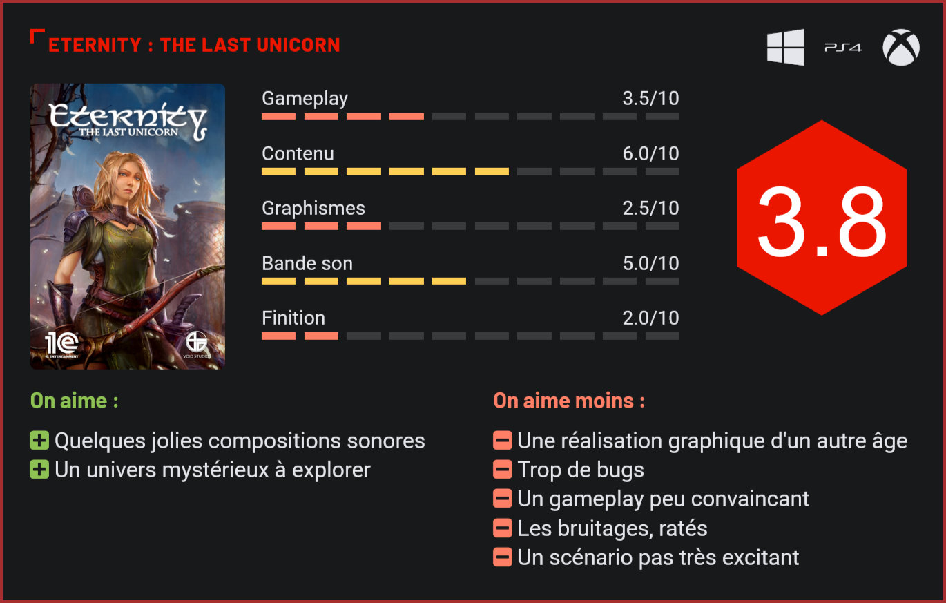 Développé par un petit studio indépendant, Eternity : The Last Unicorn est un ambitieux action-RPG dans la veine des Titan Quest et autres Diablo. Le titre édité par 1C Company a-t-il les atouts pour séduire les amateurs du genre? C’est ce que nous allons tenter de voir dans notre test complet… Développé par Void Studios, Eternity : The Last Unicorn reprend dans les grandes lignes le concept d’un Diablo ou d’un Titan Quest. A la différence de ces deux projets, le titre a été développé par une toute petite équipe avec des moyens très limités… Et cela se voit d’entrée de jeu au niveau de la réalisation graphique. Le titre édité par 1C Company aurait sans doute pu tourner sur une PS2. Les modélisations sont simplistes, certaines textures manquantes, les bugs nombreux et les animations d’un autre âge. Une chose est certaine : on ne craquera pour lui pour ses graphismes. En réalité, nous aurions même tendance à penser que The Last Unicorn fait partie des plus laids jeux sortis sur Xbox One et PS4. L’ennui, c’est que le titre n’est pas forcément très intéressant non plus. L’univers atypique du jeu montre vite ses limites. On nous parle d’une dernière licorne qu’il faut impérativement sauver pour garantir à son peuple l’immortalité. Dans la peau d’un elfe, le joueur devra donc se lancer en quête d’une chimère. Il rencontrera dans son voyage des vikings, qui se joindront à sa quête. Le jeu s’inspire en grande partie de la mythologie nordique. L’ennui, c’est qu’il ne creuse que très peu les enjeux de cet univers. Les personnages n’ont aucune personnalité, les dialogues trop simples et le background pas assez développé. Contrairement à un Diablo, Eternity ne donne que très peu de liberté au joueur. On se contentera la plupart du temps d’avancer dans des décors vides en massacrant ses adversaires. Hyper-linéaire, scripté et peu engageant, Eternity montre très vite ses limites. Pour ne rien ajouter à notre malheur, la caméra se gère d’une façon absolument désastreuse. Il faudra de ce fait continuellement la replacer pour pouvoir suivre le cours de l’action. Ultra-rigide, le personnage principal est également abominable à contrôler. Les déplacements sont imprécis, les combats peu excitants et le level-design très simple du jeu ne fait que confirmer ces très mauvaises premières impressions. Pire, le jeu d’1C Company est truffé de bugs. Il n’est pas rare de voir un ennemi traverser une paroi, vous infliger des dégâts alors que son coup ne vous touche pas, voire effectuer un déplacement de plusieurs mètres d’un seul coup, suite à un bug. Il faudra beaucoup de patience pour en venir à bout. On notera au passage qu’il faudra environ une quinzaine d’heures pour en faire le tour, ce qui reste relativement peu par rapport aux autres jeux du genre. Au niveau de la bande-son, le jeu d’1C Company ne s’en sort pas si mal avec des morceaux plutôt inspirés, qui permettront de s’immerger pleinement dans l’univers du jeu. Le joueur sera toutefois très vite rattrapé par la dure réalité puisqu’Eternity ne dispose d’aucun doublage. Les bruitages font également partie des plus surréalistes que nous ayons pu entendre. L’enfer est pavé de bonnes intentions et Eternity : The Last Unicorn en est la preuve. On sent que les développeurs voulaient nous livrer un titre riche en contenu. L’ennui, c’est que les très petits moyens du studio ne correspondaient pas à ses ambitions. Conclusion Mal fignolé, Eternity : The Last Unicorn sera assurément une grosse déception pour les amateurs d’action-RPG. Sans doute trop ambitieux, le titre d’1C Company souffre d’un gameplay beaucoup trop rigide, d’une réalisation graphique datée et d’un nombre incalculable de bugs qui viennent considérablement entacher le constat. Si sur le papier le jeu avait tout pour séduire avec son univers atypique, le résultat n’est pas du tout à la hauteur. Une chose est certaine : les amateurs du genre trouveront sans trop de difficulté de biens meilleurs jeux à explorer…