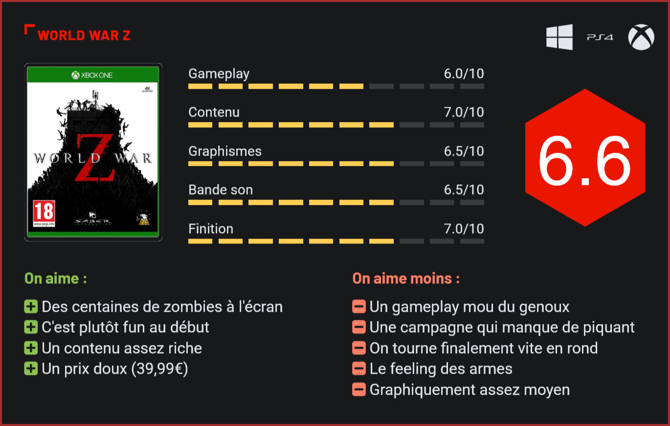 Développé par les créateurs de TimeShift et de Spintires:Mudrunner, World War Z n’était pas vraiment attendu comme le messie par les amateurs de TPS. Le titre de Saber Interactive pourrait toutefois séduire les fans de Left-4-Dead. Le pédigrée de Saber Interactive ne laissait pas vraiment présager le meilleur pour cette adaptation très libre de World War Z. En copiant purement et simplement la recette des Left-4-Dead, le petit studio de développement parvient toutefois à nous livre un titre d’une rare efficacité en coopération. Oubliez le mode solo, World War Z est un titre pensé pour la coop’, qui se joue de préférence avec des amis. Si vous aviez aimé à l’époque Left-4-Dead, vous devriez logiquement apprécier le divertissement – malgré ses multiples petits défauts. La contextualisation reste ici minimaliste. N’espérez pas vous emballer pour le scénario du jeu. Saber Interactive exploite simplement une licence juteuse et s’inspire – partiellement – des environnements du film, en proposant au joueur d’explorer les rues de New-York, de Moscou, Jérusalem et Tokyo. Des environnements atypiques qui confèrent au jeu un certain cachet. On lui reprochera toutefois d’entrée un certain manque de personnalité. Car World War Z n’est finalement ni plus ni moins qu’un ersatz de Left-4-Dead couplé à The Division. Du premier, il reprend le concept, les différents types d’ennemis, la progression des missions. Du second, il s’inspire du gameplay et reprend la vue à la troisième personne. Pas de FPS ici mais un TPS, qui, en soi, n’est pas forcément très convaincant. Si la maniabilité ne pose globalement pas de problème, on regrette un vrai manque de sensations, notamment durant les gunfights, qui restent très mollassons. Il ne faut pas s’attendre ici à de grosses surprises. World War Z reste un TPS très générique, qui se joue en ligne droite. L’aventure proposera d’accomplir une succession d’objectifs sans grand intérêt, se limitant la plupart du temps à aller d’un point A à un point B et à actionner l’un ou l’autre interrupteur. Ne vous attendez pas à être sorti de vos habitudes par des passages épiques, il n’y en a pas à l’exception de quelques pyramides de zombies et de hordes qui se jetteront sur vous et entrecouperont de plus petits gunfights de séquences plus musclées. Pour affronter ces monstres, vous aurez droit à un arsenal lourd, et pourrez utiliser mitrailleuses, shotguns et incontournables bazookas. La physique des corps, l’IA et la mise en scène restent toutefois basiques. S’il est très fun les premières minutes de jeu, World War Z montre donc vite ses limites. La bonne nouvelle, c’est que si le principal mode de jeu n’est pas très excitant, le contenu du jeu est plutôt généreux et les modes de jeu abondent – et offrent même beaucoup plus de fun. On dénombre au total 5 modes de jeu complémentaires, dont un mode Player vs player qui opposera deux équipes de quatre joueurs, qui devront s’affronter tout en massacrant les nombreux zombies qui leur foncent dessus. Amusant. Rien de bien transcendant toutefois ni de très original. On apprécie en revanche la dimension RPG donnée par le studio à son titre. World War Z propose en effet de faire évoluer son personnage en réalisant différents défis en cours de partie, lesquels permettront de débloquer des capacités de votre personnage ou de votre équipe. Un concept intéressant, et parfaitement exploité par les développeurs. Au final, s’il est loin d’être parfait, World War Z se révèle être un titre plutôt convaincant, surtout pour le prix auquel il est vendu (39,99€). Côté réalisation, le constat est également mitigé avec des décors variés, quelques jolies idées graphiques (comme les montagnes de zombies), mais des modélisations relativement grossières, des animations d’un autre âge et l’impression constante de jouer à une petite production sans grande ambition. La réalisation sonore est du même niveau : efficace, mais pas forcément convaincante, avec des morceaux qui ne resteront pas dans les esprits et des bruitages tout juste corrects. Conclusion Attendue au tournant, cette adaptation très libre du film et du roman de Max Brooks parvient à séduire grâce à la générosité de son contenu et le fun qui s’en dégage, lorsqu’on y joue entre amis. Massacrer des hordes de zombies est un plaisir que l’on ne se refuse pas. D’autant plus que le jeu est proposé à un prix défiant toute concurrence. Pour autant, difficile de ne pas voir dans ce World War Z un ersatz de Left-4-Dead. Pratiquement identique au jeu de Turtle Rock dans son concept, le jeu de Saber Interactive peine à convaincre au niveau de sa réalisation et de son gameplay, pas très excitant malgré la présence de montagnes de zombies. A petit prix, et à condition d’avoir quelques amis sous la main, World War Z n’en reste pas moins un bon divertissement.