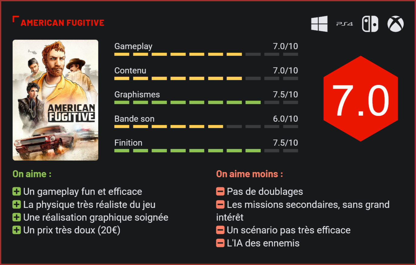 Imaginé par d’anciens développeurs de TimeSplitters et Crysis, American Fugitive est un petit projet indépendant plutôt ambitieux qui propose ni plus ni moins qu’une expérience à la GTA-like, façon old-school. Reprenant pratiquement à l’identique la recette d’un GTA Chinatown Wars, American Fugitive est un jeu d’aventure en open-world à l’ancienne, qui se distingue de son modèle par son scénario travaillé (mais malheureusement très creux). Accusé (à tort) du meurtre de son paternel, le joueur devra tenter de prouver son innocence en récoltant des preuves dans une petite bourgade américaine. Entre les missions principales – qui font avancer le scénario – et les missions secondaires – qui apportent un peu de diversité avec courses, racket et vols -, American Fugitive propose une expérience de jeu très fun à l’ancienne dans un gigantesque bac-à-sable. D’entrée de jeu, on regrettera toutefois le manque de moyens qui se fait ressentir dès les premières minutes de jeu. La mise en scène est minimaliste avec des bulles qui font apparaître les dialogues, zéro cinématique et pas de doublages non plus… Côté réalisation en revanche, le titre surprend agréablement avec ses décors soignés, ses jolis effets visuels et surtout sa physique ultra-réaliste. Côté gameplay, American Fugitive se révèle être un jeu très fun à prendre en main, et surtout qui repose sur des bases solides, avec des séquences d’exploration et de loot en “vue du dessus”, des courses-poursuites tendues en voiture, un peu d’infiltration, des compétences à développer via un arbre et plein de secrets à découvrir dans ce vaste monde. Ce qui marque d’entrée de jeu, c’est la façon brillante avec laquelle le studio est parvenu à développer son open-world. Le terrain de jeu est non seulement très vaste mais également très bien fichu, et les interactions sont nombreuses. Notre personnage pourra ainsi se déguiser à loisir avec tous les vêtements qu’il trouvera, fouiller les habitations, réaliser des hold-up, affronter les forces de l’ordre et plus encore. Pour autant, tout est loin d’être parfait dans ce petit univers. On regrettera ainsi la répétitivité des missions secondaires – ou tout simplement leur manque d’intérêt -, l’IA désastreuse des ennemis, ou simplement certaines séquences de jeu très mal réalisées, qui montrent une fois encore les limites du budget du petit studio. Par exemple, il est possible d’entrer dans des habitations pour les fouiller. Dès que le joueur entreprend cette action, il voit apparaître à l’écran un plan de la maison, et devra alors choisir d’explorer pièce par pièce en cliquant sur la pièce. Le personnage n’apparaît pas à l’écran et la séquence de jeu est d’une lenteur abominable. Il est dommage qu’il n’ait pas été possible d’explorer en temps réel l’habitation, avec de nouveau une vue du dessus… Pour autant, difficile de cracher dans la soupe. Certes, American Fugitive a ses petits défauts, mais pour une toute petite production, vendue 20€ en numérique, le titre est plutôt une bonne surprise. Il parviendra même à vous occuper quelques heures entre deux parties d’un plus gros blockbuster. Conclusion American Fugitive est l’exemple typique du petit jeu indépendant que l’on n’attendait pas vraiment au tournant et qui parvient pourtant à agréablement nous surprendre avec sa réalisation soignée, son gameplay calqué sur celui du premier Grand Theft Auto et ses séquences de jeu très funs. Si vous avez adoré Chinatown Wars, American Fugitive vous plaire très certainement. Ses multiples défauts – de l’absence de doublages à ses missions secondaires sans grand intérêt et certaines séquences de jeu bâclées – l’empêcheront toutefois d’accéder au rang d’incontournable, malgré son énorme potentiel. Une chose est sûre : si vous cherchez un petit divertissement sympa entre deux parties de Mortal Kombat ou de Rage 2, American Fugitive est fait pour vous!