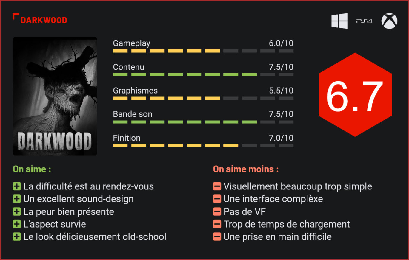 Sorti il y a près de deux ans sur PC, Darkwood a finalement droit à une sortie sur consoles, pour le plus grand bonheur des amateurs de rétrogaming puisque ce titre délicieusement old-school s’inspire ouvertement des classiques du genre. Imaginé par le petit studio polonais Acid Wizard Studio, Darkwood est un titre horrifique old-school axé sur la survie qui était initialement sorti en 2014 sur PC, en accès anticipé, et avait vu son développement se boucler en 2017 sur PC. Deux ans plus tard, le jeu débarque sur consoles dans une version intégrale qui réjouira les amateurs de rétrogaming. S’il ne s’agit pas à proprement parler d’un remake, Darkwood reprend tous les éléments des Survival à l’ancienne, et adopte un style graphique volontairement old-school. L’aventure prend place en 1987, en Union Soviétique, dans une petite bourgade qui a été envahie par les ténèbres. Le joueur devra tenter de découvrir ce qui s’est passé dans le village en résolvant des énigmes et en explorant les environs. Particularité de Darkwood : les développeurs ont axé une grosse partie du gameplay sur la peur et la survie. Le joueur devra donc penser à s’alimenter régulièrement et à éviter soigneusement les affrontements avec d’effrayantes créatures qui hantent les lieux. Délicieusement mystérieux, le scénario du jeu place le joueur au cœur d’une intrigue dans laquelle il se sentira profondément impliqué. On retrouve dans Darkwood tous les éléments qui ont fait le succès des vieux point & click, avec un inventaire complet, un système de craft indispensable pour progresser dans l’aventure et des énigmes parfois très coriaces. On notera d’ailleurs d’entrée de jeu que Darkwood ne s’adresse pas à n’importe qui. D’une part compte tenu de son modèle très old-school, qui le destine de préférence aux vieux de la vieille, et d’autre part par sa difficulté. Vous allez ici réellement souffrir. D’une part, parce que les morts sont impitoyables. En difficile, la mort est définitive. En difficulté moyenne, vous perdrez une partie de votre butin à chaque décès, ce qui forcera le joueur à être ultra-prudent dans chacune de ses décisions. D’autre part, parce que le jeu est avare en aides et l’interface reste complexe à utiliser. La carte du monde par exemple ne montre pas votre emplacement réel, juste des indices de localisation. Le joueur devra donc constamment réfléchir pour progresser dans le jeu. Si la vue du dessus n’aide pas à l’immersion, elle a le mérite d’apporter un peu de complexité aussi à un jeu qui ne renie jamais ses origines. En dépit de l’absence d’immersion, on notera tout de même que les frissons sont garantis dans Darkwood. D’une part, grâce à l’incroyable travail réalisé sur l’immersion sonore, avec des musiques angoissantes, des bruitages stridents et un sound design excellent. D’autre part, grâce à l’extraordinaire talent de level-design des développeurs, qui ont brillamment pensé leur jeu. Les sursauts seront nombreux, et c’est l’un des nombreux charmes de Darkwood. Mélangeant survie, séquences plus musclées, exploration et énigmes, le titre d’Acid Wizard Studio propose un cocktail plutôt rafraîchissant qui devrait facilement séduire les amateurs de rétrogaming. On lui regrettera toutefois quelques grossiers défauts : de l’absence de traductions françaises à son interface trop complexe, ses contrôles douteux (notamment pour les combats, beaucoup trop lourds), sa vue qui gâche un peu le plaisir, ses graphismes d’un autre âge ou ses trop nombreux temps de chargement. Oui, Darkwood est un plaisir coupable, mais un plaisir qui est malheureusement loin de se laisser déguster facilement. Conclusion Intelligent, effrayant et diablement efficace, Darkwood est un titre à la croisée des genres qui réjouira les amateurs de Survival old-school. Sa bande sonore terrifiante immergera pleinement le joueur dans un univers glaçant de réalisme. Le plaisir de jeu est toutefois gâché par une réalisation médiocre, des temps de chargement longuets et une prise en main complexe. A l’image d’un Dark Souls, Darkwood est un titre qui n’est clairement pas à mettre entre toutes les mains, à la fois délicieusement savoureux et terriblement frustrant. Mieux vaut donc visionner quelques vidéos avant de craquer!