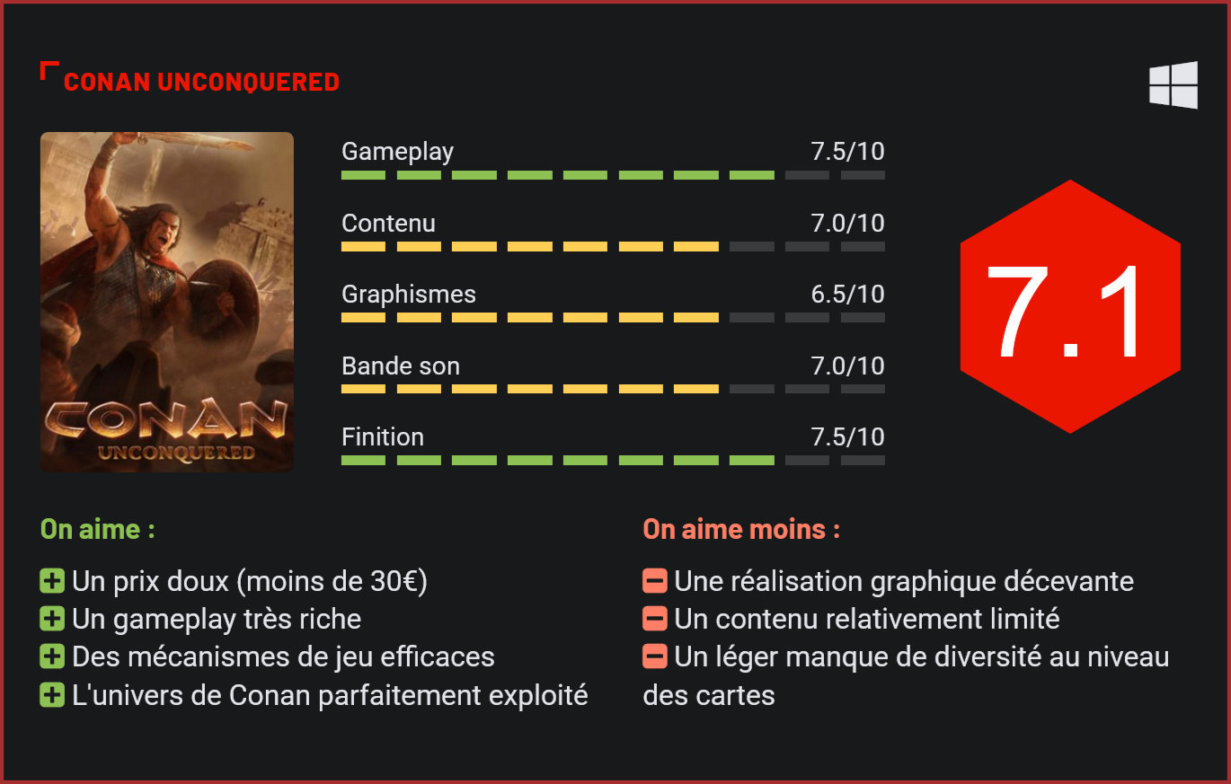 Après Conan Exiles, Funcom continue à étendre l’univers de Conan le Barbare avec Conan Unconquered, un RTS atypique qui s’inspire ouvertement de l’excellent They are a Billions pour se démarquer des autres productions. Développé par un vétéran de l’industrie – Petroglyph, auteur notamment de Star Wars : Empire at War et de deux épisodes de la franchise Panzer General, Conan Unconquered était pour le moins attendu au tournant par les fans de Conan. Il faut dire que le très sympathique Conan Exiles avait brillamment redonné ses lettres de noblesse à la franchise, après des années d’errance. Développer un jeu de stratégie dans l’univers de Conan était un pari risqué, même pour un studio comme Petroglyph. Et pour cause puisque l’univers brutal de Conan est très difficile à transcrire en jeu vidéo. C’est la raison pour laquelle le studio de développement a opté pour une approche peu conventionnelle en mélangeant les genres. Conan Unconquered n’a pas grand chose à voir avec un Age of Empires. Il s’inspire en revanche très clairement de l’excellent They are a Billions, un titre qui mélangeait stratégie en temps réel, tower-defense et survie. Pas question ici de partir à la conquête des campements adverses ni d’explorer les environs. Le gameplay entier du jeu repose sur la défense de son camp. Ceci étant dit, on est très loin des jeux de stratégie mobiles à la Clash of Clans. Chaque partie suivra le même déroulement. Le joueur devra survivre à des vagues d’adversaires, et entre chaque attaque, renforcer sa base, ses troupes, gérer son économie et l’expansion de sa cité. La partie débutera avec la construction de sa base. Il faudra partir à la recherche de ressources, mettre sur pied des murailles pour protéger son territoire, dresser des tours et commencer à amasser les ressources. Sur ce point, Conan Unconquered reprend la formule des RTS traditionnels, sans forcément briller, ni décevoir. Dès que la première vague d’ennemis arrive, le joueur prend conscience de l’énorme potentiel du jeu, beaucoup plus technique qu’il ne pourrait y paraître. Car pour espérer survivre à chaque partie, il faudra faire preuve de ruser et pleinement maîtriser son économie. Chaque nouvelle vague sera plus forte. Dès lors, il faudra sans cesse renforcer ses infrastructures, recruter de nouvelles forces et songer à augmenter ses capacités de production. Conan Unconquered impressionne par la diversité de son bestiaire, les impressionnantes troupes qui se ruent à l’assaut de vos murailles et sa profondeur de jeu. On notera d’ailleurs que le titre de Petroglyph est étonnamment difficile. Mieux vaudra donc s’accrocher pour le boucler! Mais pour ceux qui prendront la peine d’aller jusqu’au bout, une bande dessinée de 100 pages est à débloquer ! Un cadeau inestimable pour les fans de la franchise. Bien sûr, le fait que le jeu soit à 100% axé sur la défense peut se révéler frustrant. Mais il est important de garder à l’esprit que c’est justement ce qui fait tout le charme de ce petit jeu, sans prétention. On notera d’ailleurs que Conan Unconquered est vendu sous la barre des 30€ sur PC. Sur le plan technique, le jeu de Petroglyph ne convainc pas vraiment, la faute à un budget trop serré. Si le jeu n’est pas “hideux”, il est loin de briller face aux autres RTS. Les décors sont suffisamment variés pour nous tenir scotché à notre écran, les modélisations sont correctes, mais la plupart des modèles 3D manquent cruellement de détails et il ressort globalement un curieux sentiment d’un manque de vie à cet univers, qui ressemble à s’y méprendre à un mod d’un Age of Mythology. La bande sonore ne brille guère elle non plus, malgré quelques morceaux entraînants et des bruitages efficaces. Les morceaux ont tendance à très vite tourner en boucle, Conan répète inlassablement les mêmes phrases et on en viendrait vite à couper complètement le son pour se retrouver au calme. Pour le reste, Conan Unconquered parvient à convaincre sans jamais totalement surprendre. Les mécanismes du jeu sont efficaces, mais Conan Unconquered manque réellement d’ambition, tant au niveau de sa réalisation que de son concept. Conclusion Reprenant la formule de They are a Billions, Conan Unconquered se positionne comme un RTS atypique, qui parvient à tirer son épingle du jeu grâce à son originalité, la richesse de son univers et son tout petit prix. En mêlant stratégie en temps réel et survie sur fond de tower-defense, Petroglyph est parvenu à créer un titre qui se démarque fortement des autres RTS. L’univers de Conan est toujours aussi séduisant, mais le jeu montre relativement vite ses limites, la faute à un concept qui ne parvient pas vraiment à se renouveler et à un mode coop’ qui ne tient pas toutes ses promesses.