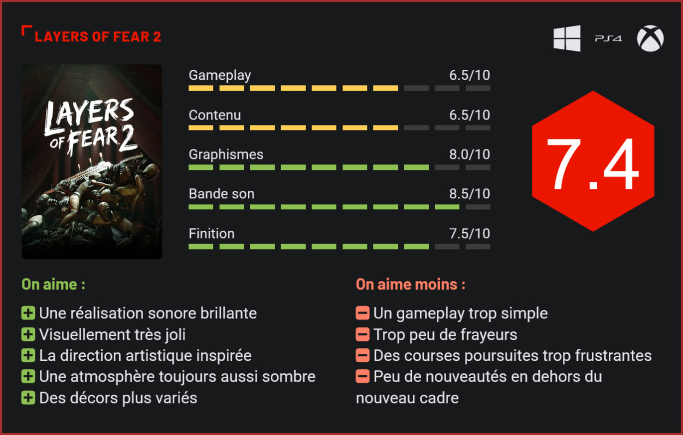 Quatre ans après le premier volet, le studio polonais bloober nous livre enfin la suite. Les fans l’auront noté : le changement de décor est radical puisque Layers of Fear délaisse son manoir pour nous emmener pour une promenade au large… Le changement de décors est radical pour cette suite au très sympathique Layers of Fear, qui reprend dans les grandes lignes tout ce qui a fait le succès du premier volet tout en osant nous proposer une atmosphère radicalement différente puisque l’on quitte ici le manoir du premier volet pour une promenade en mer, à bord d’un majestueux paquebot au bord duquel un curieux film est en train d’être réalisé… Si le scénario du jeu se révèle efficace, c’est surtout par son atmosphère que le titre de Bloober Studio se démarque. Très mystérieux, l’univers du jeu est travaillé à l’extrême avec ses superbes tableaux et atmosphères du passé. Layers of Fear 2 gagne en diversité par rapport au premier volet, puisqu’il propose cette fois une grande diversité de décors, en intérieur comme en extérieur. La direction artistique du jeu est d’ailleurs superbe. Côté gameplay aussi, Layers of Fear 2 mêle plus efficacement les genres, avec une grosse partie exploration / énigmes, un soupçon de frayeurs et quelques courses-poursuites qui se révèleront toujours aussi agaçantes. Paradoxalement, le jeu fait toutefois moins peur que son ancêtre, la faute en partie à un cadre plus coloré. Pour le reste, les développeurs n’ont pratiquement rien changé à la recette, qui demeure toujours aussi efficace. Layers of Fear 2 reste un excellent titre narratif, qui se démarque surtout par la richesse de son univers, son atmosphère et sa panoramas sublimes. Le jeu perd un peu en frisson, et les amateurs de Survival-horror le trouveront d’ailleurs en ce point très en-deçà de leurs attentes. Difficile toutefois de ne pas céder à ses charmes si vous avez aimé le précédent titre du studio, le très sympathique Observer. On pourra toutefois lui reprocher un manque flagrant d’ambition. Côté gameplay, les mécanismes restent les mêmes que dans le premier volet, avec des courses-poursuites extrêmement frustrantes – le joueur mourant systématiquement s’il n’emprunte pas le chemin défini par les développeurs -, des énigmes qui restent très (trop?) accessibles et des jump scares que l’on sent arriver de loin. Le cocktail reste très efficace, mais on a trop souvent l’impression d’avancer sur un rail et d’être tenu par la main… On notera d’ailleurs que le titre se boucle en moins de 5h top chrono. On appréciera en revanche la possibilité de recommencer plusieurs fois le jeu pour découvrir plusieurs fins différentes, selon les choix que l’on aura fait durant l’aventure. Dans le même ordre d’esprit, acclamons la bande sonore du jeu, absolument fantastique avec ses musiques d’ambiance traumatisantes, sa spatialisation du son excellente et ses bruitages terrifiants. L’immersion est totale. Reste à présent à croiser les doigts pour que le studio polonais se relève les manches et nous livre enfin un troisième volet à la hauteur de nos attentes. Conclusion Attendu au tournant, le nouveau Layers of Fear ne parvient pas vraiment à convaincre, la faute à un manque relatif d’ambition du studio et de nouveautés par rapport au premier volet. Pour autant, difficile de ne pas aimer l’ambiance de cette suite, qui retranscrit brillamment celle du cinéma des années 30 et propose un contexte aux antipodes de ce qu’on a l’habitude de voir. Sur le plan technique, Layers of Fear 2 est pratiquement irréprochable. Côté gameplay en revanche, le concept n’a pratiquement pas évolué et si la sauce prend, les sensations ne sont pas vraiment au rendez-vous. Inutile d’espérer sursauter dans cette suite, clairement moins effrayante que le premier volet. Passer à côté sans s’y intéresser serait toutefois une grossière erreur tant Layers of Fear 2 est une expérience narrative aboutie.