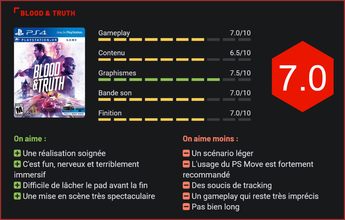 Parmi les expériences les plus marquantes au lancement du PlayStation VR, The London Heist a sans aucun doute été le titre qui aura le plus fait parler de lui. London Studio s’est inspiré de cette expérience pour nous livrer un jeu complet, répondant au nom de Blood & Truth. Parmi les rares exclusivités PS4 à voir le jour cette année, Blood & Turth était sans aucun doute le jeu le moins attendu du line-up. Le titre de London Studio se révèle pourtant être la bonne surprise de ce mois de mai, avec ses graphismes étincelants et son gameplay terriblement nerveux. Reprenant dans les grandes lignes le concept de The London Heist (un gros film d’action hollywoodien interactif, avec un scénario de blockbuster), Blood & Truth est un jeu de tir à la première personne dans la plus pure tradition des Time Crisis. Là où le titre de London Studio se démarque de ses nombreux concurrents, c’est par son budget de titre AAA, et son efficacité – le titre alternant phases de shoot, de courses-poursuites et d’escalade. Le cœur du jeu, ce sont bien sûr ses séquences de rail-shooter durant lesquelles le joueur devra tirer sur tout ce qui apparait à l’écran, de préférence avec le PS Move pour plus de précision. Au pad, les contrôles restent très approximatifs. De façon générale, on peut également noter quelques soucis de tracking. Même sur une grosse production, on se rend compte des limitations du hardware. Le PS VR reste un support imparfait et il est aujourd’hui encore très difficile de proposer un gameplay proposant une expérience parfaitement immersive. Pour autant, Blood & Truth n’en reste pas moins un très grand défouloir grâce en grande partie à son gameplay très nerveux. Les gunfights sont efficaces, les situations suffisamment variées pour nous tenir scotché à notre PS Move et le titre parvient même à nous surprendre avec un rythme haletant, notamment lors des séquences de courses-poursuites à bord de divers véhicules. Pour varier les plaisirs, les développeurs ont songé à intégrer diverses séquences de jeu qui permettront de ralentir un peu le rythme, avec un peu de crochetage par-ci et un peu d’escalade par là. Rien de très excitant en soi, mais cela a le mérite de faire un peu retomber la pression entre deux gunfights. Côté réalisation, le titre impressionne également avec des modélisations très réussies, une mise en scène excellente, de bons doublages et des animations faciales criantes de réalisme. On ne peut malheureusement pas vanter les mérites du scénario, beaucoup trop cliché et prévisible, qui a au moins le mérite de ne pas trop s’éterniser. Il ne faudra en effet compter que 4h pour voir le bout de l’aventure. Au final, l’expérience se révèle donc plutôt convaincante. Blood & Truth est un titre très fun à parcourir et qui a le mérite de bénéficier d’un budget confortable. Reste, qu’en dépit de l’amusement qu’il procure, le titre est loin d’être parfait, en raison principalement des limitations du hardware. Une chose est sûre toutefois : Sony est sur la bonne voie pour le PS VR… Conclusion On ne l’attendait pas vraiment au tournant, et pourtant, Blood & Truth est l’une des bonnes surprises de ce mois de mai 2019. Nerveux, fun et diablement immersif, le titre de London Studio est l’un des jeux en réalité virtuelle qui tire le mieux parti du PlayStation VR. Véritable hommage au cinéma d’action, le titre plonge le joueur dans un scénario de film à gros budget et parvient à varier suffisamment les plaisirs pour qu’on ne s’ennuie pas une seule minute. On regrettera toutefois quelques soucis de tracking, un scénario sans grande surprise et quelques passages en deçà, qui nous montrent encore une fois à quel point il est difficile de créer un bon jeu en réalité virtuelle…