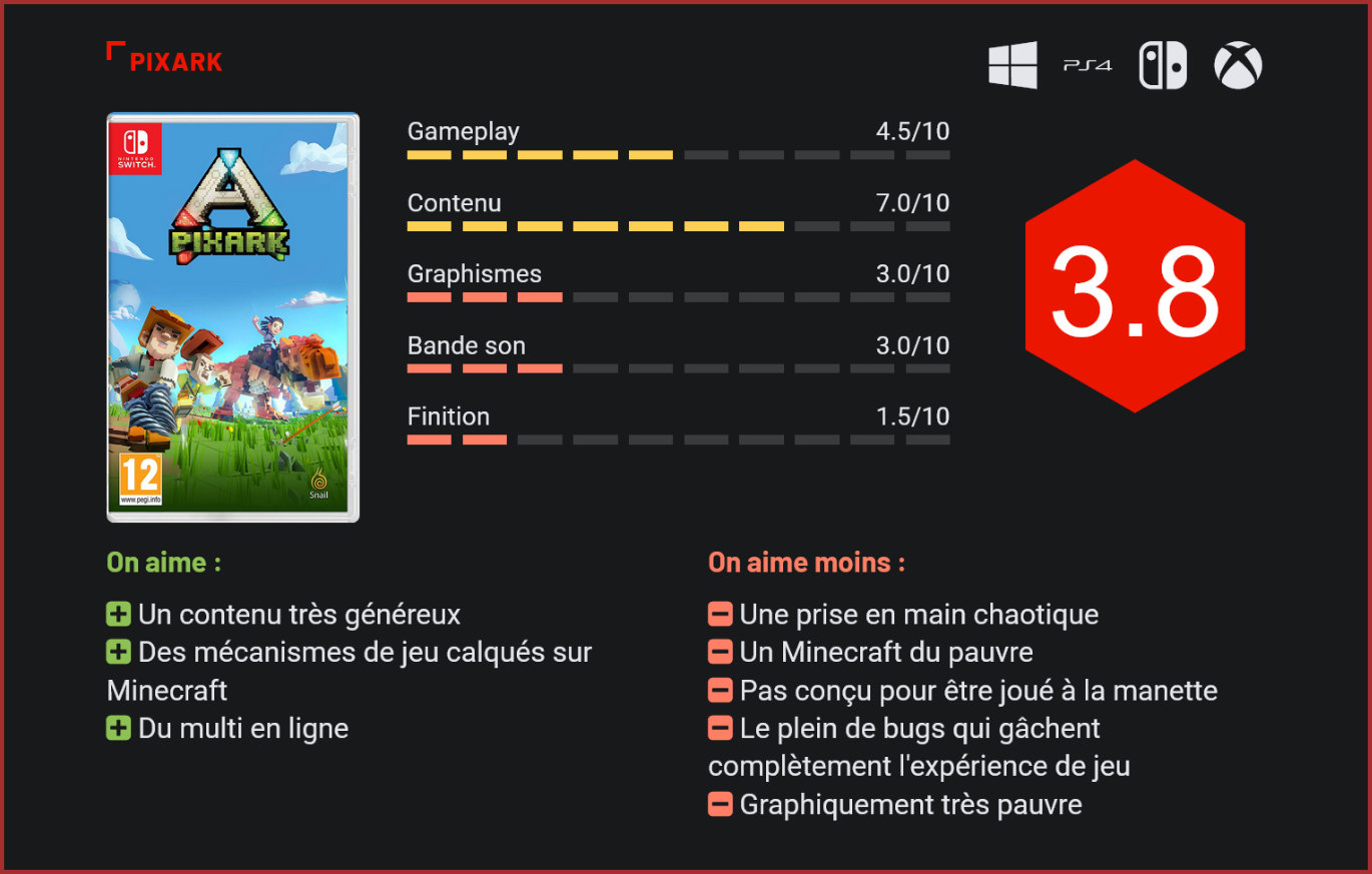 Surfant sur le succès de Minecraft, PixARK propose une expérience de jeu mélangeant craft, exploration et construction dans l’univers d’ARK. Snail Games tente le pari un peu fou de mélanger Minecraft et ARK dans un jeu de construction unique qui reprend pratiquement à l’identique la recette de Minecraft. Concrètement, et pour résumer le principe de PixARK en quelques mots : c’est du Minecraft avec un joli skin ARK. Pour ceux qui ne connaîtraient pas cette licence, il s’agit d’un jeu de survie en open-world, dans un monde infesté de dinos et de créatures préhistoriques. Le concept aurait pu se révéler séduisant, sauf que dans la pratique, on a précisément l’impression de rejouer à Minecraft, dans un univers inspiré d’ARK. Largué dans un vaste terrain de jeu, le joueur devra récolter des ressources, crafter des objets et surtout des armes et commencer à construire des abris pour se protéger des créatures qui habitent ce vaste monde. Pour espérer survivre à ce monde dangereux, il vous faudra grimper rapidement en niveau et apprendre des recettes qui vous permettront de créer de nouveaux objets plus puissants. Particularité de PixARK : il est possible de dompter toutes les créatures et dinosaures qui peuplent l’île. Pour ce faire, il faudra toutefois apprendre à les connaître, et à connaître surtout leur régime alimentaire afin de les dompter. Par la suite, vous pourrez créer une selle et les chevaucher pour explorer de nouveaux environnements. Le concept est séduisant, mais dans la pratique, les contrôles se révèlent très approximatifs – tourner à 180 degrés est un véritable challenge en soi – le jeu ultra-répétitif et surtout, les multiples bugs qui gâchent complètement l’expérience de jeu. De l’IA calamiteuse des créatures, qui restent bloquées derrière un arbre aux bugs graphiques, en passant par les plantages du jeu, les freezes ou les éléments qui ne se débloquent pas, PixARK est une véritable calamité en matière de finition. Si vous y jouez sur console, vous aurez de surcroît droit à des contrôles encore plus laborieux dans les menus, qui ont très clairement été pensés pour le PC, et ont en outre été très mal traduits en français. Et puis, bien sûr, il y a la question de la réalisation graphique. S’il est difficile de noter un jeu dans la lignée de Minecraft sur cet aspect, il faut bien reconnaître que PixARK a tout de la copie du pauvre, avec ses décors qui pop-up sans crier gare, ses nombreux bugs graphiques et ses textures immondes. PixARK aurait pu être une excellente surprise, mais son univers n’a pratiquement aucun charme, la faute en grande partie à son budget ridicule. Sur le papier, le titre avait tout pour séduire : un concept séduisant, le mélange inattendu de Minecraft et de dinosaures, un contenu très riche, la possibilité de jouer à plusieurs sur un même serveur et des tas de fonctionnalités héritées de Minecraft. Dans la pratique, le résultat est malheureusement à des années lumières de ce à quoi on était en droit de s’attendre… Inutile de le préciser, que vous soyez fan d’ARK ou de Minecraft, mieux vaut éviter celui-là… Conclusion S’il avait tout pour séduire sur le papier, PixARK est malheureusement très loin de respecter sa feuille de route. Ce mélange improbable de Minecraft et d’ARK n’est ni plus ni moins qu’un clone très cheap de Minecraft, avec des dinosaures. Riche en contenu, le jeu de Snail Games souffre toutefois de contrôles laborieux, d’une finition abominable et d’une réalisation catastrophique. Le concept est certes séduisant, mais dans la pratique, difficile d’y trouver un quelconque plaisir tant les quelques atouts du jeu sont gâchés par une réalisation chaotique.