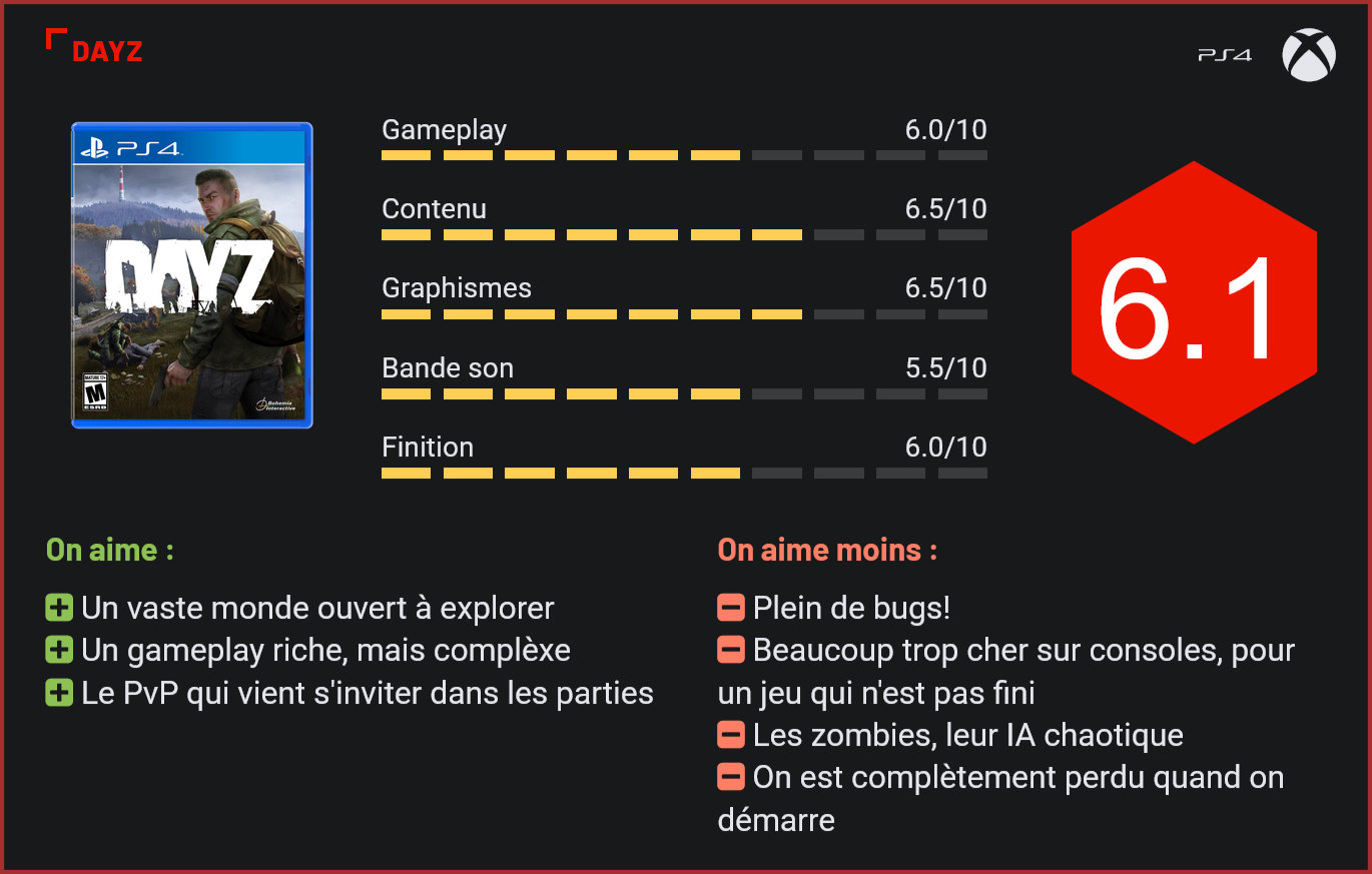 En développement depuis plus de six ans, DayZ tente aujourd’hui de partir à l’assaut des consoleux avec un portage très propre. Le jeu de survie de Bohemia Interactive – studio à l’origine des Operation FlashPoint et d’Arma – a-t-il les atouts pour séduire les propriétaires de PS4 et Xbox One? La réponse dans notre test ! En développement depuis 2013, DayZ est probablement l’un des projets les plus ambitieux de l’histoire du gaming et l’un des plus gros fiascos de ces dernières années. Ce titre, qui a démarré comme un projet de mod pour le jeu Arma de Bohemia Interactive s’est transformé au fil des années en un projet à gros budget. Il aura toutefois fallu des années de développement aux créateurs d’Arma pour boucler le projet et nous livrer enfin une version “finale” de son titre sur PC. Quelques mois plus tard, c’est aujourd’hui au tour des consoles de salon d’accueillir une version définitive du jeu. En six ans de développement, le jeu a bien sûr beaucoup évolué. Visuellement, il ne s’en sort d’ailleurs pas si mal du tout grâce à son nouveau moteur graphique, qui tourne parfaitement sur Xbox One et PS4. Sans être superbe, le jeu est plutôt agréable à l’œil. On est donc très loin de l’apparence un peau cheapos d’un simple mod. En revanche, DayZ hérite de la panoplie complète de bugs et d’animations d’un autre âge… et de la bande sonore moyennement séduisante d’une petite production. Il faut bien l’avouer, malgré les efforts consentis par les développeurs, DayZ ne donne pas vraiment l’impression de jouer à un blockbuster. La finition du jeu est absolument immonde, avec une pléthore de bugs, des plantages et surtout une présentation laborieuse, avec des menus d’un autre âge, qui n’étaient clairement pas pensés pour les consoles. Le premier contact avec le jeu est également extrêmement douloureux. Certes, Bohemia Interactive a fait des efforts pour “aider” les débutants en proposant un petit tutoriel en images. Celui-ci reste toutefois très léger et surtout pas sexy du tout avec ses images fixes. Il faut bien l’avouer, après 30 minutes de jeu, on ne sait pas du tout ce qu’il faut faire, où il faut se rendre ni comment interagir avec les autres joueurs. Mais en réalité, DayZ ne propose pas vraiment d’objectif. Comme de nombreux autres jeux de survie, il s’agit simplement d’un jeu bac-à-sable dans lequel le joueur peut faire ce qui lui chante. Contrairement à un Minecraft, le jeu est toutefois loin d’être accessible. On meurt très facilement ici et surtout le titre offre tellement de possibilités qu’il est difficile à saisir. DayZ est très clairement le type de jeu de survie dans lequel on ne se plongera qu’avec une poignée d’amis, en coop’. Car il sera bien compliqué de survivre sur cette gigantesque île (plus de 200kms carrés tout de même!) sans l’aide d’amis. D’une part, parce que les zombies vous massacreront rapidement si vous voyagez seul et n’êtes pas bien équipé. D’autre part, parce que les joueurs peuvent également s’en prendre à vous. DayZ donne la possibilité aux joueurs de s’en prendre aux autres joueurs, seul ou en équipe. Dans la pratique, lorsque vous progresserez dans l’aventure, vous remarquerez qu’il est même possible de bâtir des bases avec ses coéquipiers et de se lancer dans de véritables guerres avec les autres clans. Et c’est d’ailleurs tout ce qui fait le charme de DayZ. Mais encore faudra-t-il aller jusque là… Car non, DayZ n’est pas un titre accessible avec son gameplay old-school, le réalisme de ses combats, sa difficulté, ses menus surchargés. Il faudra passer au-dessus de tout ça pour en profiter. En réalité, DayZ ne cible qu’un public très restreint de vétérans de jeux de survie. Pour ceux qui passeront outre ses nombreux défauts, DayZ réserve une étonnante richesse avec sa carte gigantesque, ses décors atypiques qui rappellent la campagne slave, ses mécanismes de survie basés sur la recherche permanente de loot (armes, munitions, boissons, nourriture,…) et ses multiples options de gameplay. On ne s’attendrait ainsi pas forcément à pouvoir bâtir une base dans un jeu de zombies, et encore moins à pouvoir créer des cultures. Et pourtant, Bohemia l’a fait. La bonne nouvelle, c’est que le joueur pourra jouer de la façon qu’il veut. Il n’est autrement dit jamais imposé de cultiver ses fruits et légumes (ouf!) La mauvaise, c’est qu’il faudra toutefois beaucoup s’investir dans DayZ pour comprendre sa richesse. D’autant plus qu’ici, la mort est permanente. Lorsque le joueur décède, il perd tout son loot et doit recommencer à zéro. Le jeu est également sans pitié puisque la mort peut venir de partout, y compris d’une maladie non-soignée ou d’une infection alimentaire. De façon générale, on ne fait pas de vieux os, d’autant plus que les joueurs sont ici très agressifs. Là où le bas blesse, c’est dans le fait que les zombies ne représentent ici qu’une menace mineure par rapport aux autres joueurs. Vous n’en croiserez que quelques-uns, généralement très idiots, et faciles à éviter. Pour un jeu de zombies, c’est plutôt décevant. Au final, son gameplay le rapproche davantage d’un PUBG survivaliste que d’un State of Decay, duquel il était pourtant censé se rapprocher. Conclusion S’il a des qualités, DayZ ne fait clairement pas le poids face aux autres jeux de survie, la faute à un gameplay beaucoup trop complexe à appréhender quand on débute et un univers qui est très mal introduit. Bourré de bonnes idées, le titre de Bohemia Interactive manque le coche au niveau de la finition, avec ses nombreux bugs, ses menus simplistes et l’IA désastreuse des zombies. Oser vendre ce jeu au prix fort est un véritable affront tant il donne l’impression de ne pas être fini – malgré 6 longues années de d