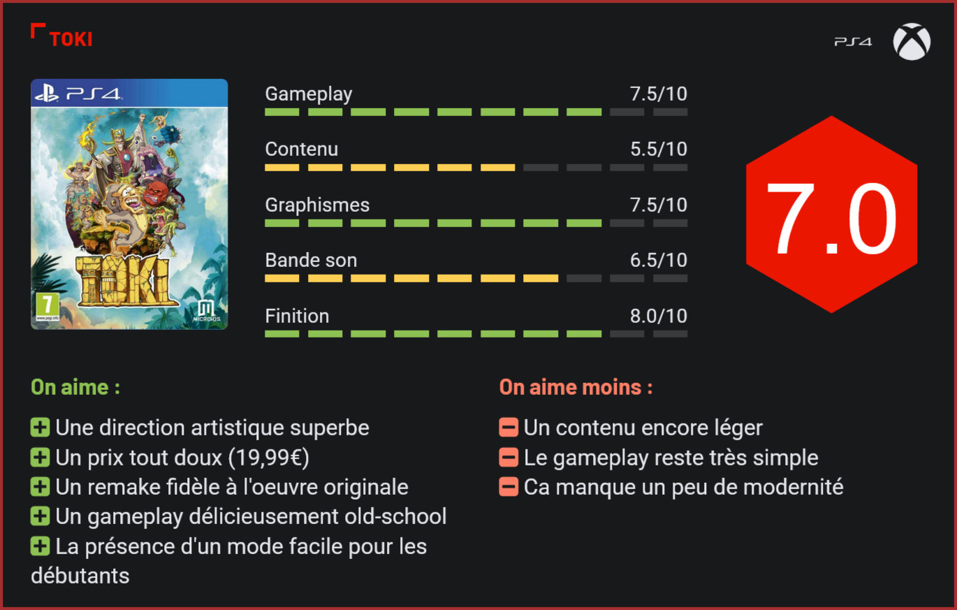 Jusqu’ici exclusivité du catalogue de la Switch, Toki a finalement droit à un portage en bonne et due forme sur Xbox One et PS4. Que les amateurs de plates-formes se rassurent : le primate n’a rien perdu de sa splendeur. Sorti initialement en 1989, Toki n’était en son temps déjà pas vraiment un monument du jeu vidéo. Cela n’a pourtant pas empêché un petit studio de développement de plancher sur un remake. Annoncé en 2009, le projet se transforme vite en vaporware – jusqu’à l’annonce miracle de l’éditeur Microids, qui sort le projet des limbes et nous livre en 2018 un remake en bonne et due forme en exclusivité sur Nintendo Switch. Six mois plus tard, notre cher primate revient, cette fois sur Xbox One et PS4, dans une édition 100% numérique qui intègre quelques jolis ajouts… Parmi les nouveautés proposées dans cette réédition : un mode speedrun qui se destine avant tout aux amateurs de scoring, l’ajout de 5 nouveaux filtres graphiques – dont un télé cathodique qui fera vibrer les joueurs nostalgiques – et l’introduction d’un jukebox qui permet d’écouter les 32 musiques du jeu. Des ajouts légers mais qui n’en restent pas moins les bienvenus – d’autant plus que le prix est proposé à un tarif très attractif dans cette version 100% numérique – puisqu’il ne faudra débourser que 19,99€ pour en faire l’acquisition – contre près de 40€ pour la version collector sortie sur Switch. Difficile donc de ne pas craquer pour ce jeu si vous faites partie de ces nombreux nostalgiques qui attendent impatiemment la sortie de platformers à l’ancienne. Ce remake de Toki est d’une fidélité exemplaire à l’œuvre originale. L’aventure est scrupuleusement identique à celle vécue par les fans il y a près de 30 ans, la patte graphique est respectée et – cerise sur le gâteau, malgré les standards actuels, le studio de développement a choisi de conserver un niveau de difficulté élevé. Certes, un mode facile fait son apparition, avec pas moins de 9 “continue”, mais pour boucler le jeu, les joueurs devront toutefois faire preuve de skill, les morts s’enchainant très rapidement. Méconnu du grand public, Toki est un titre délicieusement arcade, à mi-chemin entre Mario et Metal Slug. S’il reprend davantage de mécanismes aux platformers que Metal Slug, il conserve son aspect run & gun, le joueur dirigeant ici un singe qui devra massacrer ses ennemis à coups de boulettes, projetées depuis sa bouche. Comme dans Metal Slug, il faudra récupérer power-ups pour progresser plus facilement dans le jeu. A la différence du jeu de SNK toutefois, Toki reste un platformer relativement classique, avec de nombreuses séquences de plates-formes qui forceront le joueur à faire preuve de beaucoup de dextérité. Contrairement à un Mario ou un Sonic, Toki ne s’adresse pas au grand public mais davantage à un public de passionnés de rétrogaming, et particulièrement de joueurs nostalgiques. On notera au passage que la difficulté du jeu est intimement liée à sa longévité. Comme tous les platformers old-school, Toki ne propose qu’une poignée de niveaux – 6 en tout -, qu’il est possible de boucler en 30 minutes top chrono en ligne droite. Sa durée de vie est donc relativement limitée… mais la pilule est beaucoup plus facile à avaler que sur Switch. Pour le reste, difficile de ne pas être séduit par la patte graphique très particulière du jeu – les personnages et décors ont été dessinés à la main et le rendu est tout bonnement exceptionnel. Simplistes, les animations des personnages sont également inspirées des platformers des années 80. La bande sonore est du même acabit, avec des musiques réorchestrées efficaces, à défaut d’être légendaires, et des bruitages délicieusement old-school. Conclusion Délicieusement old-school, le remake très abouti de Toki séduira les amateurs de rétrogaming et les joueurs nostalgiques avec ses personnages dessinés à la main, ses mécanismes de jeu old-school, sa difficulté élevée et son univers magique. Extrêmement fidèle au matériau d’origine, le jeu n’en reste pas moins très court – mais son prix est attractif et Microïds a même pensé à proposer quelques petits ajouts pour la sortie de son jeu sur PS4 et sur Xbox. Pour peu que vous accrochiez à ce style de jeu, difficile donc de ne pas craquer pour ce remake qui a décidément tout pour séduire…