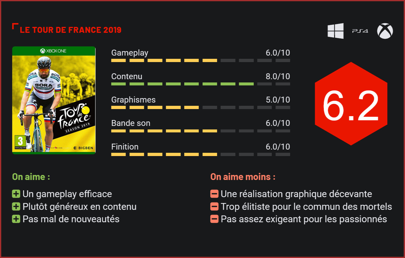 Big Ben Interactive et Cyanide rempilent pour nous livrer une neuvième édition du Tour de France, à la sauce jeu-vidéo. Exit l’arcade et place à la simulation pour cette nouvelle édition de Pro Cycling Manager, qui épouse parfaitement l’essence du Tour. S’adressant à un public de passionnés, la série des Pro Cycling Manager a été renommée pour des soucis évidents de notoriété « Tour de France » sur consoles. Développé par le studio français Cyanide, ce neuvième volet de la série tente de corriger les principaux défauts de ses ancêtres sans totalement revoir les mécanismes du jeu. Et s’il n’impressionne pas vraiment sur le plan technique, le jeu édité par Big Ben Interactive fait mouche au niveau de son contenu, avec un nombre impressionnant de petites nouveautés. Les développeurs du jeu l’avaient déjà annoncé en amont de la sortie de ce Tour de France 2019, la cuvée 2019 intégrerait de nombreuses nouveautés, sans pour autant toucher aux mécanismes de jeu. Car s’il cible un public de niche, Pro Cycling Manager n’en reste pas moins une simulation terriblement efficace, au gameplay bien rôdé. Pour cette cuvée 2019, les développeurs se sont donc contentés de petites retouches au niveau du gameplay, améliorant l’I.A. des opposants et la trajectoire des vélos. Globalement, le titre est plus réaliste que ses ancêtres. Il intègre également de nombreux nouveaux contenus, à commencer par de nouveaux défis très courts qui permettront de s’exercer entre deux étapes du Tour. On retrouve deux types de défis avec d’un côté des courses qui forceront le joueur à dévaler le plus rapidement une pente jusqu’à l’arrivée et de l’autre des sprints face à l’I.A., durant lesquels il faudra faire preuve d’une certaine stratégie pour remporter la partie. Ces deux ajouts – bien que mineurs – permettent de corriger l’un des principaux défauts des anciennes éditions de Pro Cycling Manager : à savoir la longévité des épreuves, qui occupent généralement le joueur entre 45 minutes et 1 heure. Autre ajout de taille : le mode Pro Team, qui permet au joueur de manager une équipe de A à Z en gérant un budget, une équipe de six joueurs et la complémentarité des classes entre les grimpeurs, sprinteurs et les plus versatiles. Le mode Pro Leader reprend les mêmes mécanismes en simplifiant toutefois le concept puisque le joueur ne dirigera cette fois plus qu’un coureur qui devra grimper les échelons progressivement pour devenir l’un des meilleurs. Généreux en contenu, le titre propose quantité de modes de défis mais également de compétitions. Car s’il se prénomme désormais « Tour de France », le titre de Cyanide est bien loin de se limiter à cette seule et unique compétition. On retrouve également plusieurs autres compétitions légendaires parmi lesquelles Paris-Roubaix, Paris-Nice ou le Tour de Flandres. L’intérêt principal du jeu reste toutefois le prestigieux Tour de France et ses 21 épreuves. Pour boucler chacune d’elles, il faudra compter en moyenne 1h de temps de jeu. Comme ses ancêtres, le Tour de France 2019 est davantage un jeu de stratégie et de gestion qu’un jeu de course. Le joueur devra toutefois prendre part activement aux étapes lors de certaines séquences en pédalant, freinant, à la place de son cycliste. Pour espérer remporter l’étape, il faudra habilement doser son effort et opérer les bons choix stratégiques. Le gameplay du jeu tout entier repose sur l’habilité du joueur à réagir intelligemment aux étapes cruciales du tracé, en choisissant de suivre un adversaire dans sa lancée, d’intégrer le peloton, de se lancer seul dans un sprint ou de jouer en équipe. Gérer l’énergie du joueur est la composante essentielle du jeu. A cet effet, on notera la présence à l’écran de deux jauges : une jauge rouge représentant le sprint, qui fondera comme neige au soleil lors de vos élancées, et une jauge bleue qui représente l’endurance, qui diminuera progressivement tout au long de l’étape. Chacune des deux jauges pourra toutefois être rechargée en cours d’une partie, à une seule occasion. Pour ceux qui n’auraient jamais touché à un Pro Cycling Manager, il est donc important de se poser la question s’il s’agit d’un titre susceptible de le garder scotché à son pad. Le Tour de France 2019 est très clairement un jeu qui s’adresse à un public de passionnés de par son orientation. A l’inverse d’un Football Manager, Le Tour de France 2019 conserve toutefois une interface simple et accessible. Une fois les mécanismes de jeu bien intégrés, le titre devient donc très accessible. Graphiquement toutefois, il ne faut pas s’attendre à une claque. S’il est plus joli que ses ancêtres, Le Tour de France 2019 reste un titre à petit budget. Les décors sont relativement variés mais peu détaillés. Il ne faudra dès lors pas s’attendre à en prendre plein les yeux sur les Champs Elysée, dans la campagne bretonne ou sur les routes belges. Les divers éléments graphiques sont recyclés à foison. S’il n’est pas excessivement vilain, le jeu est loin d’être à la hauteur des standard actuels. On s’en doute : le constat aurait sans doute été tout autre si le cyclisme avait la popularité du football… Difficile en revanche de ne pas applaudir le soin apporté aux détails en ce qui concerne la conduite. On sent bien ici les différents revêtements. La stratégie est parfaitement intégrée aux parties et chaque étape du tour forcera le joueur à l’adapter, en utilisant les attributions de ses coureurs. Autre nouveauté notoire : l’intégration d’un système de sauvegarde manuel qui permet de sauvegarder la partie n’importe quand pour la reprendre plus tard. Pratique pour ceux qui n’ont pas toujours 1h de temps libre à consacrer à une étape ! En définitive, difficile de ne pas apprécier les nombre