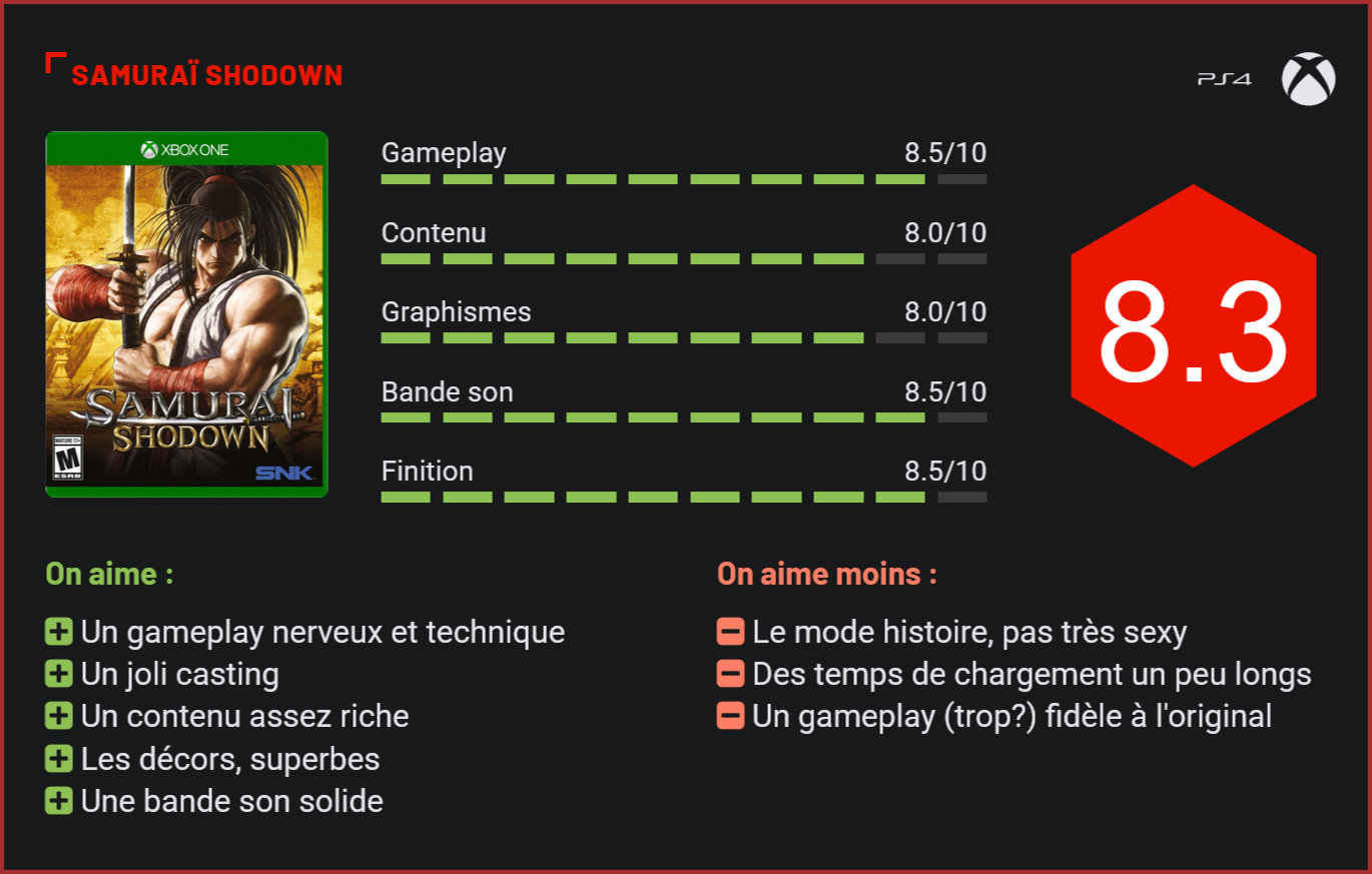 Quinze ans après le cinquième volet, SNK remet au goût du jour l’une de ses franchises les plus populaires, avec un jeu de baston qui n’hésite pas à nager à contre-courant des productions actuels. Exigeant et technique, Samuraï Shodown est incontestablement LA bonne surprise de ce mois de juin 2019. Après un Samuraï Shodown Sen bien décevant sur Xbox 360, SNK tente de remettre à nouveau au goût du jour l’une de ses plus vieilles franchises, après avoir brillamment ressuscité sa série des King of Fighters. Et le moins que l’on puisse dire, c’est que le studio de développement nippon réalise un véritable tour de force! La plus grande réussite de ce reboot, c’est de rester très fidèle aux jeux originaux. Si certains lui reprocheront de n’intégrer aucune réelle nouveauté du côté du gameplay, les puristes apprécieront la façon avec laquelle SNK est parvenu à redonner vie à l’une de ses sagas les plus légendaires en misant sur un gameplay ultra-technique. Car Samuraï Shodown n’est pas un jeu de baston comme les autres. Beaucoup plus exigeant qu’un Tekken, un Street Fighter ou un Dead or Alive, le jeu de SNK n’autorise pratiquement aucune erreur. 3 coups sont suffisants pour mettre K.O. un adversaire. On notera d’ailleurs que contrairement aux autres jeux de baston, le jeu de SNK ne souffre également d’aucune censure : le sang coule à flots et les membres du corps se découpent sous les coups des lames. Samuraï Shodown reste pourtant un titre très accessible. Les combinaisons ne sont pas très nombreuses et les coups sont subdivisés par catégories (faibles, moyens et forts). Il est certes possible de sortir quelques coups spéciaux, et même de “chopper” un ennemi, mais à l’inverse d’un Street Fighter, Samuraï Shodown n’est pas un jeu à combos. Tout le gameplay du jeu repose sur la défense et la contre-attaque. Comme nous l’avons déjà dit plus haut, il est possible de mettre K.O. un adversaire en quelques coups. Pour y arriver, il faudra affûter ses réflexes mais également faire preuve de stratégie. La moindre petite erreur peut vous être fatale, et c’est ce qui fait tout le charme de Samuraï Shodown, puisque même avec sa barre de vie pratiquement vide, un adversaire peut remporter la partie en enchaînant trois bonnes attaques. La tension est palpable durant tout le combat. On notera d’ailleurs que si les combattants utilisent habituellement des sabres et des armes blanches pour taillader leurs ennemis, il arrive occasionnellement que l’un d’eux perde son arme et se voit très fortement déstabilisé. Il faudra dès lors tenter tant bien que mal de la récupérer. Votre opposant fera alors tout le nécessaire pour tenter de vous en empêcher. Avec son système de contres et de contres-contres, Samuraï Shodown se positionne comme un jeu de combat terriblement technique et très intelligent. Pour autant, le jeu de SNK reste très accessible et il est possible de réduire la difficulté du titre au minimum pour apprendre à en maîtriser les bases. S’il est d’une fidélité extrême au jeu d’origine, ce reboot de la série manque toutefois quelque peu de fraîcheur dans son gameplay. On aurait aimé au moins une nouveauté majeure. Néanmoins, les fans devraient y prendre leur pied. Les joueurs qui n’avaient jamais touché à un Samuraï Shodown auront en revanche besoin d’un petit temps d’adaptation. Dans ce contexte, on comprend mieux la présence d’un tutoriel, qui apprendra les bases du combat au joueur. SNK parvient également à nous surprendre au niveau du contenu du jeu avec la présence de nombreux modes de jeu, du time attack au mode survie en passant par le “dojo”, qui fera affronter des “fantômes”, des ennemis qui emploient des techniques inspirées des joueurs à travers le deep-learning. Du côté du multijoueur, on retrouve le traditionnel versus, mais aussi du online avec des matchs classés et des matchs non-classés. Si le mode Histoire principal déçoit par sa mise en scène simpliste, son scénario peu excitant et sa durée très courte, force est de constater que SNK nous livre un jeu complet et plutôt généreux en contenu. On notera également la présence de nombreux niveaux différents – tous très jolis, et de surcroît relativement variés -, d’un rooster assez vaste (16 personnages, auxquels viendront se joindre de nouveaux persos tous les mois), qui introduit même 3 nouveaux personnages, et d’un nombre impressionnant de paramètres pour les parties en multijoueur. Sur le plan technique, Samuraï Shodown se montre également très convaincant avec une bande sonore très riche, composée de musiques absolument superbes, et d’excellents doublages en japonais. La direction artistique fait honneur à la série, avec des décors absolument superbes, des personnages brillamment modélisés et un univers très cohérent. Si le jeu n’est pas une claque graphique, il parvient à brillamment moderniser une série qui était par nature très difficile à faire renaître d’entre les morts. Le travail est propre et fait honneur à l’ADN de SNK. En revanche, on regrettera les trop nombreux – et trop longs – temps de chargement qui viennent légèrement entacher l’expérience de jeu, et les quelques petits ralentissements ressentis lors des parties en multijoueur. Des petits défauts qui pourraient toutefois être corrigés avec les futures mises à jour du jeu… Conclusion Vibrant hommage aux premiers volets de la série, Samuraï Shodown, cuvée 2019, est une véritable bouffée d’air frais pour les amateurs de jeux de baston, qui découvriront un jeu d’une richesse impressionnante, technique, solide et surtout très charmant de par sa patte graphique et son univers atypique. Malgré sa technicité, le jeu de SNK reste très accessible avec un gameplay facile à mémoriser, une difficulté modulable et un système de progression intell