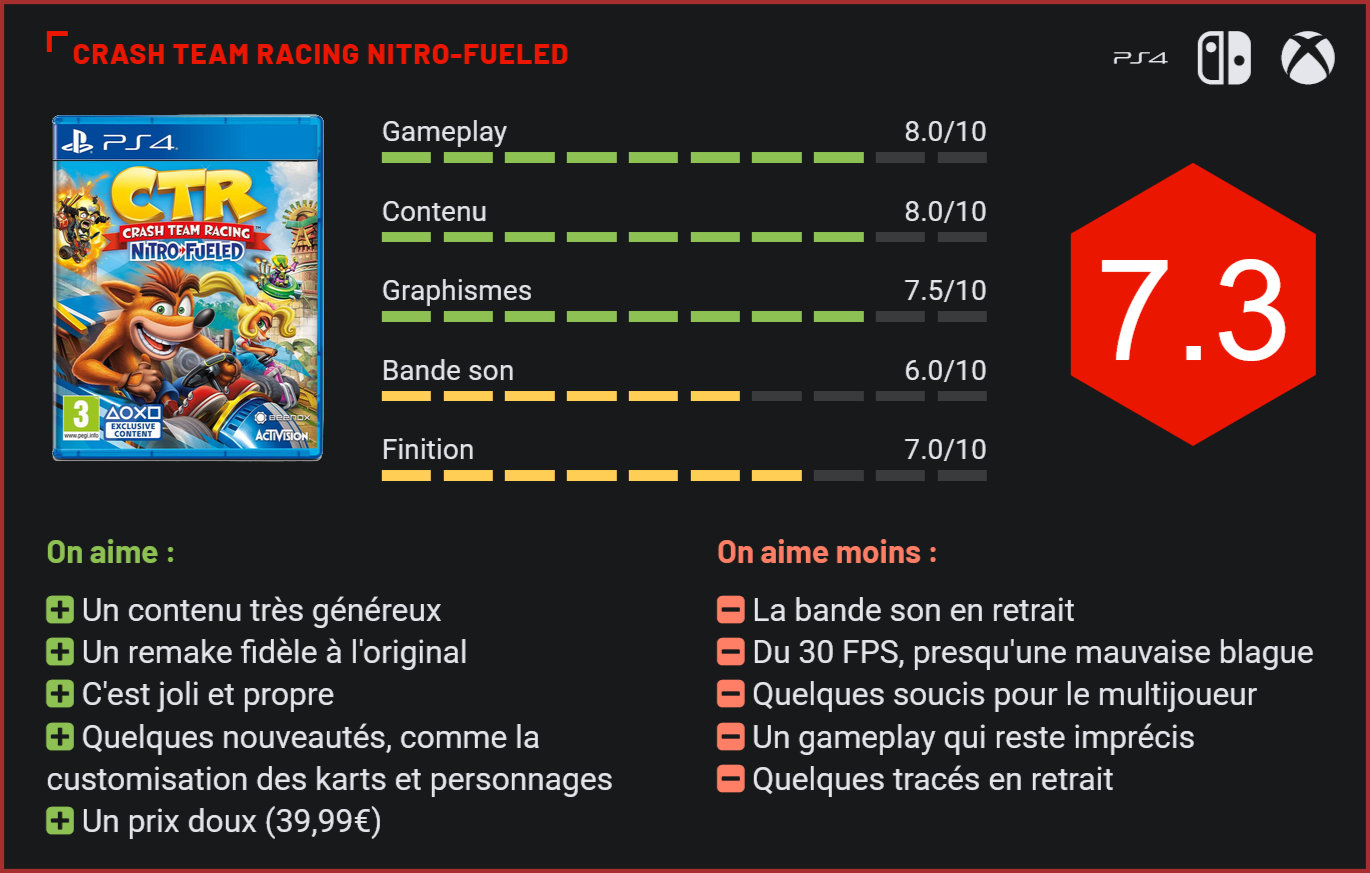 Après Crash Bandicoot et Spyro, Activision nous offre le remake d’un autre jeu culte de son catalogue avec Crash Team Racing Nitro-Fueled, qui propose de redécouvrir l’excellent CTR, des créateurs d’Uncharted. Parmi les titres incontournables du catalogue de la PS One, on retrouve bien sûr les Crash Bandicoot mais aussi le premier spin-off de la série, le très sympathique CTR, qui reprenait le concept de Mariokart tout en immergeant le joueur dans l’univers de Crash. Le titre avait reçu un accueil très chaleureux des critiques en son temps et est considéré aujourd’hui encore comme un incontournable de la console par de nombreux joueurs. Plus de 15 ans après sa sortie, Activision nous livre le remake de ce grand classique, qui débarque également pour la première fois sur des consoles rivales… Comme N.Sane Trilogy et Reignited Trilogy, Nitro-Fueled est un remake d’une fidélité extrême au matériau d’origine. Le titre conserve les niveaux de l’époque, rassemble le même casting et procure les mêmes sensations que le CTR originel. Les développeurs ne se sont toutefois pas contentés de porter le jeu sur les consoles de nouvelle génération puisque ce remake intègre également de nombreuses nouveautés, comme de nouveaux circuits, des options de customisation et bien sûr du jeu en ligne. Les développeurs n’ont pas hésité à aller très loin dans leur travail, en n’utilisant l’original que pour l’inspiration au niveau de l’esthétique. Tous les modèles 3D ont été entièrement retravaillés, de nouveaux éléments ont été ajoutés dans les décors et la direction artistique a pris une direction différente – sans pour autant trop s’écarter de la série. Le résultat est tout simplement bluffant puisque Nitro-Fueled est exactement le remake que les fans attendaient : fidèle à l’original mais loin d’être une simple actualisation d’un jeu culte. Certains effets visuels en mettent même plein les yeux, à l’image des explosions. Sans être une claque graphique, le jeu d’Activision est assurément un jeu très joli, qui n’a rien à envier à un Mariokart ou un Sonic Team Racing tant au niveau de sa réalisation que de sa direction artistique. En revanche, la finition laisse quelque peu désirer. On regrettera ainsi le manque d’optimisation du jeu, qui ne tourne qu’à 30 images par seconde – la fluidité est là mais les sensations de vitesse restent faibles et on aurait aimé que le studio de développement s’applique un peu plus. Dans le même ordre d’esprit, on notera quelques soucis au niveau du réseau pour les parties en multijoueur. Rien de très grave en soi, mais des petits ralentissements et coupures qui entachent toutefois l’expérience de jeu de façon occasionnelle. Côté gameplay, Nitro-Fueled reste très fidèle à CTR – qui était lui-même un très bon clone de Mariokart. Le joueur enchaine les tours sur des tracés colorés et très variés inspirés du monde de Crash Bandicoot. Pour finir premier, il devra faire preuve de savoir-faire, mais aussi utiliser efficacement les multiples bonus récupérés dans les courses. Comme dans Mariokart, il sera possible d’envoyer des missiles à tête chercheuse, bombes et autres fioles à la figure de ses adversaires, et d’utiliser des boosts pour se propulser. La prise en main reste assez simple. On notera toutefois qu’il faudra apprendre à maîtriser le système de dérapage très particulier du jeu pour gagner des boosts et prendre ainsi un très net avantage sur ses rivaux. Le gameplay de Nitro-Fueled offre une richesse inattendue avec les multiples combos à enchainer pour gagner en puissance. Les fans de la série seront donc aux anges. Pour autant, dans le fond comme dans la forme, Nitro-Fueled, à l’image de son ainé, n’en reste pas moins un clone “un peu moins fun” de Mariokart, qui n’est toujours pas parvenu à égaler l’excellence de son modèle. Côté contenu, on retrouve tout le contenu du jeu originel, plus quelques circuits inédits, tirés des deux suites du jeu. Ce contenu supplémentaire ajoute tout de même 13 circuits au jeu d’origine et double littéralement le nombre de personnages. Inutile de le préciser : Activision a été plutôt généreux sur ce point. L’aventure principale, qui propose de parcourir cinq zones de jeu en bouclant tous les défis avant d’affronter un boss, dans un mini monde-ouvert, est toujours là, et mieux encore : les fans découvriront un tout nouveau mode multijoueur en ligne qui permet d’affronter ses amis. Si on lui regrettera quelques ralentissements et coupures inopinées, le résultat n’en reste pas moins globalement très convaincant. Autre bonus non-négligeable : le jeu intègre désormais un système de customisation de karts et de personnages qui permettent d’en modifier les apparences. Sympathique, à défaut d’être révolutionnaire. Petits regrets toutefois en ce qui concerne les modes de jeu qui demeurent toutefois très limités – avec l’absence d’un mode plus original, qui apporterait une touche de fraîcheur – et des menus, pas très ergonomiques. Même regret en ce qui concerne la bande son qui reste très anecdotique, avec des musiques qu’on aura tôt fait de couper – ou d’oublier. Pour autant, difficile de ne pas être séduit par un jeu, qui nous est proposé de surcroît à un tarif très doux. Il ne faudra en effet débourser que 39,99€ pour en faire l’acquisition. Conclusion Fidèle à l’original, ce remake de CTR est une franche réussite. Loin de se contenter de nous livrer un portage du jeu qui était sorti à l’époque sur PS One, Activision nous livre un titre enrichi en contenu, qui intègre 13 circuits tirés des suites de CTR, double le casting originel du jeu, ajoute un mode online, un système de customisation des karts et un mode online. Avec son contenu très riche, Nitro-Fueled se positionne comme un clone trè