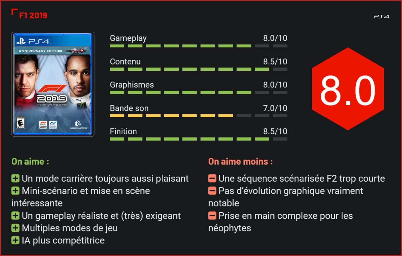 Le jeu officiel du Championnat du monde de Formule 1 revient avec son édition 2019. Un rendez-vous incontournable pour tous les amateurs de voitures de course qui voient leurs habitudes un peu chamboulées avec cette édition. C’est avec deux mois d’avance que le studio britannique Codemasters dévoile son titre annuel. Un pari risqué qui se révèle gagnant. Sortir un jeu plus tôt que d’habitude a rarement été une bonne chose pour les éditeurs. Manque de finition, bugs, contenu inintéressant sont souvent au rendez-vous. Alors quand Codemasters annonce la sortie de son jeu de Formule 1 deux mois plus tôt qu’à l’accoutumée, les fans avaient de quoi se crisper – même si le matériau de base est une affaire qui roule. Quand bien même les doutes, le jeu est sorti et il est temps de voir ce qu’il a sous le capot. Une simulation plus narrative Dès la prise en main, les doutes des fans se dissipent. Codemasters propose un titre à la hauteur de la licence, en tout cas au niveau du mode Carrière. Il n’était pas question pour le studio anglais de proposer quelque chose de bâclé, mieux encore, le mode Carrière semble enfin répondre aux attentes des fans en termes de narration. Après avoir créé son propre pilote – à partir de personnages préarrangés -, choisi son prénom, nom et surnom, le joueur doit sélectionner l’écurie qu’il souhaite rejoindre. Contrairement aux précédents volets, notre champion débute sa carrière en F2 et non en F1. Un changement qui a son importance puisque le pilote devra faire ses preuves avant de pouvoir concourir avec les plus grands. En réalité, même si cette étape à son importance pour la suite, elle se révèle malgré tout assez limitée. Au bout de trois courses, le joueur se retrouve déjà dans la cour des grands, en F1. La séquence apporte cependant une plus-value à l’expérience F1 puisqu’elle est cadrée par un mini-scénario et une mise en scène plus présente que dans les précédents volets. On a davantage l’impression d’en apprendre sur l’envers du décor d’une telle compétition de Formule 1, notamment sur les choix que doivent faire les pilotes entre faire gagner son équipe ou rouler pour soi au risque de se faire mal voir de ses potentiels employeurs. La suite de la séquence F2 développe d’autres problématiques du monde automobile et d’autres pressions qu’entraîne la compétition. Le tout étant véritablement cadré par des interactions plus présentes des personnages (pilote, écurie, co-équipier, journaliste, employeur). En développant davantage l’aspect scénaristique du mode Carrière, le joueur aura davantage l’impression d’entrer dans ce monde très particulier qu’est celui du sport automobile. Bien que cet aspect soit encore à ses balbutiements et malgré le temps de développement réduit pour ce F1 2019, Codemasters fait un pari intéressant et réussi qui devrait très certainement se retrouver dans les futures éditions de F1 avec, pourquoi pas, un scénario plus conséquent – sans toutefois tomber dans un jeu narratif. Direction la cour des grands Après cette séquence plus scénarisée en F2, le titre reprend son schéma plus traditionnel, mais là où F1 2019 se démarque encore plus c’est que les actions et choix entrepris dans la première séquence auront un réel impact sur la suite de la carrière de notre pilote. En effet, suivant qu’on s’est montré plus compétiteur qu’uni avec son équipe et autres, les employeurs potentiels qui souhaiteraient nous faire rejoindre leur écurie ne seront pas les mêmes. Et justement, le choix de l’écurie sera pour la carrière de notre pilote, il faudra prendre en compte les attentes des différents employeurs et équipes, ainsi que les perspectives d’avenir qu’ils nous proposent avant de faire son choix. Si cela coule de source pour les joueurs de longue date de F1, ce n’est pas forcément le cas pour les nouvelles recrues. La gestion du mode Carrière se révèle assez complexe tant les éléments à prendre en compte sont nombreux. On peut tout de même souligner le souci de réalisme du jeu de simulation, mais ce n’est pas à mettre dans toutes les mains. Au-delà de ces quelques nouveautés, cette édition 2019 reste assez similaire à celle de 2018. Codemasters a tout de même apporté des améliorations ici et là, en un temps pourtant réduit. On notera notamment la possibilité de transférer des pilotes d’une écurie vers une autre, ce qui dynamise un peu la partie et permet également de mieux négocier ses contrats. Au final, le mode Carrière est une véritable réussite pour Codemasters. Partant des excellentes bases de F1 2018, le studio britannique n’a fait que perfectionner ce mode, notamment avec l’aspect story-telling très appréciable. Les conséquences des actions en F2 apportent un vrai poids aux décisions prises par le joueur et son pilote. Prêt ? Partez ! Mais venons-en au cœur du sujet : la course. Basé sur le Championnat du monde de Formule 1, le jeu se montre évidemment à la hauteur de la compétition. La prise en main exige une maîtrise assez conséquente des codes et stratégies de compétition de voiture de course, un aspect qui peut être assez nébuleux pour les nouveaux joueurs. N’étant pas une adepte de la licence et de ce genre de jeu, la découverte et la (tentative) de maîtrise ont vraiment été compliquées. Les initiés pourront certainement souligner la justesse du gameplay proposé par Codemasters, mais il est assez compliqué d’en parler sans avoir de réel background à ce sujet. Le moins que l’on puisse dire est que l’on constate rapidement combien la vitesse emmagasinée par la voiture lors des lignes droites influencera lors des virages. Il faut donc calculer quand freiner et avec quelle puissance pour ne pas finir – une énième fois – hors du circuit. La gestion des freinages est vraiment un élément crucial
