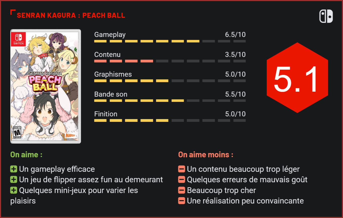 Quatrième spin-off de la série des Senran Kagura à voir le jour, Peach Ball ose offrir un gameplay radicalement différent aux fans de la série, en proposant cette fois de découvrir un jeu de flipper avec une bonne dose de fan-service. Très gros succès au Japon, la série des Senran Kagura est parvenue à trouver son audience en jouant sur la carte de l’humour et de la sensualité. Si la série principale s’inspire des Dynasty Warriors, les multiples spin-off qui ont vu le jour ont osé adopter des gameplay radicalement différents. Après le jeu de massage et le jeu de tir, le studio à l’origine de la série s’essaye au jeu de flipper avec Peach Ball. Disponible exclusivement sur Switch, Peach Ball n’est pas vraiment ce qu’on pourrait appeler un jeu de flipper classique puisqu’il s’adresse avant tout aux fans de la série des Senran Kagura. En d’autres termes, il faut s’attendre ici à une bonne dose de fan service, d’espièglerie et de sensualité. Une partie du casting féminin du jeu de base a d’ailleurs fait le voyage puisqu’on retrouvera 5 des personnages principaux du jeu. A ce titre, il ne faut donc pas s’attendre à une simulation de flipper mais bien à un jeu complètement décalé. Et la bonne nouvelle, c’est que même s’il ne se prend pas du tout au sérieux, Peach Ball s’impose comme un bon jeu de flipper. Le gameplay est d’une rare précision et les quelques tables mises à disposition suffisamment jolies et intéressantes pour qu’on y passe quelques heures. La réactivité des commandes est au poil et on prend un véritable pied à envoyer valdinguer notre boule aux quatre coins du tableau. Le design des tables se renouvelle également plutôt bien. En revanche, on aura tôt fait de remarquer le manque relatif de contenus. Les tables se comptent sur les doigts d’une main et le nombre de personnages est limité à 5. Ce qui est tout de même regrettable pour un jeu vendu à prix plein… En quoi le jeu se démarque-t-il des autres jeux de flipper? De par son univers totalement décalé bien sûr! Pour ceux qui ne connaîtraient pas, Senran Kagura joue avidement la carte de l’humour et de la sensualité avec ses ninjas dénudées. Malheureusement ici, l’humour ne transparaît que très peu et le studio semble avoir franchi le point de non-retour en jouant un peu trop la carte de la provoc’, entre les positions aguicheuses des héroïnes dévêtues, dont il faudra arracher les vêtements à coups de victoires et les mini-jeux grotesques qui consisteront notamment à détruire des tours et des canards encore une fois dans le seul et unique but de placer ces jeunes femmes dans des situations délicates. Si ces mini-jeux offrent une certaine diversité au gameplay du jeu et se montrent en soi plutôt amusants, on regrette que le jeu ait tendance à sombrer un peu trop dans le vulgaire. C’est d’autant plus dommage que la partie flipper est réussie et qu’il aurait été tout à fait possible de soigner la fan service avec une garde-robe plus large ou plus d’items à collectionner. En sombrant dans la provoc’, Marvelous se tire une balle dans le pied. Techniquement, le jeu est également loin d’en mettre plein les yeux. Certes, c’est un jeu de flipper, mais on aurait été justement en droit d’en attendre plus des visuels, qui restent très simples. Si on apprécie toujours autant la direction artistique du jeu, et ses tables, on regrette en revanche que les modélisations ne soient pas plus fines et plus soignées. Même constat pour ce qui est de la bande sonore, qu’on aura tôt fait de couper. Conclusion S’il n’est pas un aussi gros désastre que Réflexions, ce second spin-off de la série des Senran Kagura exclusif au catalogue de la Switch est malheureusement loin d’être aussi fun que les premiers volets de la série et les précédents spin-off. Certes, il s’agit en soi plutôt d’un bon jeu de flipper, mais le manque de contenu, les défis un peu vulgaires du jeu et sa réalisation médiocre justifient difficilement son prix plein. Sous la barre des 10 euros, Peach Ball aurait sans doute trouvé son public. Au prix plein, il est malheureusement loin de convaincre. Que vous soyez fan de flipper ou de la série des Senran Kagura, mieux vaut donc attendre patiemment les soldes pour se le procurer…