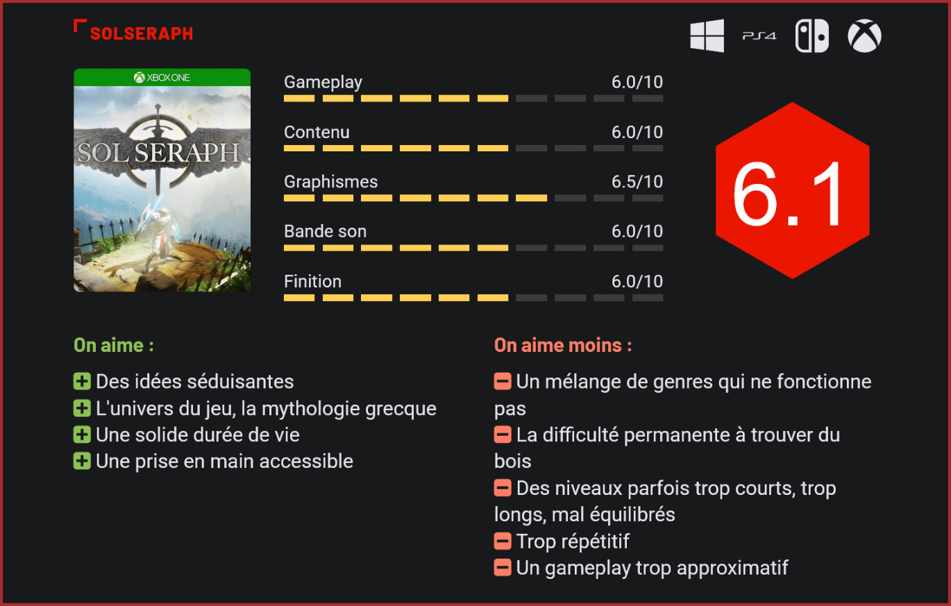 Nouveau jeu des créateurs de Rock of Ages et de Zeno Clash, Solseraph s’inspire très ouvertement d’un classique de la Super Nintendo, le bien nommé ActRaiser. Mélange improbable de genres, le titre tente de livrer une expérience de jeu unique, à mi-chemin entre le platformer et le tower defense. Fruit d’une collaboration inattendue entre Sega et l’Ace Team – le studio derrière les sympathiques Rock of Ages et Zeno Clash, SolSeraph se positionnait d’entrée comme la suite spirituelle d’un classique de la Super NES, le bien nommé ActRaiser. Le titre se caractérisait à l’époque avec son gameplay à deux vitesses, avec des séquences de gestion en “vue du dessus” et des séquences de platforming en side-scrolling. SolSeraph reprend cette recette improbable sans vraiment apporter de grande nouveauté. S’il est fidèle à son modèle, le jeu ne parvient toutefois pas vraiment à convaincre, la faute à un gameplay pas suffisamment profond justement. C’est souvent le problème avec les jeux qui mélangent plusieurs genres. A vouloir trop en faire, les développeurs ne soignent jamais suffisamment chaque style de jeu à part entière et le titre final donne l’impression de jouer à un titre mal fignolé. SolSeraph n’échappe pas à la règle. Les séquences de jeu sont divisées en deux parties avec d’une part l’aspect gestion / stratégie qui propose au joueur de prendre en main la destinée d’une petite bourgade en construisant habitations, fermes, casernes et défenses. Le joueur devra à la fois gérer la production de ressources, en construisant des fermes et des scieries, et la défense de sa cité, en construisant des tours, casernes et palissades qui lui permettront de se défendre des groupes d’ennemis qui attaqueront sans relâche sa ville. Dès qu’il aura suffisamment étendu sa ville, il pourra partir à l’assaut des campements ennemis. Le gameplay basculera alors pour se rapprocher d’un jeu de plates-formes mâtiné de combats, le tout à travers une vue side-scrolling à la Trine. Si le concept est intéressant, on regrette que le jeu soit aussi mal fichu. Les séquences de side-scrolling sont systématiquement très mal équilibrées, avec des missions soit trop courtes soit beaucoup trop longues, une difficulté très mal dosée, un level-design très peu inspiré et des ennemis dont les déplacements peuvent être très imprévisibles. Si ces séquences de jeu n’en restent pas moins amusantes, on est très loin d’atteindre le niveau d’excellence d’un Trine. Même constat pour ce qui est de la partie gestion – beaucoup trop simple. Il suffit de construire quelques habitations, trois petites fermes, et de bâtir une scierie à proximité d’une forêt pour ne plus devoir s’occuper que des combats pour le reste de la partie. On schématise, mais c’est à peu de choses près vrai – les bois restant la ressource la plus difficile à trouver – pour des raisons qui nous échappent complètement. Ces mêmes combats ne vous poseront pas plus de problèmes puisqu’ils se résument en réalité à de simples mécanismes de tower-defense. Les ennemis n’avancent en effet ici que sur une route toute tracée, n’attaque pas vos constructions et se font relativement facilement éliminer par les défenses placées sur leur chemin. Là aussi, on sent que les mécanismes de jeu sont beaucoup trop simples. Et si l’on prend un certain plaisir à étendre sa ville et à progresser dans le jeu, la simplicité déconcertante du gameplay et son manque de profondeur auront très vite raison de nous. Répétitif, trop facile et pas suffisamment riche, SolSeraph donne vraiment l’impression d’être un titre bâclé, qui aurait mérité plusieurs mois de développement supplémentaires. C’est d’autant plus dommage que le titre fourmillait de bonnes idées, avec son univers inspiré de la mythologie grecque, son bestiaire varié, ses combats de boss accrocheurs et son mélange de genres atypique. Finalement, son plus gros défaut est également sa plus grande qualité puisque la diversité de ses séquences de jeu en fait un titre relativement agréable à parcourir – mais qui montre néanmoins vite ses limites. S’il avait été un simple tower-defense, ou un side-scroller, SolSeraph n’aurait sans doute pas décroché un seul regard avec sa réalisation sans grand génie, sa bande son fadasse et sa patte graphique sans prétention. Conclusion S’il avait tout pour séduire sur le papier, SolSeraph ne parvient pas vraiment à convaincre, la faute à un mélange de genres qui ne fonctionne pas. A mi-chemin entre le jeu de plates-formes à l’ancienne, le tower defense et le jeu de gestion, SolSeraph tente tant bien que mal de mixer plusieurs genres sans jamais en maîtriser aucun. A la tête de sa tribu, le joueur devra construire sa ville, la protéger des vagues ennemies et partir à l’attaque des campements adverses dans des séquences de side-scrolling old school. Si l’univers du jeu à son charme, on en vient très vite à penser qu’il aurait sans doute été beaucoup plus productif de se concentrer sur un seul genre plutôt que de vouloir en faire des tas. Car c’est un fait, SolSeraph n’est ni un bon tower defense ni un bon platformer, la faute à un manque de profondeur flagrant. Tout au plus le trouvera-t-on sympathique à parcourir. La diversité de ses séquences de jeu est à la fois son plus grand défaut et sa plus grande qualité. Car d’une certaine façon, c’est ce qui le sauve également du naufrage. Dommage, car le potentiel était immense.