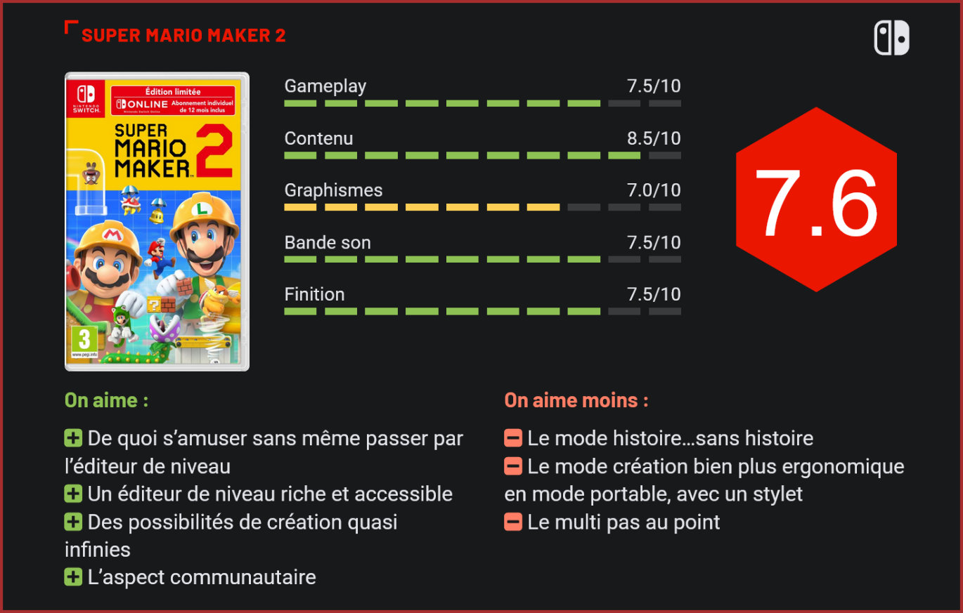 Proposer un éditeur de niveau accessible dans l’univers de Mario tout en offrant la juste dose de plateforme pour les joueurs moins créatifs, tel est le défi de Super Mario Maker 2 qui débarque en ce début d’été sur Nintendo Switch. L’éditeur de niveau Super Mario Maker avait posé une solide pierre en 2015 sur Wii U en proposant aux joueurs de créer de façon assez simple leurs propres stages dans les environnements de Super Mario Bros, Super Mario Bros 3, Super Mario World et New Super Mario Bros. La suite qui vient de voir le jour sur Switch ajoute le style de Super Mario 3D World (…en 2D uniquement) pour offrir encore plus de possibilités. Soit autant de gameplay partageant la même base, mais apportant chacun leur lot de variations (rebond sur les murs, transformation en Mario chat, etc.). Au joueur d’y apporter sa touche créative pour fabriquer des niveaux personnels et originaux, et pourquoi pas tenter de rivaliser sur le terrain du level design avec le génie des développeurs de chez Nintendo. Va y avoir du sport ! S’amuser sans devoir créer Si le premier Super Mario Maker proposait déjà plusieurs niveaux directement jouables pour s’inspirer, cette suite dispose désormais d’un mode histoire bien plus étoffé. Il ne faut toutefois pas s’attendre à une grande aventure Mario, le scénario n’étant qu’un prétexte (certainement l’un des plus faibles de surcroît) et les niveaux étant tous assez courts, prenant parfois la forme de défis à relever. Pas de mondes à parcourir ici (bien que les environnements soient très variés) mais une liste d’une centaine de missions à accomplir une à une pour récolter des pièces nécessaires à la reconstruction complète du château de la princesse Peach. Ce mode histoire permet surtout de se rendre compte de la richesse et des possibilités multiples que propose Super Mario Maker 2 en matière de création de niveaux. Et si la création n’est justement pas votre fort, ce mode devrait vous apporter une dose plus que correcte de plateforme pure avec les ennemis et pièges de circonstance (comptez environ 5 heures de jeu) et pourrait même vous donner envie de vous essayer à la partie fabrication, sait-on jamais. A cela s’ajoute le mode Stages du monde où l’on peut jouer aux nombreux stages créés par les autres joueurs dans le monde (une connexion est bien entendu nécessaire), consulter des classements en ligne ou participer à un Défi infini qui propose de jouer à des niveaux d’autres joueurs jusqu’à épuisement de toutes ses vies. Bref, il y a déjà de quoi s’amuser sans même avoir exploré le mode éditeur de niveau. Vers l’infini et au-delà Bardé de tutoriels et de leçons pour bien appréhender la partie création, Super Mario Maker 2 est très facile d’accès. L’éditeur de niveau s’avère très simple à utiliser et quelques minutes suffiront à créer un stage basique. A l’aide d’une palette d’outils bien fournie, on apprend ensuite rapidement à créer des niveaux de plus en plus complexes et délirants. Tout semble possible, d’autant que cette suite ajoute bien sûr de nouveaux éléments tels que les pentes, les interrupteurs On/Off, les plateformes serpent ou encore la possibilité de créer des niveaux verticaux et de concevoir des salles fermées. On peut même désormais définir des conditions de victoires (finir sans sauter une seule fois, en ayant tué un certain nombre d’ennemis, etc.) et passer la dizaine de décors disponibles (désert, neige, aquatique, etc.) en mode nuit, ce qui ouvre encore à de nouvelles perspectives. Très complet, il ne manquerait à Super Mario Maker 2 que des options plus orientées sur la personnalisation. On pourrait en effet par exemple regretter de ne pas pouvoir changer la couleur des divers éléments, de ne pas avoir accès à la modification des environnements en background (en y ajoutant des fleurs, des collines, etc.) ou même de ne pas pouvoir changer les patterns prédéfinis des ennemis. Mais ce serait vraiment chicaner tant les possibilités sont déjà incroyablement conséquentes. Le stylet, outil indispensable Le seul petit point noir se situe au niveau de l’ergonomie, le jeu étant bien plus maniable à l’aide d’un stylet. Les niveaux se construisent en effet par le biais du drag & drop, ce qui s’avère un poil fastidieux manette en mains (soit en mode docké) et pas très précis au doigt (soit en mode nomade), sans que ce soit pour autant insurmontable. Super Mario Maker 2 propose également de la création en duo, chacun disposant d’un joy-con, ce qui s’avère encore moins maniable et devient vite chaotique à l’écran. Pour compléter l’expérience de la plus belle de façon, Super Mario Maker 2 mise également beaucoup sur l’aspect communautaire. On y partage donc ses créations en ligne très aisément et on peut s’essayer à celles des autres, appréciations et commentaires à l’appui. De nombreuses options de recherche sont présentes pour trouver son bonheur, avec l’aide de tags et autres filtres bienvenus. Le jeu en multi est aussi maintenant de la partie, jusqu’à 4 joueurs en coopération ou en versus (moyennant des temps d’attente un peu longs entre chaque niveau)…mais sans ses amis ! Il faudra pour ce faire se tourner vers le multi local en ayant au préalable pris le soin de télécharger les niveaux. Un petit bémol supplémentaire qui ne ternit néanmoins pas au final les grandes qualités de ce Super Mario Maker 2 qui est en mesure de satisfaire le plus grand nombre de joueurs. Conclusion Plus complet que son prédécesseur, Super Mario Maker 2 est à la fois un jeu de plateforme comportant son lot de défis et un éditeur de niveau très complet. Car ici, le joueur peut créer ses propres niveaux et les éditer en profondeur. La durée de vie du jeu est donc potentiellement gigantesque si l’on adhère au concept. Malgré son ergonomie moins eng