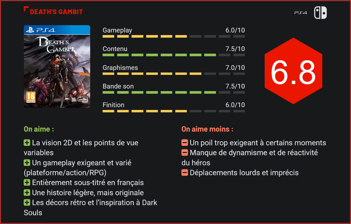 Déjà disponible en version numérique depuis l’été 2018, Death’s Gambit s’offre une version physique sur PS4 et Switch. L’occasion pour ceux qui n’auraient pas affronté la Mort de se plonger dans ce jeu de plateforme sombre et lugubre aux faux airs de Dark Souls parfaitement assumés. Pacte avec la Mort Death’s Gambit nous transporte au cœur d’un champ de bataille où tout n’est que mort et désolation. Un seul être a survécu, Sorun. À son réveil, notre héros se voit fier une mission par une créature démoniaque, Vrael. Mais sa quête sera de courte durée puisqu’il croisera le chemin de la Mort qui lui imposera une nouvelle mission, sous contrat cette fois. Son objectif sera de retrouver et de détruire un mystérieux artefact responsable du déséquilibre entre les mondes. Il devra pour cela parcourir les chemins désolés de Leydia et affronter les nombreux monstres qui barrent sa route. Un gameplay mixte Plus qu’un simple jeu de plateforme, Death’s Gambit reprend certains codes des RPG avec une personnalisation et une évolution de son personnage. Le joueur pourra également choisir son héros parmi 7 classes de personnages. Un choix déterminant puisque chaque classe (Soldat, Assassin, Chevalier de Sang, Magicien, Noble, Sentinelle et Acolyte de la Mort) dispose de ses propres caractéristiques de combats et compétences. Le joueur pourra également compter sur les équipements de son héros pour augmenter ses caractéristiques. En fonction de la manière dont le joueur appréhende les combats, il peut être plus intéressant d’opter pour une classe plus offensive ou défensive. Au fil de la progression, Sorun gagne de l’expérience sous forme d’orbes lumineux qui lui permet de montrer de niveau et de débloquer de nouvelles compétences. Celles-ci s’avéreront bien utiles lors des nombreux combats. En effet, les adversaires sont nombreux et ils ne sont pas là pour rigoler. Fort heureusement, notre héros pourra compter sur des “plumes” de soin (limité) que le démon Vrael, par bonté d’âme, lui a offertes. De nombreux ennemis et un héros lourdaud Au cours de l’expédition, les obstacles seront multiples et il faudra se montrer très réactif ; attaquer, parer, éviter, reculer, sortilège. Si les adversaires ne sont pas spécialement résistants, ils disposent chacun d’une approche particulière de combat (corps à corps, flèche, à distance) ce qui leur offre un certain avantage. La taille des créatures démoniaques aura également un réel impact. Le joueur devra donc s’adapter aux différents types de monstres qui se présentent à lui. Le timing aura son importance pour arriver à parer les attaques. Si notre héros est capable de multiples parades, leur réalisation assez lourde ne permettra pas toujours d’éviter les coups. À l’image d’un « Die and retry », l’aventure de Death’s Gambit se résumera très souvent par la mort de Sorun. Fort heureusement, en tant que serviteur de la Mort, votre héros sera rapidement remis sur pied. D’ailleurs, lors de certains trépas – oui, on est mort quelques fois -, le joueur assistera à des flashbacks sur la vie de Sorun avant le champ de bataille. L’occasion d’en découvrir plus sur l’histoire de notre héros et de varier un peu les game-over. Faussement simple Au fur et à mesure de son aventure, le joueur pourra sauvegarder sa partie via des autels de régénération qui lui permettront de restaurer ses plumes de Phénix. Et gare si on en rate une, il faudra retraverser le niveau en cas de mort – et cela arrivera. Là où le studio White Rabbit se montre un peu vicieux, c’est justement dans l’utilisation des autels de soins. Il n’est pas question de pouvoir massacrer quelques monstres, d’aller se soigner et de retourner marcher sur le cadavre de ses ennemis. À chaque passage par l’autel, les monstres sont aussi remis sur pied. Malheureusement, le côté exigeant du titre ne tient qu’en partie à la volonté du studio de développement. À certains moments, on a surtout l’impression d’incarner un personnage un peu simplet qui manque de fougue plutôt que d’explorer un jeu au niveau de difficulté volontairement élevé. Death’s Gambit propose un cadre rétro qui rendront nostalgiques les plus anciens. Mais comme de nombreux vieux jeux de plateforme, ça coince souvent au niveau des déplacements. Il arrive parfois qu’il soit compliqué d’atteindre une plateforme ou de tomber d’une tour à cause d’un manque de précision des sauts ou, au contraire, d’une exigence de précision qui n’a pas lieu d’être. Pareil du côté du gameplay, notre héros manque souvent de finesse et de fluidité dans ses mouvements ce qui fait qu’il ne frappe pas vraiment là où on le voudrait. Un manque de dynamisme qui se révèle très souvent mortel. Dark Souls rétro Nous l’avons dit, Death’s Gambit est un véritable hommage aux anciens jeux vidéo de plateforme. Avec son côté très pixelisé et ses couleurs sombres, mais tellement belles, le titre de White Rabbit reprend également l’esthétique – et c’est assumé – de la série des Dark Souls. Au fil des niveaux, les décors changent et, bien qu’un sentiment de répétition se fait rapidement sentir, les changements de point de vue apportent un dynamisme certain. L’atmosphère lugubre est parfaitement cadrée par les décors, mais aussi par une ambiance musicale très agréable aux airs mystiques. Enfin, les voix graves des personnages – en anglais – correspondent de nouveau très bien à l’ambiance de Death’s Gambit. Conclusion Véritable ode aux jeux de plateforme des années 90, Death’s Gambit propose de se plonger dans un univers sombre et lugubre à travers un scénario un peu léger. On se laisse facilement porter par l’aventure aux allures RPG, bien que celle-ci soit rythmée par un gameplay extrêmement nerveux et une difficulté élevée, qui force