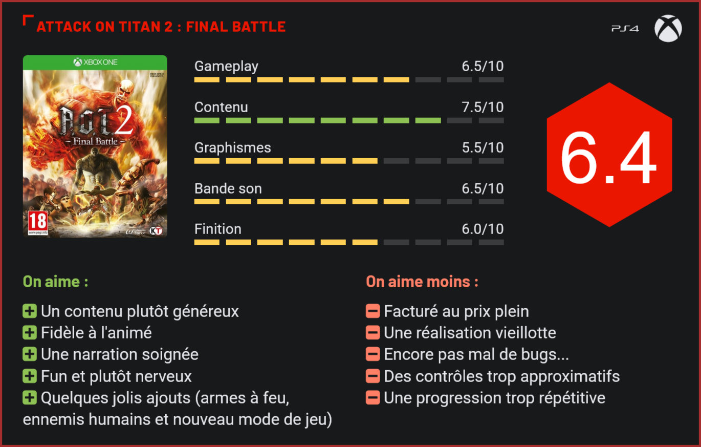 Après un premier volet réussi, Attack on Titan nous était revenu à travers une seconde adaptation qui n’était pas parvenue à corriger les défauts de son ainé. Omega Force tente à nouveau sa chance avec une réédition qui apporte quantité de nouveaux contenus et corrige certains petits défauts du titre. Omega Force, le studio qui se cache derrière la série des Dynasty Warriors, avait tenté de porter en jeu vidéo le très populaire Attack on Titan. Abouti, le premier épisode était parvenu à séduire les fans avec son gameplay très dynamique. Sa suite avait laissé un goût plus mitigé, en se contentant de suivre la route toute tracée par le second volet. Omega Force nous ressert aujourd’hui ce second volet dans une version ultimate enrichie de multiples contenus. Cette réédition comprend donc tout le contenu du second volet et y ajoute l’extension Final Battle. L’aventure principale propose ainsi de parcourir les deux arcs narratifs de la troisième saison de la série, en incarnant les héros du bataillon d’exploration. La force du jeu est de rester très fidèle à l’univers de l’animé et de proposer des dialogues très riches, qui permettront de développer les relations entre les personnages et d’en apprendre plus sur leurs personnalités respectives. On est très loin d’un Dynasty Warriors. On remarquera d’ailleurs que le jeu prend n’hésite pas à prendre son temps. La première heure de jeu fera ainsi office de gigantesque didacticiel. Très vite, on se rend toutefois compte que si sur le plan narratif cette adaptation ne déçoit pas, la mise en scène est en revanche loin d’égaler celle de l’animé. Non seulement ça manque cruellement de punch, mais en plus les séquences d’action auront tendance à toutes se ressembler. Les séquences de jeu alterneront ainsi dialogues, exploration, affrontements face à des hordes de titans dans de vastes zones ouvertes et cut scenes à un rythme impressionnant. L’ennui, c’est que le jeu peine terriblement à se renouveler. On a clairement l’impression de refaire sans cesse la même chose. La bonne nouvelle, c’est que l’édition Final Battle introduit quelques contenus inédits, à l’image du mode reconquête, qui propose de parcourir une carte en enchainant les combats, à la tête d’une escouade de soldats d’élite. Le concept est sympa, mais on sent également là la répétitivité et on regrette très vite que ledit mode se contente du strict minimum en terme de gestion d’équipe. Concrètement, le joueur ne devra pas faire grand chose et pourra changer à volonté de héros. Globalement, le gameplay reste efficace. Omega Force n’a pas hésité à s’écarter très fortement des Dynasty Warriors pour proposer une expérience de jeu beaucoup plus dynamique. Attack on Titan est un jeu qui se joue principalement dans les airs. Le joueur y incarne un soldat d’élite capable de se projeter dans les airs, qui devra affronter des titans, de gigantesques créatures vouées à exterminer l’humanité, et en venir à bout en tranchant leurs membres. Relativement gore, le jeu n’en reste pas moins très accessible, ses mécanismes étant faciles d’accès avec un système de propulsion qui repose sur l’usage de deux boutons, un lock manuel du point d’attaque et un système d’esquive relativement bien fichu. C’est fun, dynamique et on prend vite un malin plaisir à décapiter les titans. Seul bémol : le jeu reste très approximatif au niveau de ses contrôles et le combat pourra vite devenir très brouillon. Par rapport au second volet, Final Battle corrige un peu le tir en introduisant des armes longue portée, qui permettent d’envoyer de gigantesques pieux à la figure des titans. C’est fun et ça fonctionne plutôt bien sur les cibles de taille imposante. Ca fonctionne en revanche un peu moins bien avec les humains… nouveaux ennemis que vous serez amenés à affronter dans Final Battle. La bonne nouvelle, c’est qu’Omega Force en a profité pour corriger l’IA des ennemis, plus vifs que par le passé, et la précision des commandes – sans pour autant que ça transforme du tout au tout le jeu. S’il est donc loin d’être parfait, Attack on Titan 2 Final Battle n’en reste pas moins une adaptation fidèle et plutôt efficace de l’animé, qui devrait n’avoir aucun mal à séduire les fans de la série. On regrettera un certain manque d’ambition du studio et bien sûr une réalisation vraiment datée du jeu. Si la direction artistique du jeu est sympa – et plutôt fidèle à l’animé -, les modélisations manquent cruellement de détails et on a trop souvent l’impression de jouer à un jeu d’il y a 4 ou 5 ans. Conclusion Généreuse en contenu, cette réédition du sympathique Attack on Titan 2 propose de découvrir de nombreuses petites nouveautés au niveau du gameplay, avec l’introduction d’armes à feu, d’ennemis humains et d’un nouveau mode de jeu. Omega Force en a profité aussi pour retoucher l’IA des adversaires et améliorer sensiblement les contrôles. Fidèle à l’animé, cette adaptation en jeu vidéo d’Attack on Titan fonctionne donc plutôt bien, tant sur le plan narratif que du gameplay. On lui reprochera toutefois une certaine répétitivité dans sa progression, un manque d’ambition dans sa mise en scène et une réalisation graphique qui ne fait en aucun cas honneur aux supports. Une chose est sûre, Final Battle est un titre qui se destine presqu’exclusivement aux fans de l’animé – les seuls qui pourront lui pardonner ses nombreux défauts sans sourciller.