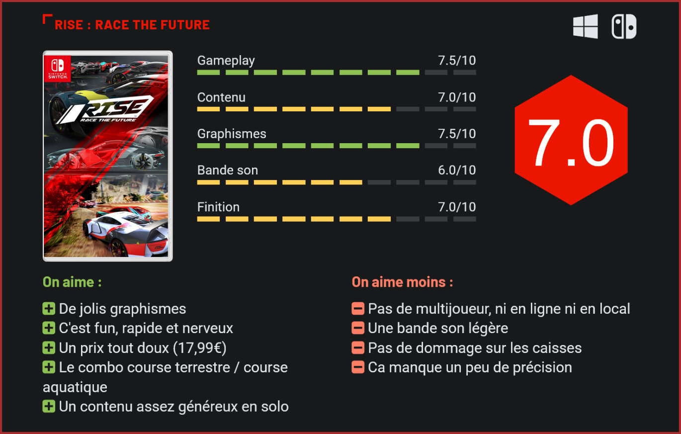 En développement depuis plusieurs années, RISE Race the Future n’avait pourtant que très peu fait parler de lui. Totalement inaperçu au moment de sa sortie, le jeu est pourtant l’une des bonnes surprises de cette saison estivale. Fruit d’un développement de plusieurs années, qui aura connu de multiples remous, RISE Race the Future a bien failli ne jamais voir le jour. Le décès du créateur du jeu avait remis en question le projet. Mais l’équipe de développement a poursuivi le travail et livré une version finale en pleine période estivale. Sorti de nulle part, le jeu est – étonnamment, et malgré son tout petit budget – une très bonne surprise. A mi-chemin entre un Burnout et un Sonic Racing Transformed, RISE tente une approche innovante du jeu de course arcade en proposant de participer à des courses au volant de bolides futuristes capables de se transformer pour circuler à la fois sur terre et sur l’eau. A chaque passage sur une section aquatique, le véhicule se transforme pour glisser sur la surface de l’eau. Atypique, le concept fonctionne étonnamment bien. Les développeurs ont pris soin d’adapter le gameplay entre les deux séquences. Sur terre, le jeu s’apparente à un jeu de course arcade fun mais technique. Sur l’eau, la conduite a tendance à être plus en glissade, à la façon d’un Ridge Racer. Fun et décomplexé, le jeu parvient à tirer son épingle du jeu grâce à son habile mélange de genres. Si on lui regrettera un certain manque de précisions dans ses commandes, RISE n’en reste pas moins un jeu de course très agréable à parcourir et étonnamment exigeant. Car ici, pas de rembobinage possible. Le joueur devra se remettre lui même sur les rails après un crash, et tenter de rattraper son retard. Les courses sont nerveuses et très funs, en grande partie grâce aux excellentes sensations de vitesse du jeu et à la nervosité des adversaires, qui n’hésiteront pas à vous rentrer dedans. On retrouve dans RISE un peu de Ridge Racer, un peu de Burnout et un peu de Wipeout. Le jeu parvient toutefois à développer sa propre identité. Certes, on sent bien que le jeu n’est pas une grosse production. Les menus sont dépouillés, le jeu n’intègre aucune licence officielle, la bande son comprend seulement quelques morceaux et surtout, le jeu ne propose que trois modes de jeux distincts avec des compétitions, des contre-la-montre et des challenges à boucler. Pas de vrai mode carrière donc, ni même de multijoueur (en ligne ou en local). Des défauts que l’on pardonnera facilement en jetant un coup d’œil au prix du jeu, facturé seulement 18€ dans l’eShop. On est en effet très loin d’une grosse production. Car dans le fond, le jeu propose déjà quantité de contenus à explorer à travers son mode compétitions, riche de multiples courses et son mode challenges, qui permet de débloquer de nouveaux véhicules en prenant part à différents défis. Le joueur en aura largement pour son argent. Visuellement, le titre impressionne également pour un jeu à si petit budget. Certes, le motion blur fait un peu office de cache misère et à l’arrêt, les visuels ne sont pas vraiment somptueux, mais en mouvement, le titre impressionne avec ses décors superbes, ses environnements détaillés, ses jolis effets visuels et ses caisses superbement modélisées. On se situe très clairement dans le haut du panier. Si l’absence de multijoueur et de mode carrière est compréhensible, vu le prix auquel est vendu le jeu, on regrettera en revanche que la bande son n’ait pas eu droit à plus d’attention. Minimaliste, elle laisse un goût amer en bouche. Après quelques parties seulement, vous vous surprendrez à couper naturellement le son. L’attention aux détails fait également débat. Certes, il s’agit d’une petite production mais est-il encore envisageable aujourd’hui de proposer un jeu de course dans lequel il n’est pas possible d’endommager son véhicule? Difficilement, et pourtant, RISE a fait ce pari. L’immersion en prend toutefois un coup. Conclusion Mélange improbable de Burnout et de Sonic Transformed, RISE : Race the future est un jeu de course arcade fun et décomplexé qui emprunte à Burnout et Ridge Racer son style de conduite tout en développant sa propre identité avec un mélange de courses aquatiques et terrestres explosif. Etonnamment beau pour un jeu indépendant, le titre de VD-Dev séduit avec son univers atypique et son gameplay nerveux. L’absence de mode multijoueur et d’un vrai mode solo lui porte toutefois préjudice. Vu son prix (17,99€), on excusera toutefois facilement ce vilain défaut. A condition de ne pas se montrer trop exigeants, les amateurs de jeux de course arcade tiennent la leur bonne surprise de cette période estivale.