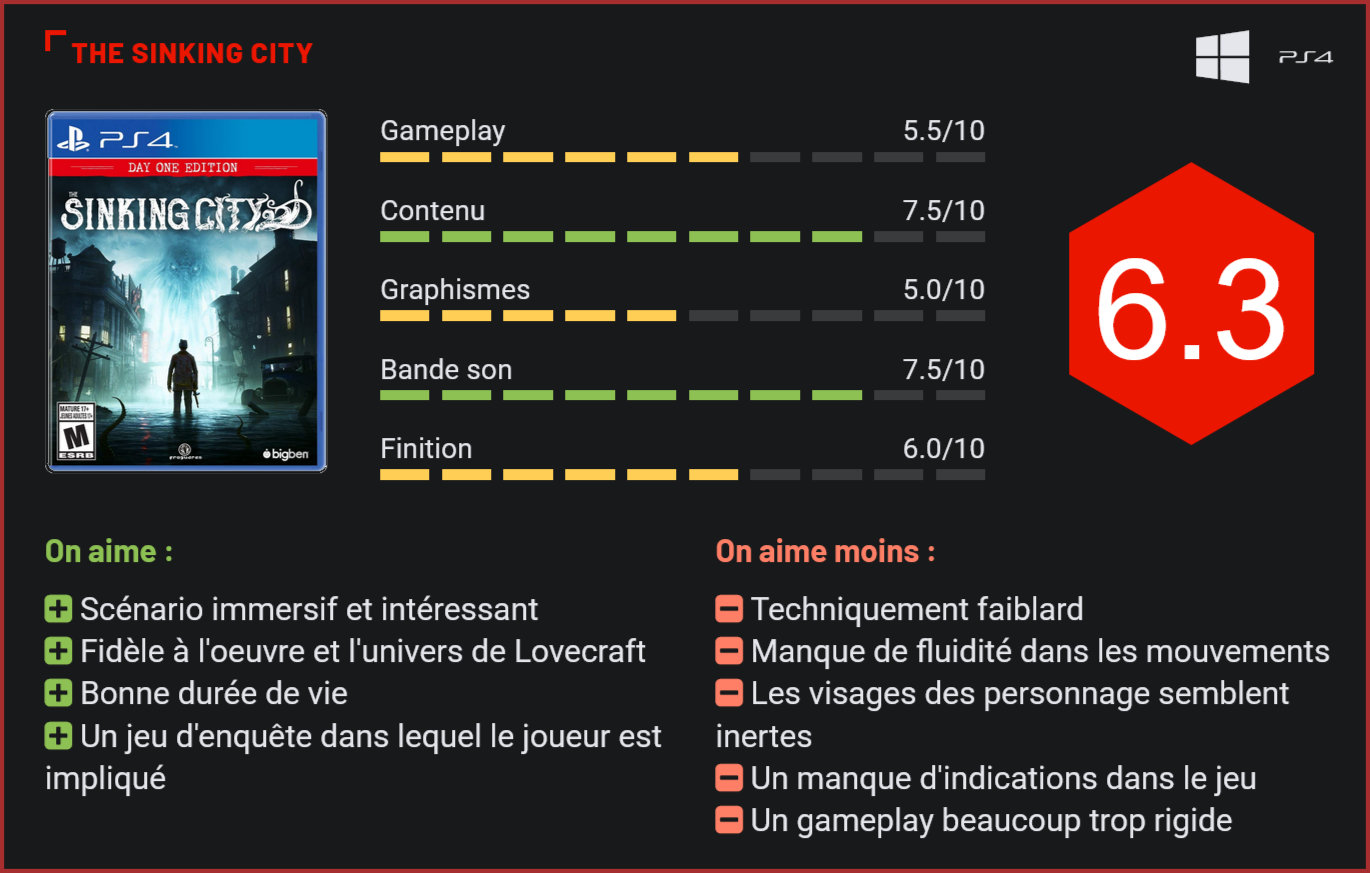 Pour son nouveau titre, le studio ukrainien Frogwares s’attaque à un autre monument de la littérature ; l’univers de HP Lovecraft. Exit Sherlock Holmes, place à un autre genre d’enquêtes mêlant étrangeté, phénomènes paranormaux et autres créatures marines. Comme à son habitude, le studio ukrainien s’inspire de la littérature pour développer l’univers de son jeu vidéo. Cette fois-ci, il prend un tournant à 180°, laissant de côté les sympathiques aventures de Sherlock Holmes pour nous plonger dans l’univers beaucoup plus sombre et lugubre de Lovecraft. Un monde bien connu de Frogwares puisqu’en 2006 déjà, le studio s’était illustré avec un titre inspiré du mythe de Cthulhu, La Nuit des Sacrifiés. Une ville mystérieuse L’immersion dans l’univers si particulier de The Sinking City se fait dès la première fenêtre de téléchargement. On y découvre quelques informations concernant le personnage que l’on va incarner, Charles W.Reed, un vétéran de la Première Guerre mondiale reconverti en détective privé enclin aux cauchemars et visions dérangeantes et mystérieuses. Ce sont d’ailleurs ces dernières qui vont le pousser à se rendre dans la ville fictive d’Oakmont, dans le Massachusetts. D’après l’un de ses contacts, il se pourrait qu’il y trouve des réponses sur l’origine et la cause de ses visions. Mais son voyage ne sera pas de tout repos puisque la ville dans laquelle il accoste est également encline à un mal étrange qui touche l’ensemble de ses habitants. Depuis quelque temps, Oakmont est victime d’une mystérieuse inondation. La malédiction semble également avoir touché les habitants de la petite ville. Notre détective va devoir s’immiscer dans la vie des habitants peu cordiaux d’Oakmont afin de découvrir quel mal ronge la ville. Une quête qui va lui permettre d’en apprendre plus sur lui-même, au risque de découvrir des choses effrayantes. Le moins que l’on puisse dire, c’est que le studio sait parfaitement poser les bases d’un univers et construire un récit. On est rapidement entraîné dans cette histoire étrange et mystérieuse aux nombreux secrets. Le fait qu’elle soit inspirée de l’œuvre de Lovecraft n’en est que plus intéressant et le travail scénaristique est à la hauteur de l’œuvre. Tout au long de la progression dans ce monde ouvert de taille modeste, de nouveaux éléments plus mystérieux encore apparaissent, faisant naître un sentiment de malaise grandissant. Tout dans les décors, personnages et cadres nourrit cette sensation d’étrangeté. Un jeu d’enquête complet L’ambiance dérangeante du jeu est soulignée par le genre dans lequel le titre nous plonge. Il s’agit donc d’un jeu d’enquête en monde ouvert où le joueur semble avoir été jeté sans plus de précautions. En effet, les premiers pas dans The Sinking City seront en peu compliqués tant le jeu laisse le joueur se débrouiller seul. Il arrivera souvent que celui-ci se perde ou rebrousse chemin avant de comprendre où il doit aller et ce qu’il doit faire. Comme seul rempart, le joueur pourra compter sur les nombreux documents et indices qu’il a en sa possession pour avancer dans le jeu. Un aspect assombri par les différents menus disponibles. Passer de la carte, aux indices, carnet de notes, en jetant un œil aux preuves n’est pas des plus agréable ni lisible. Fort heureusement, les indications ne sont pas difficiles à comprendre et le joueur arrivera aisément à deviner où il doit se rendre sur la carte grâce aux différents indices. Il pourra également compter sur les différentes archives de la ville pour suivre une piste. Pour avancer dans son enquête, le joueur devra donc parcourir la ville, discuter avec les habitants, récolter des indices, mais il devra surtout recouper les informations dans le « Palais de la mémoire ». Une tâche qui se passe dans les menus du jeu. Chaque indice trouvé doit être associé à un autre, afin de reconstituer le puzzle. Une fois que celui-ci est fait, tout s’emboite et le joueur peut ainsi avancer dans l’histoire. Ce concept est assez particulier, mais d’autant plus intéressant pour un jeu d’enquête. Il ne s’agit pas simplement de cumuler les indices, mais de trouver un lien entre eux. Bien qu’intéressant, cela ne fera pas appel aux talents de détective du joueur puisqu’il est impossible de se tromper. D’ailleurs, pour mettre la main sur ces indices, le joueur devra réaliser des actions lorsqu’il sera sur une scène de crime. Il devra déclencher une sorte de 3e œil pour voir dans le passé et visionner ce qu’il s’est passé. Une fois qu’il aura vu l’ensemble des « actions », il pourra reconstituer la chronologie des événements en assignant des numéros à chaque élément afin de déclencher un flashback de ce qu’il s’est passé. Autre super-pouvoir de notre détective ; une forme de sixième sens qui lui permet de voir des choses invisibles à l’œil nu, mais également de trouver des passages secrets. En passant à côté d’un mur, on peut parfois apercevoir des oscillations des décors, indices indiquant qu’il est temps d’activer son super-pouvoir. Ici, il est facile de passer à côté de ces oscillations visuelles. Or, ces passages secrets ou fragments du passé sont souvent indispensables à l’enquête et le temps peut être long avant qu’on se rende compte qu’on l’a loupé. Enfin, à plusieurs moments, le libre arbitre du joueur sera mis à contribution. Il devra décider du sort de certains personnages, mentir à d’autres et cela aura parfois de lourdes conséquences sur la suite de l’aventure. Un aspect qui se fera surtout ressentir à travers les nombreux dialogues. L’occasion pour le joueur de se sentir réellement impliqué dans l’histoire. Créatures de l’Enfer L’enquête sera compliquée par la présence de « malbêtes », des créatures sorties tout d