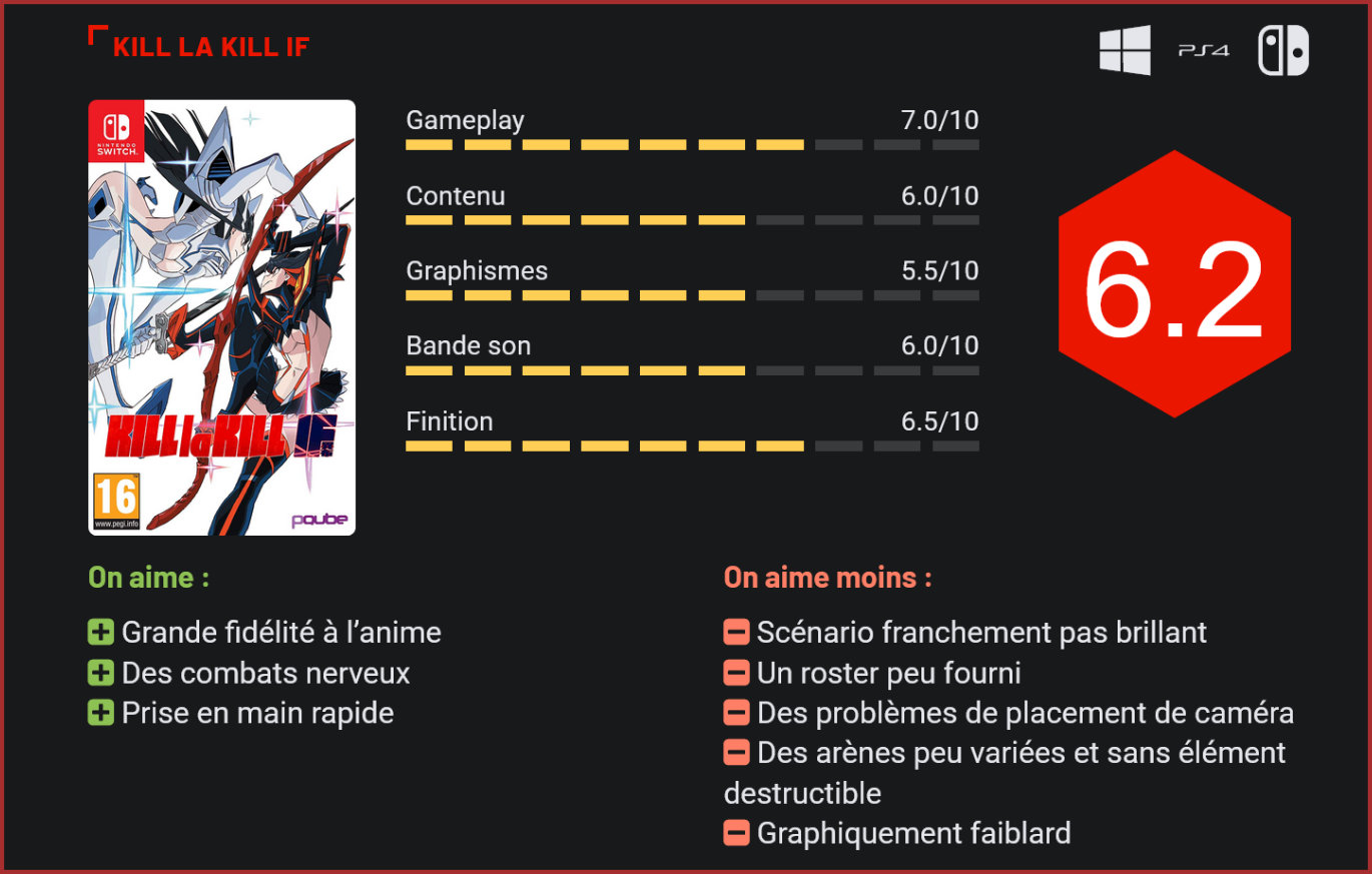 L’anime du studio Trigger (Little Witch Academia) a désormais droit à son jeu de combat qui débarque sur Nintendo Switch, PS4 et la plateforme Steam ce 26 juillet. Une adaptation apte à convaincre son public de niche tout en séduisant les profanes ? C’est le studio Arc System Works, à qui l’on doit les jeux Guilty Gear, BlazBlue ou encore Dragon Ball FighterZ, qui édite cette adaptation de Kill la Kill tandis que Aplus Games se charge du développement, le tout en étroite collaboration avec Trigger. On sent dès les premières secondes de jeu que tout le monde s’est appliqué à reprendre l’esthétique et le ton du matériau d’origine avec fidélité. Devant les efforts effectués à ce niveau, les connaisseurs devraient être ravis, le titre bénéficiant d’une animation fluide, avec notamment des mises en scène soignées lors des attaques spéciales et une narration directement héritée de la série. D’ailleurs le mode Story est au cœur du titre puisqu’il est indispensable d’y passer afin de débloquer les autres modes ainsi que les personnages du jeu. Il propose un récit alternatif et inédit donnant suite à l’épisode 8 de l’anime (qui en contient 24 en tout). On est donc immédiatement plongé au cœur de l’action en passant par une présentation très rapide des personnages et des enjeux, ce qui perturbera sans nul doute le profane qui n’a jamais lancé un épisode de la série. On suit dans un premier temps Satsuki Kiryūin, la présidente du conseil des élèves de l’Académie Honnōji, un endroit où les étudiants disposent de divers pouvoirs grâce à des uniformes constitués de fibres vivantes. Une fois ce premier scénario terminé, un second se débloque, vous mettant cette fois aux commandes de Ryuko Matoi, qui est en quête de vengeance pour trouver l’assassin de son père. L’histoire de Satsuki et Ryuko s’entremêlent autour du pouvoir des fibres, que la Présidente du Conseil d’Administration de l’Académie Ragyo Kiryuin veut utiliser pour contrôler le monde en transformant les humains en esclaves. Rien de franchement original sur le fond, le déroulé étant bardé de clichés, mais la présence de nombreuses (et longues) cinématiques dignes de la série sont agréables à regarder. Néanmoins, il ne faut pas être allergique à ce type de show faisant la part belle à l’absurde et à l’action au détriment de toute profondeur, et qui n’hésite pas à faire régulièrement des gros plans sur les courbes de ses combattant(e)s (ceux-ci étant littéralement mis à nu lorsqu’il sont battus). Il faudra aussi passer outre des ellipses grosses comme des HLM. Bref, vous l’aurez compris, Kill la Kill ne fait pas dans la dentelle, misant tout sur le fun. Fluides et simples d’accès, les combats en arène s’avèrent donc fort heureusement assez nerveux et la prise en main est rapide. Une attaque de base, des coups à distance et un brise-garde avec des variations obtenues suivant la direction donnée sur le stick, avec des possibilités d’enchaînements, sont au programme. Ajoutez à cela un bouton de saut et des super attaques qui se lancent grâce à une super jauge et vous obtenez des possibilités variées, d’autant que chaque personnage possède un style propre à maitriser. Toutefois, on ne dénombre en tout qu’une douzaine de combattants (si l’on compte généreusement les variations Dual-wield de Satsuki et Ryuko ainsi que deux personnages prévus plus tard en DLC), ce qui paraît un peu mince, même face à un Dragon Ball FighterZ. Mais Kill la Kill cache un petit atout en plus : le Bloody Valor, sorte de pierre-papier-ciseau qui permet de faire des dégâts supplémentaires à l’adversaire, de remonter sa barre de vie ou de remplir sa jauge de spécial. Cette feature, toute aléatoire on vous le concède, ajoute toutefois en densité et peut sacrément inverser le cours d’un combat. En cas de victoire, on bénéficie en effet du bonus choisi ainsi que d’une étoile. Jusqu’à trois étoiles peuvent être obtenues et à chacune de celle-ci, le personnage bénéficie de capacités accrues jusqu’à une attaque ultime dévastatrice. De quoi finir un combat avec panache. Pas grand-chose ne vient au final ternir le gameplay du jeu, si ce n’est un système de caméra qui ne s’adapte pas toujours très bien au personnage en venant parfois se placer derrière l’adversaire. On pourrait également regretter que les arènes soient peu variées et dépourvues d’éléments destructibles alors que l’anime n’est pourtant pas avare en destruction de décors. Outre le mode Story qui s’achève en à peine 5h, l’expérience vidéoludique Kill la Kill se complète avec une poignée d’autres modes : entraînement (avec des défis de type survie), battle (comprenant le versus en local ou en ligne, qui tourne correctement) et une galerie où débloquer figurines et éléments sonores du jeu. De quoi faire un peu trop vite le tour de cette adaptation honorable mais non mémorable. A noter que sur Switch – support sur lequel ce test a été effectué – le jeu ne tourne qu’à 30 fps en 720p (contre du 60fps 1080p sur PC et PS4) et affiche des textures quelque peu floutées en mode nomade. Graphiquement, le jeu n’impressionne pas vraiment avec des décors vides et des modélisations simplistes. Il est toutefois agréable de retrouver l’univers de Kill La Kill si fidèlement retranscrit dans un jeu. Car c’est un fait, la direction artistique du jeu est son plus bel atout sur le plan graphique. Conclusion Moins spectaculaire qu’un Dragon Ball FighterZ, Kill la Kill semble avant tout destiné aux connaisseurs de la série éponyme, dont le jeu reprend le ton et l’esthétique avec soin. Le mode story, très ancré dans la trame de la série originale, risque de décontenancer les profanes mais les joutes se révèlent être toutefois assez fun grâce à une prise en main rapide et 