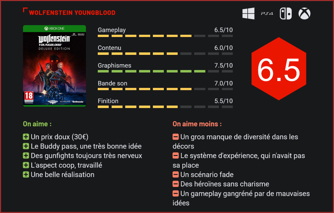 Après déjà 3 épisodes, les Suédois de MachineGames nous reviennent avec un quatrième volet qui prend cette fois la forme d’un spin-off. Orienté coop’, Youngblood ose introduire un peu de sang neuf, sans jamais renier ses origines. Après un second volet très séduisant, Wolfenstein est déjà de retour avec Youngblood, un spin-off conçu par les mêmes développeurs que ceux de The New Order, The Old Blood et The New Colossus, qui prend toutefois une direction très différente… Car n’hésitons à le dire d’entrée de jeu, Youngblood est un jeu qui se joue à deux, en coop. Certes, il est possible d’y jouer seul, et de se faire accompagner par une I.A., mais celle-ci ayant la fâcheuse tendance à se placer au mauvais endroit au mauvais moment, elle vous forcera à recommencer un nombre incalculable de fois les affrontements de boss. Bethesda Softworks a toutefois trouvé une excellente idée pour encourager les joueurs à se lancer malgré tout dans Youngblood puisque la version Deluxe du jeu (vendue 5€ plus cher en magasin) intègre un code qui permettra à un ami de jouer avec vous la campagne. Pour peu que vous ayez un ami qui joue sur la même plate-forme que vous, vous devriez donc y trouver votre compte. Si l’on accepte de passer sur ce défaut – sachant que les 3 précédents volets étaient des titres 100% solo -, Youngblood est un titre plutôt sympa à parcourir. La coop’ fait partie intégrante de la progression ici. Chaque joueur incarne l’une des deux filles de l’agent Blazkowicz. Au cours de la campagne, il faudra donc se couvrir pour éliminer les adversaires, se redonner de la santé, actionner simultanément un interrupteur et appeler à la rescousse son allié en cas de coup dur. Par son level-design, le jeu encourage les joueurs à se séparer régulièrement pour emprunter des chemins différents et se rejoindre ensuite pour se reséparer. Le concept est efficace et on prend très clairement un malin plaisir à massacrer du nazi à deux. L’ennui, c’est que cette nouvelle direction détruit certains acquis de la franchise. La narration passe ainsi clairement au second plan, avec des cinématiques plus courtes, un scénario pas très intéressant à suivre et surtout des rôles principaux aussi charismatiques que des huitres. Du coup, on prend nettement moins son pied en solitaire… Second défaut du jeu : contrairement à Wolfenstein 2, l’aventure de Youngblood ne se déroule qu’en un seul lieu : Paris. La capitale française est sous domination nazie depuis plus de 30 ans. Le concept est intéressant mais dans la pratique on se rend très vite compte que les environnements ont tendance à tout le temps se répéter et que Wolfenstein perd une grosse partie de son charme. Un peu plus de diversité n’aurait clairement pas fait de mal. Plus surprenant encore : la ville de Paris a été entièrement redesignée et arbore, sous l’Allemagne nazie, un design des plus quelconques. La plupart des missions nous feront traverses des environnements sans aucune originalité. Après une première mission qui laisse augurer du meilleur, le joueur retombera ainsi vite les pieds sur terre et découvrira un shooter très générique, qui n’a plus grand chose en commun avec ses ainés si ce n’est la nervosité de ses gunfights, toujours aussi jouissives. Car c’est un fait, tuer du nazi est toujours un véritable délice dans Wolfenstein Youngblood. Le feeling des armes est excellent et on prend un pied magistral à explorer tout l’arsenal du jeu. Que les puristes se le disent toutefois, MachineGames a procédé à de nombreuses retouches au gameplay. Le jeu prend ainsi une dimension RPG avec une montée de rangs progressive, liée à l’expérience, qui permettra d’acquérir de nouvelles compétences et d’améliorer son arsenal. Si l’initiative est louable, on regrette l’apparition régulière d’énormes panneaux à l’écran indiquant la montée de niveau, lesquels viennent parfois surprendre le joueur en plein gunfight. La plupart des compétences n’apportent également pas grand chose de neuf au gameplay. Les fans de Dishonored apprécieront toutefois ces quelques idées, et notamment certains pouvoirs comme l’invisibilité, qui permet d’explorer plus en profondeur l’aspect infiltration du jeu. Certes, Wolfenstein n’est pas un jeu qui s’y prête particulièrement, mais le gameplay fonctionne. Là où on tique en revanche, c’est au niveau des niveaux des ennemis, qui oscilleront du trop facile ou trop difficile. Trop souvent, on sera ainsi amené à espionner ses adversaires pour choisir si on adopte une approche silencieuse pour les éliminer d’un seul coup ou si on fonce dans le tas, la seconde technique s’appliquant le plus souvent face à des ennemis de bas rang. Le concept n’est pas mauvais en soi mais n’avait rien à faire dans un Wolfenstein. Ajoutez à cela des tas de missions secondaires sans grand intérêt qui seront juste l’occasion du faire du grind pour gagner des compétences, et la présence d’une monnaie virtuelle qui n’avait elle aussi rien à faire dans un jeu solo (ou coop’), et vous comprendrez que Youngblood est malheureusement très loin de suivre les traces de ses ainés. Toutes ces nouveautés ne sont pas anodines. Pour cette nouvelle aventure, MachineGames a été épaulé par le studio français Arkane, connu pour la série des Dishonored. On comprendra dès lors l’origine de toutes ces nouveautés. Si l’idée d’apporter du neuf à la franchise n’était pas mauvaise en soi, force est de constater que le résultat final est très en deçà des espérances. Si Youngblood n’en reste pas moins un shooter efficace et relativement fun à parcourir, le titre est gangréné par ses nombreux petits défauts. Bethesda semble l’avoir bien compris puisque le jeu est vendu à petit prix. Il ne faudra en effet débourser que 30€ pour faire l’acquisition du jeu. 
