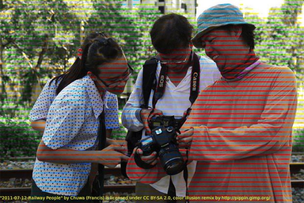 Les illusions d’optique sont aussi bien des outils de divertissement que scientifiques. L’oeil et le cerveau perçoivent des choses qui n’existent pas, ou qui sont faussées. Les illusions ne sont pas une chose du passé, la preuve avec l’expérience menée par un développeur, qui fait passer des images en nuances de gris comme étant en couleur. Le développeur d’outils de traitement d’image Øyvind Kolås s’est fait remarquer, il y a peu, sur Patreon, grâce à une illusion d’optique qu’il a mise au point au cours d’expériences. Grâce à de simples lignes de colorées, il parvient à faire croire à notre cerveau qu’une photo en noir et blanc est en fait en couleurs. Assimilation de l’oeil et du cerveau Le développeur joue avec ce que l’on appelle l’assimilation des couleurs, connue également sous le nom d’effet Bezold. Le professeur en météorologie Wilhelm von Bezold avait en effet découvert que les couleurs pouvaient sembler différentes en fonction de celles qui étaient adjacentes. Un phénomène d’autant plus important que le contraste entre les éléments est grand. “J’en suis arrivé à cette illusion en expérimentant avec différents motifs. Et récemment, j’ai travaillé sur le perfectionnement de l’opération de saturation en m’inspirant d’autres illusions, notamment celles de David Novick en particulier, qui font appelle à l’illusion de Munker”, explique-t-il sur son site. Cette illusion est due à la façon dont le cerveau traite les informations chromatiques et de luminosité. D’après des recherches à l’Université de Murcia, en Espagne, l’oeil est bien plus sensible aux variations lumineuses qu’aux changements de couleur. Comme le contraste est davantage perçu, le cerveau extrapole les couleurs de la grille. Avec des informations partielles, l’oeil croit tout de même percevoir l’entièreté des couleurs de l’image Crédit : Øyvind Kolås Différents motifs et médias L’homme a essayé plusieurs techniques avant de trouver celle qui sied le mieux. Il a ainsi testé les lignes simples, les points ou les mots répétés. Certaines fonctionnant mieux que les autres, comme les lignes ou la grille. L’effet est saisissant et d’autant plus marqué que les éléments se trouvent en périphérie du champ de vision, comme les arbres sur la photo ci-dessus. Certaines couleurs semblent aussi mieux créer cette illusion que d’autres, mais c’est, ici, une question de perception. L’un trouvera le pull rouge de l’homme à droite plus réaliste que la chemise bleue de la jeune fille à gauche. Le développeur ne s’est pas contenté d’expérimenter son illusion sur des images fixes, puisqu’il a appliqué sa grille chromatique à un extrait d’un court-métrage. Du fait des mouvements des personnages, les grilles sont moins perceptibles, ce qui rend l’effet encore plus convaincant. Pour son illusion, Øyvind Kolås a utilisé le programme d’édition d’image open source GIMP. Il s’est aussi basé sur l’outil Generic Graphical Library (GEGL), qui permet différents traitements sur le programme, et permet aux développeurs de créer leurs propres algorithmes. Celui de Kolås est d’ailleurs disponible ici.