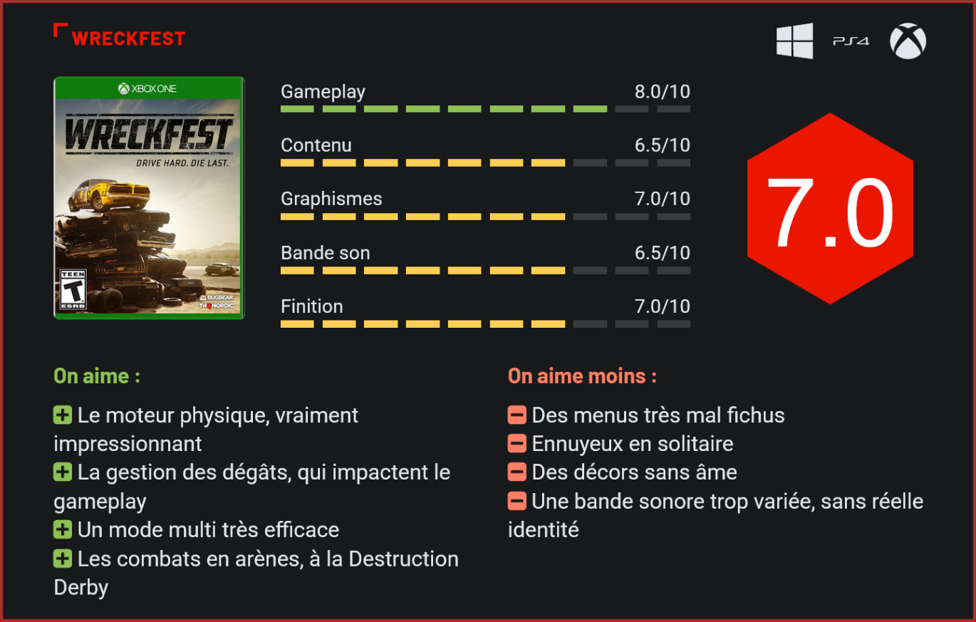 En accès anticipé pendant 4 ans, le nouveau jeu des créateurs de Flatout est enfin disponible dans sa version finale sur PC et consoles. L’occasion de faire le point sur ce fils spirituel de Destruction Derby. Développé par le studio BugBear Entertainment, auteur des premiers Flatout, de Sega Rally Revo et plus récemment du très décevant Ridge Racer Unbounded, Wreckfest est né de la volonté du studio finlandais de revenir à une recette plus proche de son cœur de métier. A l’origine, BugBear s’était en effet surtout fait connaître pour son jeu de course Flatout, sur PC et Xbox. Résolument arcade, le titre proposait de participer à des courses dans des environnements champêtres. Sa particularité? Il était l’un des premiers jeux à proposer un moteur physique très réaliste, prenant en compte la destruction des véhicules. Après trois épisodes, le studio finlandais avait perdu les droits de sa franchise, désormais exploitée par un autre studio. Ses deux dernières créations avaient suscité un engouement très modéré des gamers. Au point que l’on était venu à se demander si BugBear Entertainment survivrait à ces choix étonnants… Mais en 2014, le studio annonce un nouveau projet ambitieux, qu’il compte bien financer lui-même en le proposant en accès anticipé. Wreckfest connait dès ses débuts un énorme succès. Il signe également un retour aux origines pour le studio finlandais, qui propose une expérience de jeu proche de celle des Flatout. 4 ans plus tard, Wreckfest sort enfin de son accès anticipé et débarque sur consoles. Attention toutefois, car si Wreckfest est le successeur de Flatout, il se rapproche toutefois davantage d’un Destruction Derby dans son gameplay et son contenu… Car ici, il ne sera pas (uniquement) question de remporter une course sur un tracé, mais aussi d’éliminer vos adversaires. Le mode carrière fera ainsi alterner des courses sur circuits et affrontements en arènes. Les premières se rapprochent plutôt de Flatout, tandis que les secondes sont inspirées de Destruction Derby. Si, dans les courses, il ne faudra pas forcément éliminer vos adversaires, le contact est toutefois encouragé par la construction des niveaux et la mise en place d’objectifs secondaires. Il faut néanmoins se montrer prudent puisqu’un vilain crash peut conduire votre véhicule à la casse. En arène, le jeu montre toute sa richesse, malgré la simplicité du concept. Le joueur devra tenter de survivre le plus longtemps possible, en éliminant un maximum d’adversaires, ou en choisissant au contraire d’éviter les chocs jusqu’en fin de partie. Plus stratégique qu’il n’y paraît, le jeu se révèle très addictif et surtout très fun. Pour ce qui est des séquences de course en revanche, le constat est plus mitigé. D’une part parce que les tracés se ressemblent tous et manquent cruellement de style. D’autre part, parce que l’aventure en solo n’est pas des plus passionnantes ni imaginatives. C’est paradoxal, mais malgré son excellent moteur physique et sa conduite nerveuse, Wreckfest ne parvient pas vraiment à convaincre, la faute à un jeu qui est finalement beaucoup moins fou que ses ainés. L’excellent Flatout : Ultimate Carnage lui est en tous points supérieur, près de 10 ans plus tard… Et c’est là que le bas blesse, car Wreckfest avait tout pour séduire. Mais que manque-t-il donc au jeu de BugBear Entertainment? Le principal problème du jeu, c’est qu’il reste beaucoup trop sérieux, même lorsqu’il essaye de ne pas l’être. On prendra comme exemple ces séquences de course au volant de véhicules-canapés, drôles sur le papier, mais finalement pas si fendardes que ça. Si Wreckfest propose une belle diversité de défis, on s’ennuie ferme dans son mode carrière sans personnalité et ses décors fades qui se ressemblent tous. La bande sonore semble d’ailleurs avoir subi le même traitement, intégrant des tas de bonnes idées – et de styles musicaux – qui donnent au jeu l’allure d’un fourre-tout dans lequel on aurait tenté de glisser tout ce qu’on avait sous la main sans jamais penser à lui donner une personnalité propre. Pour autant, ne crachons pas dans la soupe : le plaisir de jeu est bien là, en grande partie grâce aux sensations de conduite. S’il est arcade, le jeu n’en reste pas moins exigeant. Foncer dans le tas ne suffit pas, il faut savoir adopter la bonne direction dans les tournants et surtout savoir ou toucher ses adversaires pour les envoyer dans les décors. Sa physique impressionnante – que ce soit lors des collisions ou des crashs dans le décor – en fait un jeu nerveux, sur lequel on prendra particulièrement son pied avec des potes. Et c’est finalement là qu’est tout le problème, car Wreckfest est un très bon jeu de course arcade qui montre tout son potentiel en multijoueurs mais n’a pas grand chose à nous montrer en solo. Dépourvu de ses modes sur consoles, Wreckfest présente le plus d’intérêt sur PC. D’autant plus que si cette version console est vendue à petit prix (39€), et arrive très tardivement, elle n’intègre aucun contenu vraiment neuf. N’espérez donc pas trouver de multi en écran partagé puisque BugBear n’a pas fait l’effort de l’ajouter. Pour le reste, on aurait très clairement été en droit d’en attendre plus d’un jeu acclamé par les critiques qui n’est pourtant sorti de son accès anticipé qu’après une période d’incubation de 4 ans, pour un résultat final très moyennement convaincant. Car si graphiquement le jeu est plutôt joli, il n’a pas beaucoup évolué en 4 ans, et ce qui était très joli il y a 4 ans est aujourd’hui somme toute juste passable. L’exemple typique du jeu totalement overrated, parti d’un très bon concept mais qui s’est quelque peu perdu en cours de chemin… Conclusion Séduisant sur le papier, Wreckfest est l’exemple type du jeu tota