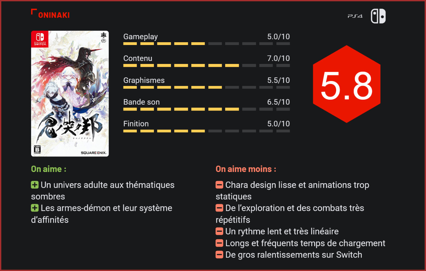 Après les très classiques Lost Sphear et I Am Setsuna qui déroulaient des combats au tour par tour classiques, Tokyo RPG Factory (petite filiale de Square Enix) joue la carte de l’action-RPG dans cet Oninaki exploitant le thème de la réincarnation. L’univers de Oninaki aborde de front la mort en nous plaçant dans la peau d’un gardien pouvant passer du monde des vivants à celui des morts dans le but de maintenir un certain équilibre entre les deux. Sa mission est notamment de trouver les âmes égarées afin de leur apporter la paix intérieure, ce qui leur permettra in fine d’accéder à la réincarnation. Un concept assez original dans le milieu du jeu vidéo, qui, en plus d’être assez sombre et mélancolique dans son approche (le deuil ou le suicide sont abordés), permet de proposer un gameplay où l’on est amené à basculer d’un monde à l’autre pour trouver les âmes en peine. Cependant, basculer dans l’au-delà est risqué car le moindre coup reçu est synonyme de game over sur ces sombres terres. Pour s’y aventurer, il vaut donc mieux trouver au préalable des Voleurs de vue, un type de créature qui, une fois éliminée dans le monde des vivants, libère un vortex qui rend alors l’exploration accessible. De nombreux ennemis sont présents dans les deux réalités parallèles et nettoyer une zone dans l’une d’elle n’élimine pas automatiquement les créatures présentes dans l’autre monde. S’ensuivent donc des combats à grinding très répétitifs, d’autant que le bestiaire tourne autour d’une poignée de monstres différents au design peu inspiré. Plus orienté action qu’exploration (les quêtes sont de surcroît très linéaires), Oninaki prend davantage des allures de hack’n slash plutôt que de RPG profond. Heureusement, la présence d’armes plutôt originales relève quelque peu l’intérêt du joueur qui commençait déjà à s’assoupir. Celles-ci sont en réalité fournies par des démons qui se rallient à votre cause. En étant « possédé » par ces derniers, on bénéficie de son arme et de ses capacités. Un système d’expérience traditionnel combiné à un système d’affinité permet d’acquérir de nouvelles capacités au sein d’un arbre des talents plutôt bien pensé en ce sens. Avec jusqu’à quatre démons assignés, il est dès lors possible de passer d’un démon à l’autre en plein combat, ce qui permet des approches différentes et de sortir des enchaînements parfois très efficaces grâce aux capacités acquises au fil de l’aventure. Mais cela ne suffit pas à véritablement rendre l’aventure plus excitante, le jeu manquant cruellement de panache à tout niveau. La mise en scène est très statique, les animations sont rigides, le système d’esquive est si raté qu’il parait inexistant (il faut utiliser un dash ou sauter pour éviter les coups ennemis) et les boss comme les PNJ manquent cruellement de personnalité. Sur notre test effectué sur Nintendo Switch, le jeu souffre en outre de gros ralentissements, même hors des séquences d’action et subit de longs et fréquents temps de chargement. Un peu à la ramasse du côté technique (les graphismes paraissent datés, que ce soit sur PS4 ou sur Switch), et même la bande-son, pourtant servie par une musique plaisante, fait pâle figure lorsque l’on traverse certains environnements parfois dénués d’effets ou d’ambiance. Pas terrible en termes d’immersion. Conclusion Oninaki ne sauve les meubles que grâce à sa narration aux thématiques adultes et ses armes-démons originales. Si l’on ferme les yeux sur le chara design désincarné, les animations rigides, la grande linéarité et répétitivité de l’exploration ainsi que des combats, il est possible d’accrocher à ce RPG au look atypique. Mais les ralentissements et les nombreux temps de chargement rencontrés, notamment sur Switch, risquent de définitivement décourager les plus persévérants qui espéraient peut-être un action-RPG riche mais se retrouvent au final face à ce qui ressemble plutôt à un pauvre hack’n slash presque entièrement dénué de vie. Bref, il n’y a pas grand chose à sauver dans cet action-RPG, qui aurait sans aucun doute mérité quelques mois de développement supplémentaires…