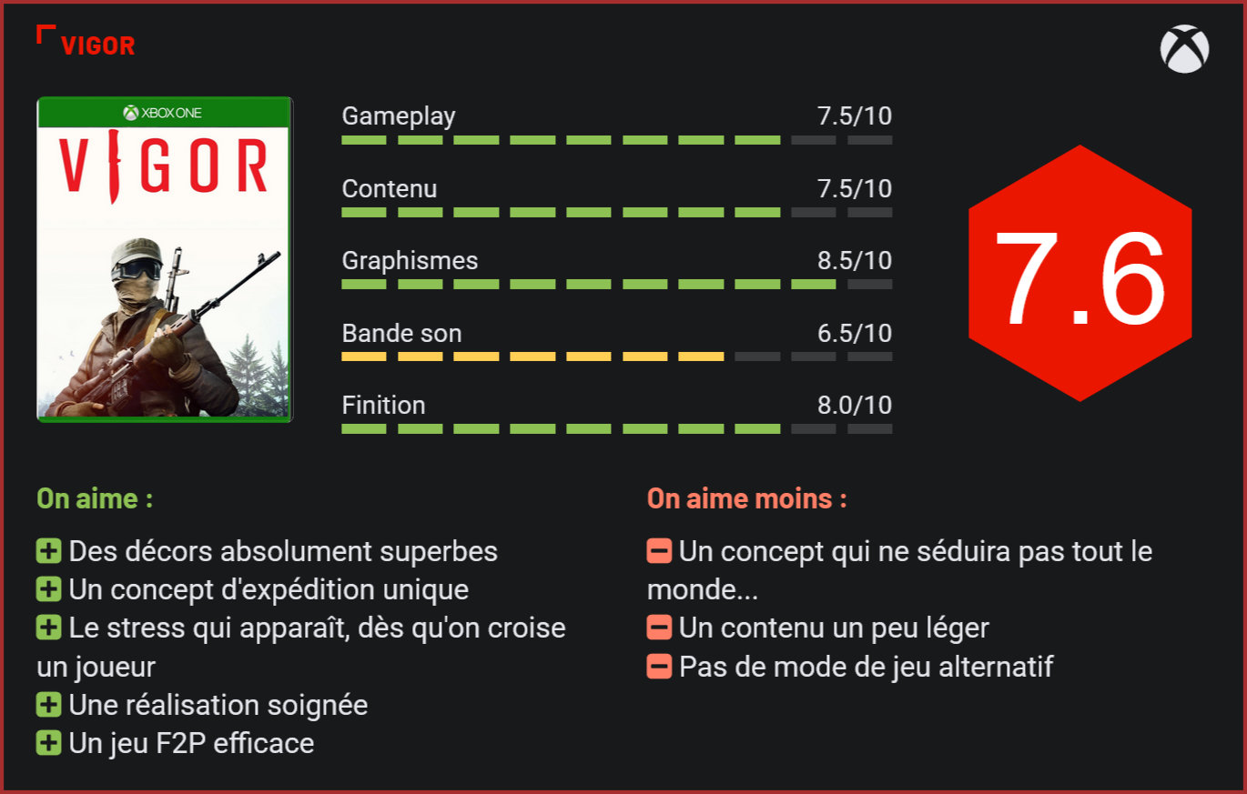 Après DayZ, Bohemia Interactive nous sert un nouveau TPS multijoueur, toujours axé sur la survie et qui se démarque de ses concurrents par la beauté de ses décors, presqu’emprunts de poésie. Si DayZ ne nous avait pas vraiment convaincus, son petit frère, Vigor, nous a agréablement surpris. Le dernier jeu de Bohemia Interactive débarque en exclusivité sur Xbox One, dans sa version finale, après une longue période de bêta. Et le moins que l’on puisse dire, c’est que le studio tchèque nous livre un jeu aux antipodes des standards actuels. Car s’il est axé sur la survie et le multijoueur, Vigor est un jeu radicalement différent des Fortnite et autres Apex Legends. Le jeu de Bohemia Interactive adopte un gameplay très réaliste tout en proposant un concept totalement unique puisqu’il n’est pas nécessaire de s’affronter ici. Le concept du jeu repose entièrement sur le loot. Certes, le joueur a à sa disposition un joli arsenal, qu’il pourra utiliser pour massacrer les autres joueurs présents sur la carte, s’il le souhaite. Mais agir de cette façon risque de vous mener droit au cimetière, et de perdre par la même occasion tout votre armement et vos objets glanés durant la partie. Dans Vigor, le joueur devra principalement collecter armes, ressources, munitions et plans pour ensuite les rapatrier à sa cabane – sorte de petit havre de paix -, qu’il pourra améliorer en dépensant les ressources gagnées. Chaque upgrade prend un certain nombre de minutes ou d’heures pour être installé. Il faudra donc se montrer patient pour toucher au bout de l’aventure… Ce qui marque dès la première partie, c’est la beauté du jeu, qui tire parfaitement parti des capacités de la Xbox One X en proposant d’explorer de vastes environnements ouverts. La particularité de Vigor, c’est de proposer un cadre champêtre véritablement unique puisque vous explorerez ici les contrées reculées de la Norvège, la seule zone d’Europe qui semble avoir été épargnée par une terrible guerre nucléaire que se sont livrées les grandes puissances. Avec ses vastes étendues sauvages, ses églises en bois, ses villages colorés, ses gigantesques pythons rocheux, la Norvège offre un cadre unique à explorer. Si les cartes sont relativement peu nombreuses – on en dénombre 6 -, elles offrent toute une grande diversité de décors et une excellente rejouabilité. On apprécie particulièrement les conditions climatiques qui relookent intégralement chacune des maps selon les saisons. La même carte n’a plus du tout la même allure en été et en hiver. Sous la pluie également, des décors verdoyants peuvent soudain adopter une allure sinistre. L’univers très particulier de Vigor lui donne un charme certaine – charme qui contraste radicalement avec la dangerosité des missions de loots que vous enchainerez. Car oui, dans Vigor, la mort vous guette en permanence. On notera d’ailleurs que l’un des points forts du jeu est cette sensation pesante pratiquement permanente que l’on peut croiser un adversaire qui nous logera une balle dans la tête. Les joueurs sont peu nombreux sur la carte – on en dénombre une petite dizaine tout au plus -, mais les quelques rares rencontres mènent souvent à des fusillades épiques. Pour autant, la violence n’est pas forcément la solution à toutes les rencontres… Il arrive très souvent que deux joueurs se croisent et choisissent de s’ignorer pour continuer leur loot tranquille. Le fait que l’assassinat ne soit pas la finalité du jeu confère à Vigor un statut tout particulier. Ceci étant dit, éliminer un autre joueur permet de récupérer son propre loot…. Le moment fort de la partie, c’est bien sûr le largage d’une caisse au milieu de la carte, qui conduira de nombreux joueurs à se diriger vers cette zone et à prendre parfois de très gros risques pour récupérer le loot ultime. Le facteur risque est toutefois très important à prendre en compte, car les munitions, armes et équipements sont rares dans Vigor, et on aura dès lors tendance à éviter la confrontation pour éviter de perdre tout son matos en cours de partie… La ruse et la stratégie font partie intégrante du jeu. On notera d’ailleurs qu’en début de partie, il est possible d’investir quelques couronnes, la monnaie virtuelle du jeu, pour choisir d’augmenter la valeur du loot, de la caisse larguée au milieu du champ de bataille ou de s’assurer la récupération du matos en fin de partie, si l’on décède en cours de partie… Autant d’éléments qui auront tendance à changer la stratégie du joueur en cours de partie. Autre élément unique : le joueur choisit quand la partie se termine. Vous avez récupéré suffisamment de loot après 5 minutes? Rien ne vous empêche de vous enfuir par l’une des portes de sortie du niveau! Rares seront les joueurs qui resteront jusqu’en toute fin de partie et devront lutter pour leur survie… L’équilibre en le loot et les gunfights est brillamment respecté. Chaque partie sera dès lors radicalement différente, et c’est tout ce qui fait le charme de Vigor. Visuellement superbe, le jeu de Bohemia Interactive montre que la Xbox One X en a encore dans le ventre, et se positionne sans difficulté comme l’un des plus beaux TPS multijoueurs du moment. La réalisation du jeu joue très clairement en sa faveur. S’il se montre assez léger en contenu – il n’y a aucun mode de jeu alternatif -, Vigor n’en offre pas moins un excellent retour sur investissement. Le jeu est totalement free-to-play et n’est financé qu’à travers des achats in-app avec une monnaie virtuelle. Pour progresser, il ne faudra toutefois pas forcément mettre la main au portefeuille. Comme dans un Apex Legends, l’essentiel des achats sont purement cosmétiques. Pour en faire le tour, on comptera tout de même une bonne douzaine d’heures. Ce qui reste assez léger pour un jeu de ce type