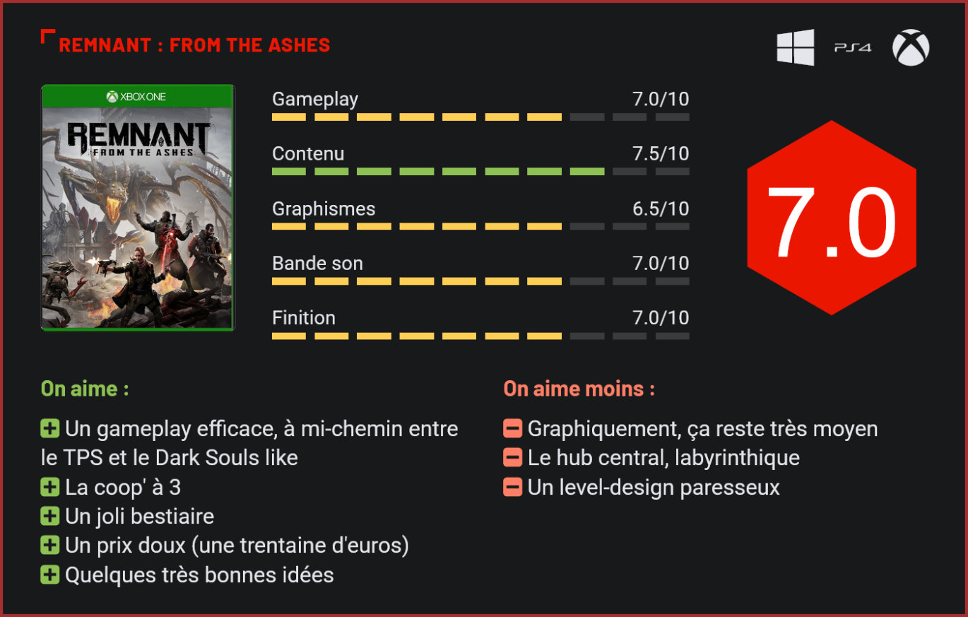 En cette période très chargée, Gunfire Games (DarkSiders 3) tente sa chance avec une nouvelle licence. S’inspirant ouvertement de Dark Souls, le nouveau projet du studio sort des sentiers battus pour tenter un mélange de jeux totalement inédit. Et le résultat est étonnamment bon… Personne ne l’attendait et pourtant, Remnant : from the ashes parvient à créer la surprise avec son concept totalement atypique. Certes, d’autres studios avaient tenté de porter le concept des Dark Souls à la sauce SF, sans vraiment y parvenir. L’immonde Immortal en atteste. Mais alors que l’on s’attendait à un jeu tout juste moyen, Remnant : from the ashes parvient à agréablement nous surprendre. Dans un monde post-apocalyptique, le joueur incarne un survivant qui devra tenter de se frayer un chemin parmi les ténèbres, accompagné par toute une communauté de survivants. Vu et revu, le scénario de Remnant : from the ashes ne réserve pas beaucoup de surprises mais n’en reste pas moins efficace. Les développeurs du jeu l’avaient toutefois spécifié dès le début, c’est du côté du gameplay que leur jeu se démarquerait des autres productions. S’il reprend la formule des Dark Souls, à savoir de l’exploration et des combats ultra-punitifs, Remnant : from the ashes parvient à s’en détacher suffisamment pour que l’on ne l’accuse pas de plagiat. Le jeu est à ce titre une franche réussite puisque non seulement il parvient à mixer brillamment combats à l’arme blanche et aux armes à feu, mais en plus il propose un mode coop’ terriblement efficace, jusqu’à 3 joueurs. Contrairement à un Dark Souls, Remnant ne propose pas une succession de donjons. C’est d’ailleurs sont plus gros défaut : les niveaux du jeu sont générés de façon procédurale. Ce qui veut dire que votre meilleur ami traversera des niveaux totalement différents des vôtres. La bonne nouvelle, c’est que ça permet d’être sans cesse surpris. La mauvaise, c’est que le level-design est loin d’être créatif… Ceci étant dit, on lui pardonnera facilement ce défaut en appréciant à sa juste valeur son gameplay à deux vitesses. Tout d’abord parce que le jeu propose différentes classes, qu’il est possible de faire évoluer à l’aide des points d’expérience. Ensuite, parce que son gameplay permet justement d’alterner les combats au corps à corps, à la façon d’un Dark Souls, et à distance, à la façon d’un TPS. Exigeant, sans être aussi punitif qu’un Dark Souls, le jeu n’en reste pas moins fun et nerveux. Les sensations sont là et on prend un pied magistral à enchainer les combos face à des hordes de monstres aux designs plus inspirés les uns que les autres. Technique, le jeu de Gunfire Games pousse le joueur à user et abuser de l’esquive, à alterner combat au corps à corps et tirs à distance et à améliorer sans cesse son armement. Les consommables sont également incontournables pour regagner un peu de vie en mission. Comme nous l’avons dit, le challenge est là, même si la difficulté est un bon cran en-dessous d’un Dark Souls. Ceci rend le jeu beaucoup plus accessible – et fun – qu’un Sekiro par exemple. C’est toutefois à 3 joueurs que Remnant : from the ashes montrera tout son potentiel. Affronter des ennemis seul, c’est amusant un temps, mais la coop’ est ici un élément central du gameplay et les affrontements en équipe ajoutent réellement une profondeur au jeu. Tout d’abord, parce qu’il est possible de venir à la rescousse d’un allié tombé sur le champ de bataille, en le réanimant. Ensuite, parce que la difficulté est relevée d’un cran et le fun est réellement là. Enfin, parce que les affrontements face aux boss titanesques du jeu sont largement plus funs à trois joueurs! Alors certes, on pourrait reprocher à Remnant : from the ashes son level-design un peu paresseux, sa réalisation graphique “moyenne” (mais très convaincante néanmoins pour un jeu à petit budget), son HUB labyrinthique que vous devrez explorer à de multiples reprises ou ses menus pas très sexys, mais dans l’ensemble, l’expérience n’en reste pas moins très bonne, en particulier en coop’. Sans être extraordinaire, le jeu de Gunfire Games se révèle efficace, fun et suffisamment bien pensé pour nous tenir scotché à notre pad. Le jeu propose une belle diversité de décors, dispose d’une réalisation solide et offre une durée de vie très confortable pour un prix qui reste très attractif puisqu’il ne faudra débourser qu’une petite trentaine d’euros pour mettre la main sur ce jeu. Alors oui, ce n’est pas le jeu de l’année, mais vous passerez néanmoins un très bon moment dessus entre amis. Conclusion Sorti de nulle part, Remnant : from the Ashes est l’une des bonnes surprises de cette rentrée 2019-2020. Le nouveau jeu de Gunfire Games (DarkSiders 3) a beau s’inspirer ouvertement de Dark Souls, il parvient à développer son propre univers et surtout ses propres idées. Le concept est en tout cas beaucoup plus abouti que dans le très décevant Immortal, qui avait déjà tenté de combiner un gameplay exigeant à la Dark Souls avec des armes à feu et un univers SF. Malgré une réalisation un peu cheap et quelques idées mal exploitées, le jeu de Gunfire Games parvient à convaincre. Très efficace, en solo comme en coop’, le jeu se montre suffisamment nerveux pour tenir les joueurs scotchés à leur pad. La surprise est d’autant plus bonne que le titre est proposé à un tarif réduit. Il ne faudra en effet pas dépenser plus d’une trentaine d’euros pour mettre la main dessus.