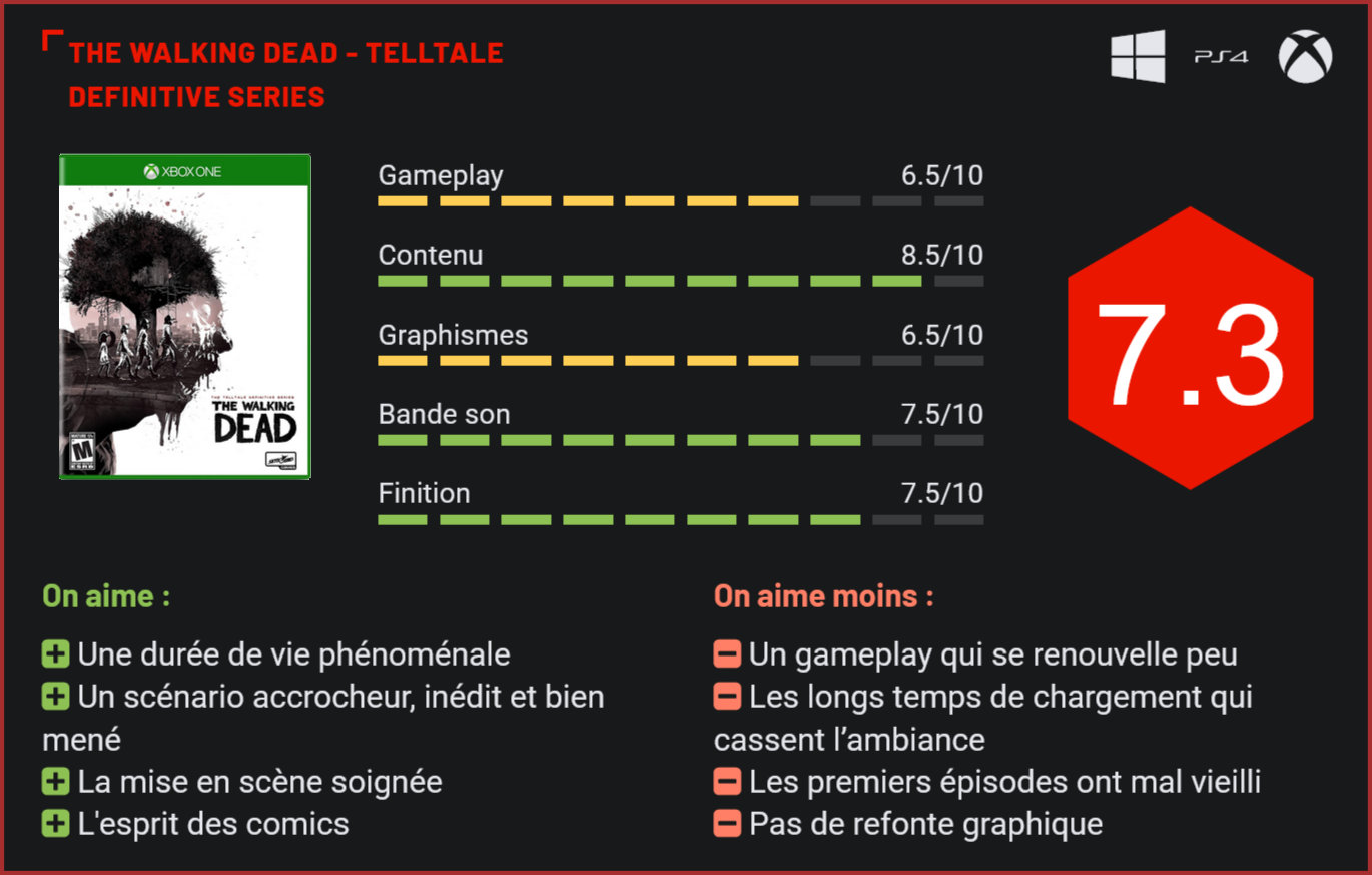 Si la saga des Walking Dead a touché à sa fin dans l’univers des jeux vidéo, Skybound Games est bien décidé à rentabiliser son investissement. Le studio de développement livre – après avoir bouclé l’ultime saison de la série – une compilation rassemblant l’intégrale de The Walking Dead. Porte-étendard de Telltale Games en son temps, la série The Walking Dead aura connu au total quatre saisons et deux spin-off, avant d’arriver à son terme. La fin de l’aventure se sera faite dans la douleur, avec la fermeture du studio de développement. Heureusement, un autre studio de développement s’était présenté pour sauver le projet et avait terminé l’ultime saison de la série pour permettre aux fans de réexplorer la franchise. Le résultat était plutôt satisfaisant. Sans surprise, Skybound Games rebondit sur le succès de cette ultime saison et nous livre aujourd’hui une intégrale qui permettra aux fans de la série de redécouvrir les 23 épisodes du jeu vidéo. The Final Season reste l’une des saisons les plus réussies de la série. Niveau contenu, on retrouve donc les quatre saisons de la série, mais également le spin-off sur le personnage de Michonne et le DLC 400 Days. Au total, cela représente tout de même près de 50 heures de jeu, en ligne droite. Un contenu bien généreux, pour un tarif qui reste très compétitif. Il ne faudra en effet débourser que 49,99€ pour mettre la main sur l’intégrale de la série. Ceci étant dit, il ne fait aucun doute que toutes les saisons du jeu ne se valent pas. Les 2 premières saisons de The Walking Dead ont par exemple bien mal vieilli – normal puisqu’elles datent de l’ère de la Xbox 360 et de la PS3. On regrettera toutefois que les jeux n’aient subi aucun lifting. Cette réédition aurait pu être l’occasion pour le studio d’ajouter quelques assets voir de corriger certains éléments du jeu. Les épisodes les plus datés ont assez mal vieilli… Pour autant, difficile de reprocher à une intégrale de ne pas avoir mis à nouveau l’intégral du contenu. Retravailler les premières saisons de la série aurait nécessité un très gros travail des graphistes. On notera au passage que cette intégrale est une petite mine d’or pour les passionnés de la série puisqu’elle compte plus de 10h de commentaires des développeurs, est livrée avec un documentaire sur les coulisses du jeu et ajoute un nouvel effet visuel – graphic black – lequel retravaille entièrement la luminosité pour rendre l’expérience encore plus immersive et plus en accord avec l’univers graphique des comics. Déjà présent dans L’ultime saison, le bonus est désormais activable pour l’intégralité des épisodes répartis sur les presque 6 saisons du jeu. Pour le reste, il ne faudra pas s’attendre à de grosses surprises. Ceux qui avaient déjà parcouru les premières saisons n’auront que peu d’intérêt à se replonger dans cette compilation puisque le contenu n’a pas évolué. L’aventure narrative de Telltale se déguste toujours aussi bien, à la façon d’une série télévisée. Le joueur est ici plus spectateur que partie intégrante de l’histoire, la majorité des choix étant posés à travers des dialogues. A condition de ne pas être allergique à cette formule, difficile donc de ne pas être séduit. D’autant plus qu’aux côtés de Batman, The Walking Dead reste l’une des plus belles réussites du studio. Conclusion Généreuse en contenu avec ses (presque) 6 saisons, 23 épisodes et 50 heures de jeu, The Walking Dead – Telltale Definitive Series permettra aux nombreux joueurs qui étaient passés à côté de la série épisodique de Telltale de jouer les séances de rattrapage en réexplorant l’œuvre du studio. L’éditeur Skybound a ajouté quelques petits bonus à cette compilation, incontournable pour les fans, mais qui n’apporte en soi rien de vraiment neuf à l’équation. On regrettera ainsi par exemple que les premiers volets de la série n’aient pas subi un petit lifting graphique. Mais même à 49,99€, The Walking Dead – Telltale Definitive Series n’en reste pas moins un jeu passionnant à parcourir de bout en bout, et qui propose surtout une aventure très différente des événements narrés dans la série puisque l’histoire suit ici la transformation de Clémentine, une jeune enfant séparée de ses parents qui se transformera au fil des épisodes en une redoutable guerrière.