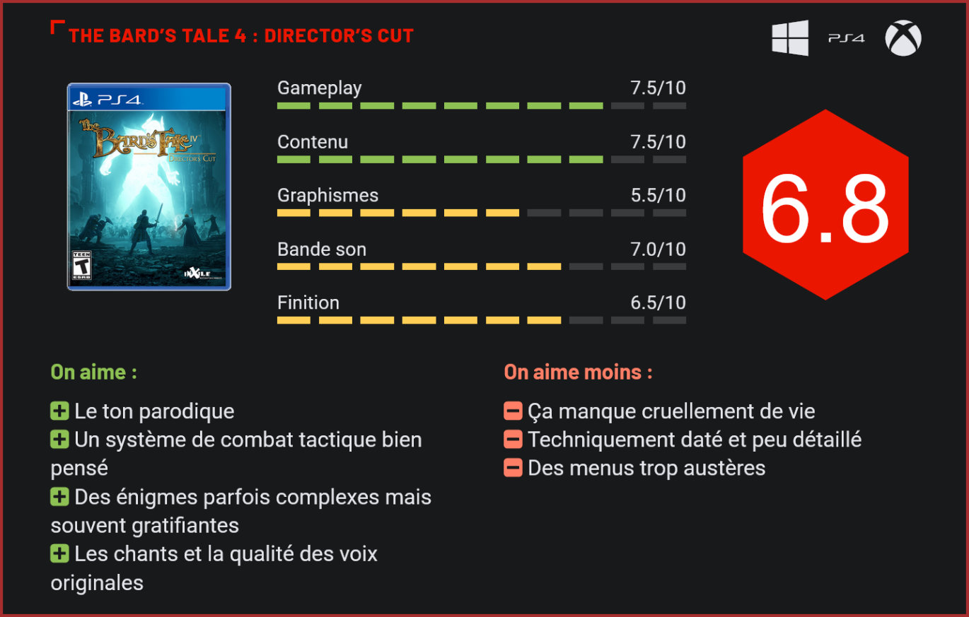 Sorti l’année dernière après une campagne kickstarter, The Bard’s Tale 4 : Barrows Deep se voit mis à jour en cette fin d’été 2019 dans un director’s cut corrigeant quelques vilains bugs. De quoi se replonger dans de meilleures conditions dans ce dungeon crawler old school à la savoureuse touche parodique. Pour les plus jeunes joueurs, la série The Bard’s Tale n’évoque peut-être pas grand-chose. Remontant aux années 1980, les premiers jeux se présentaient sous la forme de dungeon crawlers parodiant les jeux de rôle de l’époque ancré dans un univers fantasy digne de Tolkien. On y suivait à la première personne un barde, accompagné de cinq autres aventuriers, qui pouvait lancer des sorts en chantant des mélodies, habilité pouvant être restaurée ou boostée en consommant de l’alcool. Plusieurs décennies plus tard, les choses n’ont pas vraiment changé et l’humour reste omniprésent dans ce Bard’s Tale 4 proposant son lot de donjons à explorer, d’énigmes à résoudre, de combats au tour par tour et de chansons à apprendre. C’est grâce à une campagne kickstarter que la série a pu être prolongée dans ce quatrième volet chapeauté par le studio InXile. L’aventure débute dans la traditionnelle ville de Skara Brae, ici sous l’emprise de fanatiques religieux qui n’hésitent pas à faire pendre ceux qui s’opposent à leur idéologie. C’est dans ce contexte que le joueur dirige la guilde des aventuriers composée de cinq hors-la-loi parmi lesquels des combattants, praticiens, roublards et, bien sûr, l’inévitable barde. Passé une phase de personnalisation classique, on découvre les caractéristiques, souvent atypiques, de chaque personnage et le système de combat en place. Sur une grille de combat de 4×4 cases où l’on occupe 8 emplacements, on découvre les capacités de ses unités et l’on apprivoise la dimension tactique du titre. Le positionnement est en effet ici primordial et il faut dépenser ses points d’action de manière judicieuse. Déplacer une unité coûte un point et les coups et sorts de chaque personnage ont une certaine portée dont il faut tenir compte. Ainsi, une capacité consistant à faire léviter un ennemi pour le délocaliser s’avèrera parfois plus utile que de le frapper comme une brute. Le cerveau prend donc souvent le dessus sur les muscles. En plus de leur barre de santé, les ennemis disposent parfois aussi d’une jauge mentale utilisée pour lancer des coups chargés prenant effet au tour suivant. Là aussi, il faudra composer sur un bon placement pour éviter ces attaques dévastatrices ou sur l’utilisation d’une capacité spécifique infligeant des dégâts à cette jauge mentale. De quoi apporter suffisamment de variétés à ces combats très stratégiques. Le véritable plus provient donc de capacités précises, souvent originales, comme celles du barde par exemple, qui peut voir sa force augmenter s’il a consommé de l’alcool…jusqu’à ce qu’il tombe dans le coma éthylique en cas d’abus. Tout est question de dosage dans The Bard’s Tale 4, ce qui est plutôt bienvenu. Les améliorations passent par un arbre des compétences bien pourvu et l’équipement s’avère lui aussi très complet. On regrettera par contre les menus et inventaires désuets qui auraient mérités plus de clarté et de modernité. L’aspect technique manque lui aussi de fluidité, le jeu ramant encore de temps en temps (malgré les améliorations apportées par la mise à jour) et affichant des textures parfois grossières. Le jeu arbore pourtant un certain style soigné et de la variété dans ses environnements, mais il manque cruellement de détails et de finition, tout comme l’allure et les visages des PNJ qui vous paraîtront trop souvent angulaires et très statiques dans leur animation. Le jeu manque d’ailleurs globalement de vie et de dynamisme, autant dans son rythme que dans son histoire (somme toute très classique). L’autre aspect du jeu consiste à explorer des donjons fait de nombreux pièges et énigmes de plus en plus alambiqués. De nombreux trésors et passages secrets en font partie, et l’exploration est la plupart du temps gratifiante. Les ennemis sont très présents, et il est possible de les contourner (certains seront trop puissants pour vous au début de l’aventure) ou de les attaquer en premier pour obtenir l’avantage de la première attaque. De nombreux PNJ avec lesquels il est possible de converser longuement sont aussi là, ce qui apporte beaucoup de substance au lore du jeu. N’oublions pas les chants poétiques et décalés qui font intégralement partie du charme de cette aventure, avec la présence de très belles vocalises. Il en est de même pour les voix originales (la v.o. est absolument incontournable) à la consonnance délicieusement scottish. Il faut d’ailleurs rappeler que la musique est un élément central dans The Bard’s Tale et que l’apprentissage de chants vous permettront entre autres de déloquer certains passages pour progresser dans l’aventure. L’édition Director’s Cut qui vient de sortir ajoute un nouveau donjon à l’aventure, un nouveau chant permettant de passer les casse-têtes trop rébarbatifs, des options de personnalisation des personnages et d’autres bonus (objets, musiques). Un rééquilibrage général a également été effectué, permettant notamment de corriger de nombreux bugs qui étaient parfois très handicapants dans la version initiale. A noter que cette grosse mise à jour est gratuite pour ceux possédant déjà le jeu et que le titre est accessible via le Xbox Game Pass, ce qui est un beau moyen de plonger dans cette aventure ne manquant pas de charme et de dérision. Conclusion Malgré ses carences techniques et quelques mécaniques très classiques, The Bard’s Tale 4 tire son épingle du jeu par son approche humoristique et son univers musical enivrant, tout en embarquant un syst