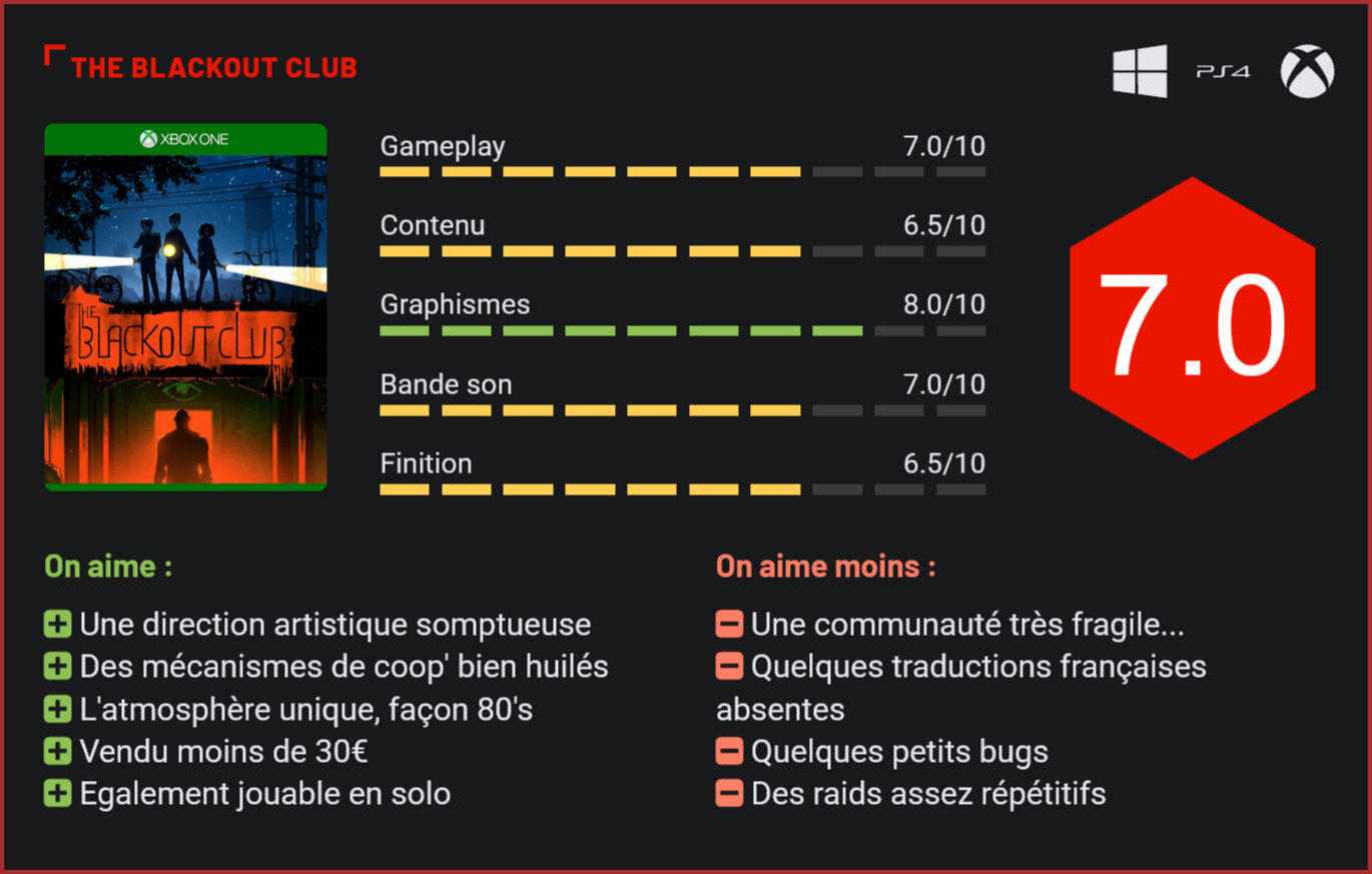 Sorti d’abord sur PC en accès anticipé, le très étrange The Blackout Club a eu droit cet été à une sortie en catimini sur consoles. L’occasion de se pencher sur ce titre complètement à part… Noyé dans le flot ininterrompu des sorties estivales, The Blackout Club n’aura décidément pas beaucoup fait parler de lui dans la presse. Le titre du petit studio indépendant Question Games est pourtant l’une des bonnes surprises de cette année… Le jeu a entièrement été pensé pour être joué en coop’. Jeu d’horreur coopératif se jouant entièrement à la première personne, The Blackout Club tire son inspiration des Left-4-Dead et autres World War Z. L’approche est toutefois radicalement différente ici, car si l’aventure se joue de préférence à 4 (on peut également y jouer en solitaire), le focus n’est pas mis sur l’action mais sur l’infiltration. Dans The Blackout Club, vous n’incarnerez pas un soldat des forces spéciales mais un adolescent qui enquête sur d’effrayants événements qui se déroulent dans sa ville. Chaque nuit, tous les habitants de la petite bourgade se lèvent et errent, contrôlés par une force mystérieuse. Un petit groupe d’adolescents découvre l’étrange machination et décide d’agir, formant le Blackout Club. La nuit, ils se lèvent et mènent l’enquête. Les parties prennent la forme de courtes missions au cours desquelles il faudra rassembler des preuves, coller des affiches ou récupérer le téléphone d’un membre du club disparu. Le joueur part à l’aventure avec trois autres adolescents, qui se répartissent les tâches en début ou en cours de partie. La zone de jeu étant assez vaste, il faudra être capable d’agir en synergie pour avancer dans le jeu… D’autant plus que les dangers sont nombreux. Car les adultes possédés rôdent en nombre dans la petite bourgade. Des drones de surveillance sillonnent également la ville à la recherche d’intrus. De façon générale, ces ennemis ne sont pas excessivement dangereux, mais ils vous donneront tout de même de jolies frayeurs. Dans Blackout Club, le danger n’est pas tant de se faire voir mais plutôt de faire du bruit. Les possédés se rueront en masse vers vous s’ils vous entendent, ne laissant que peu de chances à une échappée. Heureusement toutefois, vous aurez une arme à votre disposition, qui vous permettra de mettre K.O. un possédé durant la partie. Pour venir à bout des “sleepwalkers”, il faudra agir en équipe. Bien rôdé, le concept fonctionne à merveille. Les missions vous forceront à explorer toute la carte, à entrer par effraction dans des propriétés et à prendre parfois de très gros risques. L’ambiance mystérieuse qui règne sur la petite ville rappelle également à sa façon la série Stranger Things. Difficile de ne pas tomber sous le charme de The Blackout Club, avec sa direction artistique inspirée, ses bruitages inquiétants, ses idées intelligentes et – surtout, surtout – ce stress qui s’installe petit à petit au fil des parties. Les frayeurs sont nombreuses dans The Blackout Club et les amateurs de jeux d’horreur en auront largement pour leur argent, en particulier avec “la forme”, une étrange créature qui vous traquera sur la carte et que vous ne pourrez voir qu’en fermant les yeux. Celle-ci apparaîtra lorsque vous commettrez trop de péchés durant une partie. Le gameplay changera alors radicalement puisqu’il ne sera plus question de partir en infiltration mais de se cacher. Le joueur se ruera dans une habitation, cherchant désespérément un placard dans lequel se cacher pour éviter la mort. La direction artistique du jeu est superbe. Les mécanismes du jeu sont bien huilés. Chaque partie est unique, de par la direction qu’elle va prendre. Et le joueur peut de surcroît personnaliser l’expérience en choisissant ses talents avec l’expérience gagnée dans le jeu et en choisissant son arme. Au Q.G., il pourra personnaliser l’apparence de son personnage et améliorer ses compétences à l’aide des points d’expérience gagnés. Il va de soi qu’il est beaucoup plus efficace de recruter un groupe de compagnons aux talents distincts puisque certains vous tireront de situations dangereuses en percutant vos ennemis, tandis que d’autres passeront plus facilement inaperçus, selon les compétences acquises… Les joueurs les plus intelligents sauront tirer parti de leur environnement, que ce soit en créant une diversion avec une théière sur le feu ou en crochetant une porte plutôt qu’en l’enfonçant. Le gameplay du jeu est d’une richesse surprenante. L’intro du jeu vous donnera vos premiers frissons! Malheureusement, si le concept est très séduisant, le titre a tendance à être un poil répétitif, avec ses décors forcément très sombres et ses missions qui vous feront explorer intégralement une zone avant de passer à la zone suivante… Et puis, bien sûr, il y a la question de la communauté, très réduite. En soirée, vous trouverez seulement une ou deux parties sur consoles – c’est peu, même un mois après le lancement. Certes, The Blackout Club mérite ses 30€, mais le jeu de Question Games aurait gagné à être free-to-play ou au moins à être vendu à un tarif inférieur avec un modèle économique différent. Noyé dans le flot des sorties estivales, le titre souffre de son impopularité et sera très certainement complètement déserté d’ici quelques mois. Ceci étant dit, rappelons-le, il est possible de jouer au titre seul. L’expérience n’en est que plus stressante puisque personne ne pourra vous sauver. Mais la possibilité d’y jouer en solitaire reste très appréciable dans la mesure où il est plutôt rare de trouver cette fonctionnalité dans un jeu coop’. Conclusion Parmi les bonnes surprises de cet été, The Blackout Club est assurément l’un des titres coopératifs les plus intelligents de ces dernièr