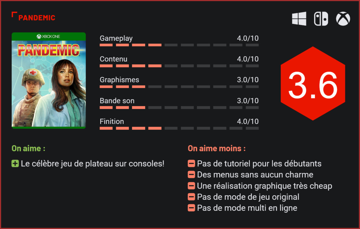 Asmodee porte le plus célèbre jeu de plateau Z-Man en jeu vidéo avec l’espoir de partir à la conquête d’un nouveau public. Pandemic, le jeu vidéo, est toutefois loin d’être à la hauteur. Parmi les jeux de plateau les plus populaires du moment, Pandemic a finalement droit à une adaptation en jeu vidéo sous la direction d’Asmodee Digital. Comme il l’avait fait par le passé avec d’autres classiques du jeu de plateau, Asmodee porte Pandemic en version numérique, sans vraiment prendre de risques au niveau du contenu. L’interface du jeu reste très sobre. Car, n’ayons pas peur de le dire d’entrée de jeu, Pandemic est un portage très paresseux du jeu de plateau. Là où d’autres studios avaient pris le risque de livrer des titres qui s’écartaient du matériau d’origine, à l’image de l’excellent Risk d’Electronic Arts d’il y a une dizaine d’années, Asmodee se contente de nous livrer un portage sans aucune originalité. Le concept n’a pas changé : le joueur doit endiguer plusieurs pandémies en coopérant avec 1 à 3 autres joueurs. En mettant les spécialités de chacun des personnages à contribution (du chercheur au scientifique, en passant par le docteur, présent sur le terrain), le joueur développera vaccins et remèdes, tout en endiguant la propagation des virus. Chaque joueur peut opérer quatre mouvements par tour, en voyageant d’une partie à l’autre de la carte, en inversant des cartes de son jeu ou en accomplissant différentes actions qui lui permettront de se rapprocher de son but. Stressant, le titre est beaucoup plus stratégique qu’il n’y paraît et a surtout été pensé pour être joué en coopération. Dans le fond, le concept n’a pas changé d’un iota dans cette adaptation très fidèle au matériau d’origine. Pandemic a toutefois perdu son âme durant le voyage… Tout d’abord, en terme de visibilité, puisque la carte étant assez grande, la caméra zoomera sur certaines parties du globe et il faudra sans cesse la déplacer pour avoir un aperçu de la situation globale. Pas très pratique, même s’il était difficile de faire autrement. Ensuite, parce que le jeu perd tout son fun en multijoueur, les interactions se faisant à travers un titre numérique et plus autour d’une table. Or, les fans le savent, une grande partie du fun de Pandemic venait justement de ces interactions entre les joueurs et du stress que l’évolution de la pandémie provoquait auprès des joueurs. L’interface aseptisée du jeu ne donne pas vraiment envie de s’y plonger. Les nouveaux venus, qui découvriront Pandemic avec le jeu, auront d’ailleurs bien du mal à se lancer dans l’aventure vu l’absence complète de réel tutoriel. Tout au plus pourront-ils tenter de déduire les règles du jeu des quelques missions qui lui sont confiées dans le mode solo. On zappera d’ailleurs rapidement ce dernier, qui ne présente pas de réel intérêt dans la mesure où le joueur contrôlera ici tous les spécialistes et ne devra plus interagir avec personne d’autre… Beaucoup plus surprenant encore : le jeu ne propose aucun mode multijoueur en ligne. Il faudra en effet se contenter d’un mode multi en local uniquement – forcément moins convivial que le jeu de plateau réel. Un choix très surprenant dans la mesure où cette version numérique du jeu avait pour principal intérêt de permettre au joueur d’affronter ses amis en ligne… Avare en contenu, le jeu d’Asmodee aura donc bien du mal à séduire les gamers. D’autant plus que sa réalisation est loin d’être à la hauteur de nos attentes avec un univers graphique et sonore très fades, dans la droite lignée des autres productions du studio. C’est d’autant plus regrettable que le jeu est vendu 19,99€ tout de même. Bonne nouvelle toutefois : le contenu du jeu devrait évoluer. Les développeurs promettent l’ajout d’au moins un nouveau mode de jeu. Aucun mode en ligne ne serait toutefois au programme à l’heure d’écrire ces lignes… Conclusion Difficile de comprendre ce qui a bien pu passer par la tête d’Asmodee dans ce portage de l’excellent jeu de plateau “Pandemic”, dépourvu de modes de jeu en ligne et de tutoriel. Les nouveaux venus auront bien du mal à comprendre les règles complexes du jeu sans passer par un tutoriel en ligne. Les habitués regretteront l’absence d’un mode en ligne – pourtant seul intérêt de ce portage. Avare en contenu, mal-fignolée et finalement très mal réalisée, cette adaptation de Pandemic est malheureusement loin d’être à la hauteur de nos attentes. Seule bonne nouvelle : le jeu est compris dans l’abonnement GamePass de Microsoft.