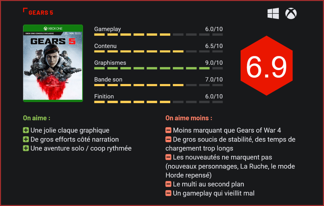 Attendu au tournant, le nouveau volet de la franchise Gears of War devait donner à la série de Microsoft une nouvelle direction. Le résultat est-il à la hauteur de l’attente suscitée par le jeu? L’année 2019 n’aura décidément pas été un grand cru pour Microsoft. Non seulement l’éditeur n’a livré presqu’aucune exclusivité, mais en plus la seule tête d’affiche de 2019 (Crackdown 3) a reçu un accueil glacial. Gears 5 se devait donc de marquer le coup. Avec les développeurs de The Coalition aux commandes – lesquels avaient déjà œuvré sur le quatrième volet de la franchise -, Microsoft Games ne prenait pratiquement aucun risque. L’éditeur a pourtant choisi de donner une nouvelle direction à sa série, allant jusqu’à la renommer et à changer intégralement son casting. Pas sûr que les fans en soient ravis, car ce bon vieux Marcus Phoenix, s’il apparaît encore en guest, nous manque furieusement. Cette fois, toute l’aventure tourne autour de Kait. Avec Gears of War 4 déjà, Microsoft avait entamé un changement radical de direction, allant beaucoup plus loin qu’Epic Games dans la narration et revoyant partiellement le casting de son jeu. Gears 5 va encore plus loin puisqu’il se concentre sur une nouvelle génération de Gears et s’intéresse en particulier à Kait, dont nous avions fait la rencontre dans le précédent volet. On le sent dès les premières minutes de jeu, de très gros efforts ont été consentis au niveau de la narration pour rendre le jeu plus accrocheur, mais la formule ne fonctionne qu’à moitié, la faute à un casting justement beaucoup moins sexy que les anciens volets et une histoire artificiellement complexe. Gears a certes gagné en maturité, s’écartant du scénario badass, mais le jeu a également perdu une partie de ce qui faisait son charme. Beaucoup plus politiquement correct que ses ancêtres, Gears 5 se prend un peu trop au sérieux. Son intrigue, artificiellement complexe, reste également très prévisible. On apprécie en revanche la profondeur que The Coalition a tenté de donner à certains de ses personnages… La campagne de Gears 5 vous fera voir du pays. Côté gameplay, il ne faut pas s’attendre à de grands chambardements. Gears 5 est dans la continuité directe de Gears of War 4. Quelques petites nouveautés font toutefois leur apparition, à l’image des séquences de jeu en “open-world”, dans des niveaux plus vastes qui permettent au joueur d’explorer une ville et de se lancer, pour la première fois dans la série, dans des missions secondaires. Dans la pratique, ces séquences de jeu n’apportent toutefois rien de plus à l’univers de Gears of War, qui n’était très clairement pas un jeu pensé à la base pour proposer de l’open world. Le constat est donc très mitigé, d’autant plus que le rythme de jeu en prend un sacré coup. Pour apporter une touche de fraîcheur à la série, The Coalition a rendu le petit robot Jack jouable cette fois en coop’. Celui-ci se dirige radicalement différemment des Gears puisqu’il sera principalement question de supporter les fantassins en passant à travers les lignes ennemies grâce au talent d’invisibilité et en les prenant à revers, en faisant diversion. Grâce à un arbre de compétences, les joueurs pourront améliorer le robot, qui pourra ainsi soigner les Gears, les protéger des flammes en les aspergeant d’un spray, poser des pièges et électrifier des ennemis. La mécanique est intéressante et apporte un changement radical dans le gameplay, mais encore faut-il trouver un autre joueur qui souhaite l’incarner. Car comme nous l’avons dit plus haut, jouer Jack est radicalement différent au niveau de l’expérience de jeu, beaucoup plus axée sur l’infiltration. Pas sûr donc que tout le monde adhère au concept. Pour le reste, Gears 5 reprend à l’identique la formule de son ancêtre, enchaînant assauts groupés, combats au corps à corps avec l’incontournable tronçonneuse, combats de boss et séquences à bord de différents véhicules sans jamais nous lasser. Globalement, le jeu est toutefois plus lent que son ainé, de par l’ajout des séquences de jeu en monde ouvert et des plus nombreux dialogues. La plupart des séquences de jeu musclées à bord de véhicules ont également été remplacées par des séquences de jeu plus zens aux commandes du Skeef, une sorte de traineau – kite-surf futuriste qui vous servira à vous déplacer dans les vastes zones ouvertes. Le skeef est le vaisseau qui vous permettra de parcourir les quelques zones ouvertes du jeu. On retiendra de la campagne une belle diversité au niveau des (superbes) décors traversés, des boss bien costauds et quelques séquences de jeu nerveuses. Force est de constater toutefois qu’en terme de divertissement, Gears 5 nous a légèrement moins emballé que son ainé. Le gameplay de la série a toutefois pris un sacré coup de vieux. Car c’est un fait, si la formule fonctionne toujours en solo, elle montre très vite ses limites, surtout en multijoueur. C’est le gros problème des cover-shooters en vue à la troisième personne, les affrontements ont tendance à rester très fixes. A l’inverse d’un FPS dans lequel les joueurs peuvent être très mobiles. En solo comme en multi les joueurs passeront la plupart de leur temps à se planquer derrière de gros blocs en béton armée ou des obstacles renversés, à l’abris des balles. The Coalition a certes tenté de changer un peu la recette en intégrant des mouvements spéciaux qui permettent d’attraper un ennemi qui se rapproche ou de se jeter dessus, mais ceux-ci restent sous-utilisés par les joueurs. C’est un fait, Gears of War souffre d’un gameplay vieillissant, qui n’a jamais su se renouveler. Il n’y a pas de glissades, la course se fait toujours au raz du sol et le jeu est toujours régi par les mêmes mécanismes. En multijoueur, le camping fait même part