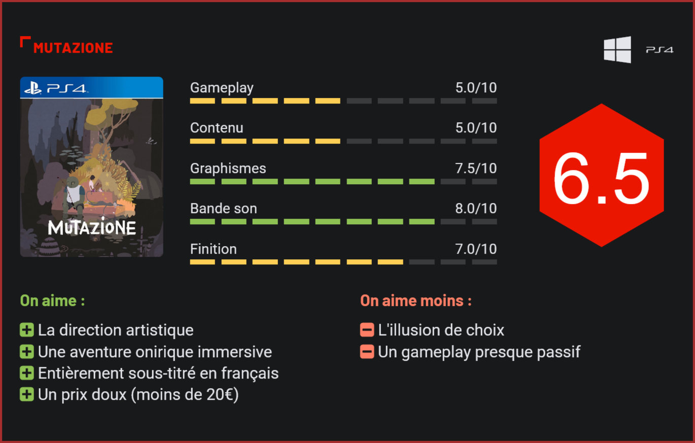 Développé par une petite équipe de développeurs, Mutazione est un jeu narratif à la direction artistique bien personnelle. Bien loin des expériences vidéoludiques traditionnelles, le titre de Die Gute Fabrik a de quoi charmer. Mutazione propose peut d’interaction avec les décors et peu de gameplay de manière générale. Mutazione est un jeu narratif dans lequel on incarne Kai, une jeune fille fraîchement débarquée sur une île mystérieuse dans le but de venir au chevet de son grand-père souffrant, Nonno. Sur cette île coupée du monde après le passage d’une comète qui a provoqué la mutation des habitants, Kai part à la rencontre des autochtones et se familiarise avec la faune et la flore locale. Une aventure onirique à travers laquelle le joueur découvrira l’histoire personnelle des habitants, ainsi que les secrets de la famille de Kai et le lien profond que la jeune fille partage avec l’île. « Un feuilleton mutant où les potins d’une petite ville rencontrent le surnaturel », c’est ainsi que l’éditeur Akupara Games décrit le titre de Die Gute Fabrik. Quelques mots qui donnent le ton de l’aventure que propose Mutazione. Les histoires des villageois de Mutazione tiennent effectivement une place importante dans le jeu. Elles sont le fil conducteur qui mènera Kai à travers l’île et son histoire, mais aussi à s’interroger sur les événements surnaturels auxquels elle assiste. L’aventure sur Mutazione flirte avec le surnaturel. Grâce à une construction intelligente et captivante, le joueur se laisse facilement embarquer dans cette aventure narrative emplie de mystères. Le jeu s’écarte rapidement de la raison pour laquelle Kai s’est retrouvée sur cette île pour nous plonger dans un voyage initiatique. Venue renouer des liens avec son grand-père mourant, la jeune adolescente va surtout en apprendre davantage sur l’histoire de sa famille représentée par une sorte d’oiseau effrayant. Les autochtones de l’île Mutazione sont étranges suite au passage d’une comète. On se laisse porter par le récit des habitants et les découvertes que Kai fait à propos de sa propre histoire. Mutazione se veut immersif et y arrive parfaitement. Une immersion aidée par le carnet de notes de Kai dans lequel on peut lire les pensées de l’adolescente. L’aspect narratif prend d’ailleurs le pas sur le gameplay qui est presqu’inexistant. On ne fait que balader Kai aux quatre coins de l’île sans pouvoir réellement interagir avec l’environnement. Entre deux dialogues, le joueur peut parfois récolter quelques objets ici et là, ainsi qu’interagir avec des “points d’intérêts” qui lui permettent simplement d’admirer un paysage ou un élément de décors plus ou moins intéressant. Le joueur doit créer des mélodies en cultivant des plantes et des fleurs. L’aspect vidéoludique le plus intéressant de Mutazione repose sur les jardins. En effet, à plusieurs endroits, Kai peut cultiver un jardin grâce aux graines qu’elle a récoltées en se promenant sur l’île. Plus qu’une simple culture, les jardins se veulent musicaux. Le joueur devra mélanger différentes plantes et fleurs pour trouver la bonne mélodie qui répondra aux besoinx du personnage. Une expérience reposante et intéressante qui correspond parfaitement à l’ambiance si particulière de Mutazione. Ici, ce qui parait étrange – les mutations des habitants – est normal, les choses sont comme elles sont. Le titre propose également au joueur d’agir sur les dialogues de Kai avec les autochtones. À divers moments, il pourra choisir la réponse à donner à l’interlocuteur. Une proposition sympathique sur le papier qui ne semble pourtant pas avoir de réelle conséquence sur l’histoire ni sur les relations de Kai avec ses interlocuteurs. Ces choix illusoires semblent tout de même influencer la personnalité que renvoie Kai ; plus enjouée ou plus froide. L’esthétique de Mutazione est très particulière. Avec son esthétique si particulière et ses personnages atypiques, Mutazione rompt avec les jeux vidéo traditionnels pour nous plonger dans le voyage initiatique de Kai. Une quête qui sera soulignée par l’ambiance générale de l’île. Proposant une direction artistique en 2D propre, Mutazione prend vie dans des décors colorés et charmants. Le tout est parfaitement cadré par une ambiance musicale tout aussi onirique et mystérieuse que l’aventure que le jeu propose. Comme nous l’avons déjà expliqué, la musique tient d’ailleurs une place importante dans le jeu puisque Kai utilise ses connaissances en herboristerie transmises par son grand-père pour faire pousser des plantes qui, à terme, joueront de la musique. Dans Mutazione, la musique est salvatrice. Conclusion Mutazione joue la carte du jeu narratif en profondeur en mettant de côté tout ce qui est gameplay, sans pour autant se transformer en un visual-novel ni rendre le joueur passif. Plongé au coeur d’un voyage initiatique, le joueur sera amené à discuter avec les différents habitants de l’île de Mutazione et à découvrir cet univers fantastique. Il se laissera porter par les différentes histoires des autochtones et la quête de réponse de la jeune Kai. Une quête personnelle parfaitement cadrée par une direction artistique personnelle, jolie et charmante. Bref, l’une des belles surprises de cette rentrée.