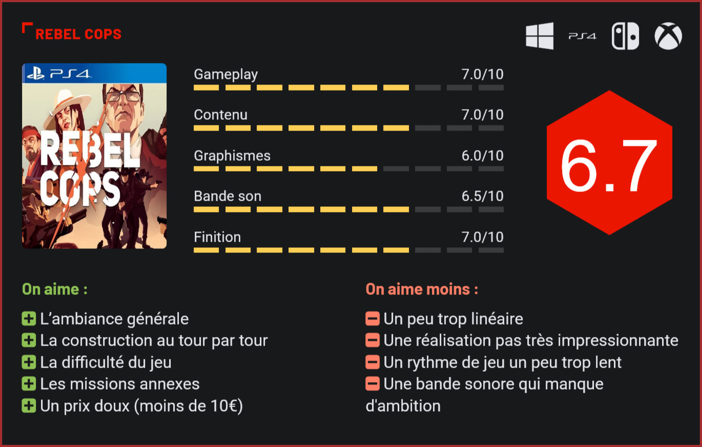 Tiré de l’univers de This is The Police, Rebel Cops laisse de côté la gestion pour se concentrer sur l’aspect stratégique au tour par tour. Weappy Studio a-t-il fait le bon choix ? Le côté obscur est le bon côté La ville de Ripton est la proie d’une organisation criminelle très développée avec à sa tête, le baron de la pègre Viktor Zuev. Lui et ses hommes contrôlent tous les aspects de la ville, du petit coiffeur aux policiers. Les seuls qui tiennent tête à Zuev et ses hommes de main sont d’anciens flics, prêts à en découdre avec les malfrats. Le principe de Rebel Cops est assez simple, le joueur contrôle les policiers dans leur combat contre le crime. Ils vont devoir démasquer les complices de Zuev et remonter la piste qui les mènera jusqu’à lui. Pour cela, le joueur va devoir réussir diverses missions d’infiltration plus ou moins périlleuses et éliminer ou arrêter les hommes de main de Zuev tout en évitant de passer du côté obscur. Progression discrète au tour par tour Pour ce spin-off de la série This is the Police, le studio biélorusse Weappy a laissé de côté la gestion pour se concentrer sur la stratégie au tour par tour. À travers les différentes missions, le joueur devra décider des mouvements et actions que les policiers feront durant leur tour afin de se rapprocher des malfrats et arriver à les appréhender. Pour y arriver, le joueur devra prendre tout un tas d’éléments en compte pour progresser, mais aussi pour éviter que des innocents ne soient tués. Ainsi, il devra s’arranger pour contourner certains obstacles ou au contraire les utiliser à son avantage pour approcher des criminels et les braquer avec un pistolet. S’ils se font repérer, ils seront des cibles faciles. Si certaines blessures peuvent être soignées, une balle dans la tête sera fatale aux hommes de loi. Peu de munitions et une réputation à tenir Avant chaque mission, le joueur pourra préparer sa stratégie. Depuis le menu des missions, il pourra composer son escouade et attribuer les armes, munitions, trousses de soins et autres objets à ses hommes. Mais les munitions et armes sont chères à Ripton. Les rebelles peuvent compter sur les petites économies des habitants de la ville pour se procurer de l’équipement. En fonction des succès et défaites, les prix affichés par le commerçant seront plus ou moins accessibles. En effet, la réputation des policiers aura un impact important sur l’aventure. Mener ses missions à bien sera primordial pour pouvoir s’offrir des munitions et armes, mais il faudra également éviter d’en abuser sur le terrain. Le joueur pourra tout de même récolter un peu d’équipement sur la carte, mais cela gaspillera un tour de jeu à un personnage. Il faudra prendre cela en compte pour mener à bien les missions. À d’autres moments, le joueur n’aura pas le choix d’explorer la carte pour récupérer des indices et avancer. Cette contrainte de l’équipement et le petit nombre de rebelles prêts à repousser les malfrats pousseront le jouer à faire preuve de discrétion et de stratégie dans ses déplacements, quitte à suivre un chemin plus long. Si les rebelles se font repérer, les hommes de Zuev sonneront l’alarme et toute la cavalerie débarquera alors, rendant la tâche des gentils impossible, voire mortelle. C’est pourquoi l’utilisation de la matraque, du taser et couteau sera parfois plus intéressante que l’arme à feu plus bruyante. Or, pour pouvoir utiliser ses armes non létales, les policiers devront être proches des criminels. Une fois à proximité des malfrats, le joueur pourra choisir son attaque via une roue d’actions relativement riche. Le joueur pourra ainsi opter pour un coup sur la tête ou une électrocution pour immobiliser les malfrats durant un temps limité. Il faudra donc prendre cet aspect en compte lors des calculs d’infiltration. Vaut-il mieux tuer le criminel et sonner l’alarme ou l’assommer et risquer qu’il se réveille avant qu’on ait arrêté tout le monde ? En plus de la mission principale, Rebel Cops propose aux joueurs de remplir des objectifs secondaires. Des défis qui viennent apporter un peu de dynamisme et d’excitation à la partie qui peut paraître parfois un peu trop linéaire. Ces missions annexes seront tout de même à double tranchant. En effet, à trop en vouloir en faire, on peut se perdre. Ainsi, si le joueur n’arrive pas à atteindre les objectifs secondaires, la réputation des Rebel Cops auprès de la population peut rapidement diminuer et donc faire augmenter le prix des munitions et armes à feu. La stratégie se retrouve à tous les niveaux. Le shérif est dans la ville Pour ce spin-off, Weappy Studio a réutilisé l’esthétique si particulière des This is the Police. Un univers de bande dessinée pour adulte en vue aérienne aux décors très variés et colorés. Tantôt désertique, tantôt enneigé, la ville de Ripton transpire le petit village reculé américain supervisé par le shérif et ses cowboys. Malgré une progression en tour par tour très carrée, les animations des personnages sont très réussies. L’univers de Rebel Cops respire la vie grâce notamment à des animations météorologiques sympathiques. Le jeu est toutefois loin d’être une claque graphique et transpire la petite production. Enfin, le jeu diffuse une musique d’ambiance qui colle parfaitement au cadre. On notera également les quelques mimiques vocales des Rebels Cops qui se parlent au talkie-walkie avec un accent américain plus vrai que nature, au point qu’on se sentirait presque transporté au fin fond du Texas. Conclusion Reprenant le même univers que ses deux précédents volets – This is the Police 1 et 2 -, Weappy livre un spin-off centré sur l’aspect stratégique au tour par tour. Une orientation que le studio biélorusse réalise avec brio, offrant une aventure qui fera appel à toute la stratégie des joueur