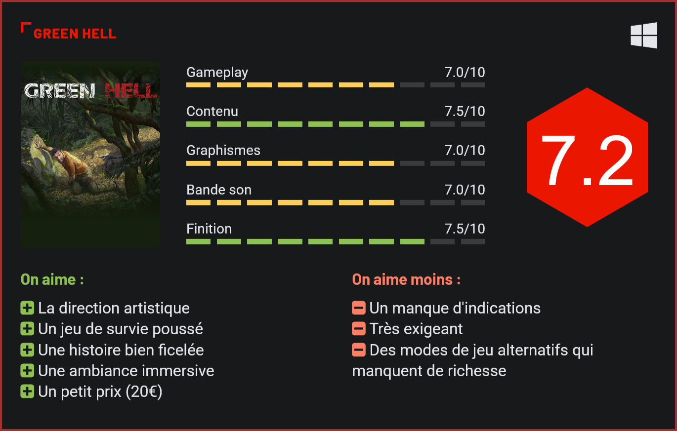 Un an après l’accès anticipé, le studio polonais Creepy Jar livre enfin Green Hell dans sa version finale. Une sortie officielle qui introduit un mode histoire. Une nouveauté de taille pour ce jeu de survie, même s’il fallait encore que celui-ci se révèle intéressant. Il aura fallu se montrer patient pour découvrir Green Hell dans sa globalité. Sorti en accès anticipé au mois d’août 2018, ce n’est qu’en septembre 2019 que Creepy Jar livre sa création terminée. Une version finale qui devait également marquer la sortie du jeu sur consoles de salon, mais le studio polonais semble avoir pris du retard. Le portage sur PS4 et Xbox One est désormais prévu pour début 2020, si tout se passe bien. Un mode coopératif jusqu’à 4 joueurs est également au programme. Il devrait débarquer sur PC d’ici la fin de l’année. Entrons dans le vif du sujet. Le titre de Creepy Jar est un jeu de survie à la première personne qui prend vie au cœur de la forêt amazonienne. Un cadre à la fois magnifique et inquiétant puisque la nature se révélera aussi dangereuse que belle. Et la nature ne sera pas la seule menace. À l’image des films Cannibal Holocaust et The Green Inferno, le joueur fera rapidement connaissance avec la population locale, des indigènes plutôt inamicaux. Bienvenue en enfer Le titre nous fait incarner un anthropologue fraîchement débarqué sur une rive de la forêt amazonienne avec sa femme, également anthropologue et spécialiste des langues amérindiennes. Leur objectif est d’entrer en contact avec la tribu Waraha, l’une des dernières civilisations encore à l’état « sauvage ». Une tâche que Mia réussit contrairement à Jake qui ne s’est pas fait accepter par la tribu. Ils se retrouvent donc séparés. Suite à un appel inquiétant de Mia, Jake est pris de panique et tente de la retrouver, mais chute brutalement et tombe dans les pommes. À son réveil – difficile –, la survie de Jake commence. Perdu dans la forêt amazonienne, sans aucun équipement en dehors de son talkie-walkie et de sa montre intelligente, Jake va devoir apprendre très rapidement à se servir de son environnement pour survivre tout en s’en méfiant. Dans sa situation, un mauvais fruit ou une mauvaise blessure peuvent avoir des conséquences funestes. Survivre et retrouver Mia seront les leitmotivs de l’aventure de Green Hell. Le joueur devra à la fois se concentrer sur le bien-être physique et mental de Jake et sur sa quête pour retrouver sa femme, Mia. C’est en progressant dans la forêt que le joueur va découvrir à quel point la nature peut être hostile et dangereuse, mais aussi, les hommes. L’emboîtement de la survie et de la quête de Jake porte parfois préjudice au jeu. En effet, les besoins de Jake sont nombreux et ses ressources s’épuisent rapidement ce qui ralentit régulièrement la recherche de Mia. De plus, le scénario ne se lance qu’à certaines conditions qui ne sont pas forcément bien indiquées. Autrement dit, il peut être compliqué de progresser dans l’histoire. Les amateurs des jeux de survie non scénarisés ne devraient pas s’en plaindre, mais c’est tout de même dommage de ne pas avoir fait passer l’histoire comme leitmotiv principal pour le mode campagne. Une survie compliquée par de nombreux besoins Que ça soit en mode campagne ou survie, l’aventure débute de la même manière. Une mise en bouche qui introduit le contexte du jeu et qui sert également de tutoriel. L’occasion d’assimiler les bases du jeu, notamment les déplacements, les mécanismes de collectes et de fabrications d’objets, essentiels à la survie dans cet environnement hostile. Le jeu repose d’ailleurs énormément sur ces deux derniers aspects ; la collecte et la fabrication d’objets. Pour survivre, le joueur devra faire attention à la santé physique et mentale de son héros, mais aussi veiller à ce qu’il soit bien préparé et équipé pour faire face aux dangers de la forêt amazonienne. Il lui faudra donc récolter divers ingrédients (branches, feuilles, pierres, etc.) et se fabriquer des abris ou des armes. En parallèle, il faudra également porter une attention particulière à la faim et la soif de Jake. Heureusement, la forêt amazonienne regorge de plantes, fruits, bestioles et de rivières, mais tout ne sera pas bénéfique pour Jake. Or, le jeu laisse le joueur dans le même état d’ignorance que son héros concernant les bienfaits ou non des aliments. Pour savoir ce qui est bon, il devra les ingurgiter et malheureusement, parfois – souvent – certaines denrées auront des effets secondaires mortels. Il faudra parfois procéder à une préparation pour rendre des aliments consommables. Par exemple, faire chauffer de l’eau brunâtre pour la rendre potable, cuire la viande pour tuer les bactéries, etc. Des étapes qui demanderont des construction de la part de Jake et qui pourront être ralenties par la météo. En effet, en cas de pluie ou de vent, le feu peut s’éteindre et rendre la purification de l’eau ou de la nourriture impossible. Une fois qu’un aliment a été goûté, ses bienfaits nutritionnels s’afficheront désormais à chaque fois que Jake en mangera. Une bonne chose puisque Green Hell pousse le vice du jeu de survie à l’extrême. En effet, il ne faudra pas simplement donner des bons aliments au personnage, mais il faudra surtout faire attention aux valeurs nutritionnelles de ceux-ci. Protéines, glucides, lipides, tout y passe pour rendre la tâche plus compliquée au joueur. Celui-ci devra contrôler régulièrement la smartwatch de Jake pour connaitre son état de satiété, ainsi que son taux de glucide ou protéines. En cas de carence, le personnage sera plus vite fatigué ou plus instable mentalement. Une fatigue physique et mentale Comme nous l’avons déjà évoqué, la faim, la soif et la fatigue ne seront pas les seuls éléments à prendre en compte pour la su